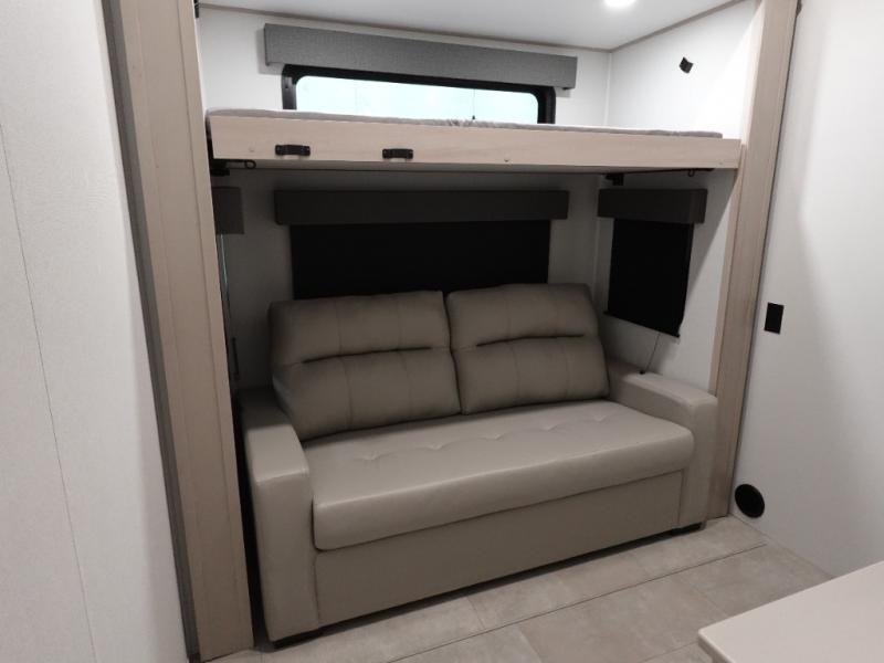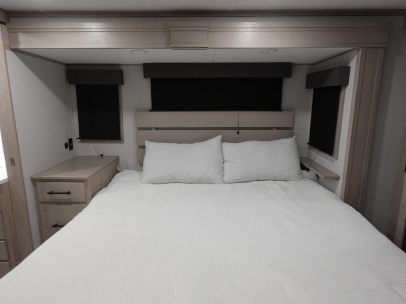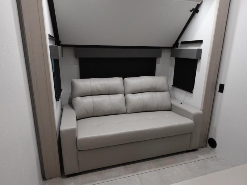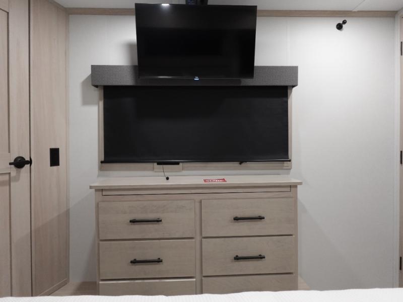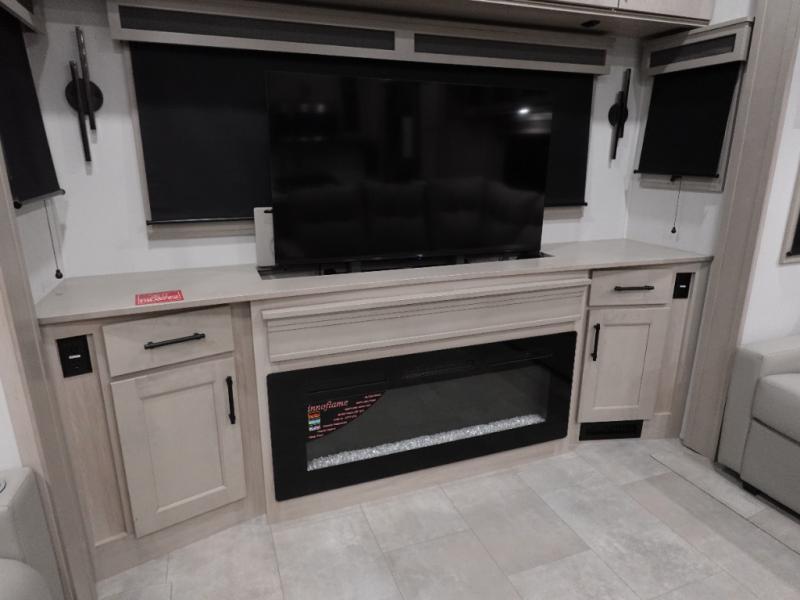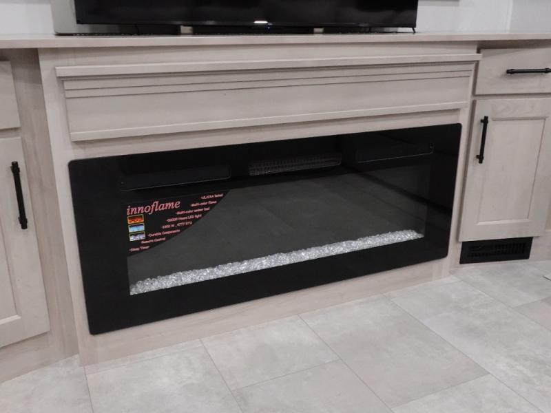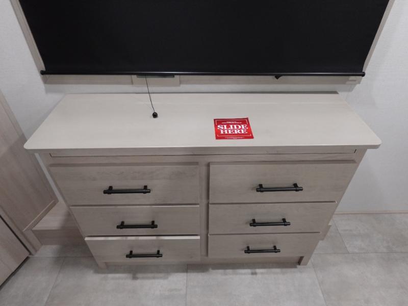 The whole gang will love camping in this spacious fifth wheel for five to six! You'll have your own bedroom up front with a bed slide out, a large front closet with a hamper and washer and dryer prep, plus a private entry door into the dual entry bath. Your guest can take the middle bedroom that includes a tri-fold sofa with a bunk above, a dresser/desk, plus a 50" TV for entertainment. A full kitchen includes an L-shaped counter, a 20 cu. ft. refrigerator, pull-out trash cans plus many more convenient features. And don't overlook the rear living area with its L-shaped sofa, theater seating, and free-standing dinette. There is also an entertainment center with a telescoping TV and a fireplace plus an electronics drawer to charge your phone or laptop.
