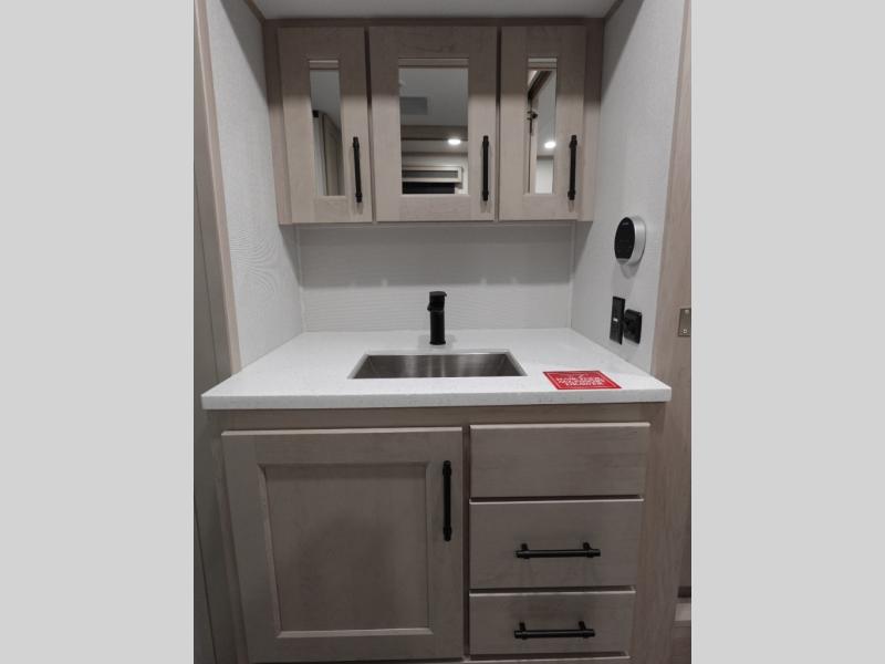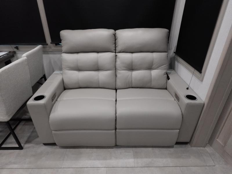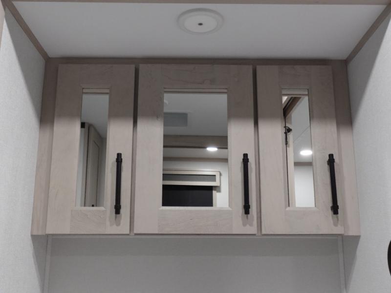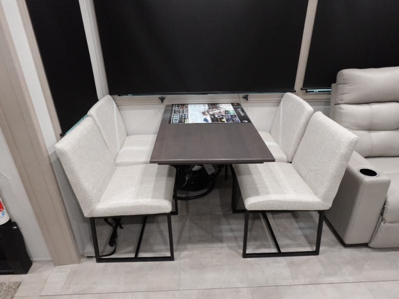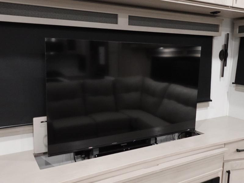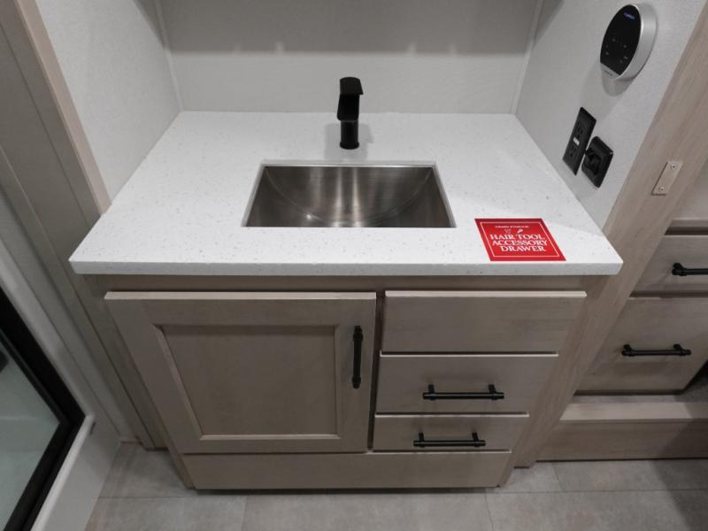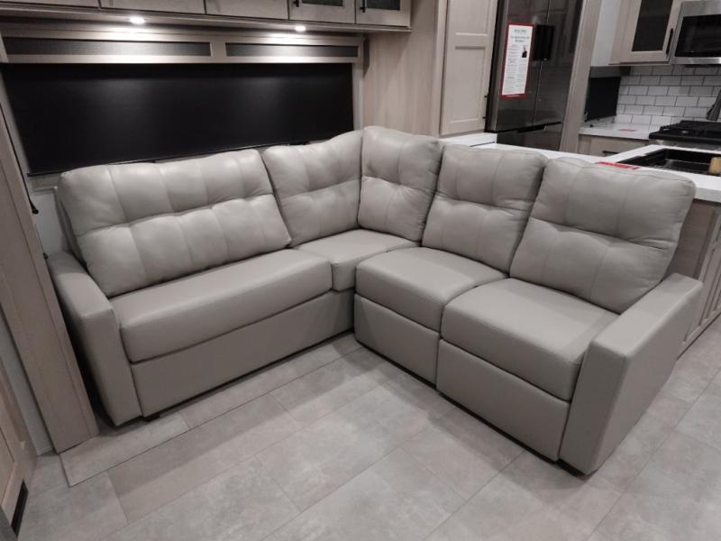 The whole gang will love camping in this spacious fifth wheel for five to six! You'll have your own bedroom up front with a bed slide out, a large front closet with a hamper and washer and dryer prep, plus a private entry door into the dual entry bath. Your guest can take the middle bedroom that includes a tri-fold sofa with a bunk above, a dresser/desk, plus a 50" TV for entertainment. A full kitchen includes an L-shaped counter, a 20 cu. ft. refrigerator, pull-out trash cans plus many more convenient features. And don't overlook the rear living area with its L-shaped sofa, theater seating, and free-standing dinette. There is also an entertainment center with a telescoping TV and a fireplace plus an electronics drawer to charge your phone or laptop.