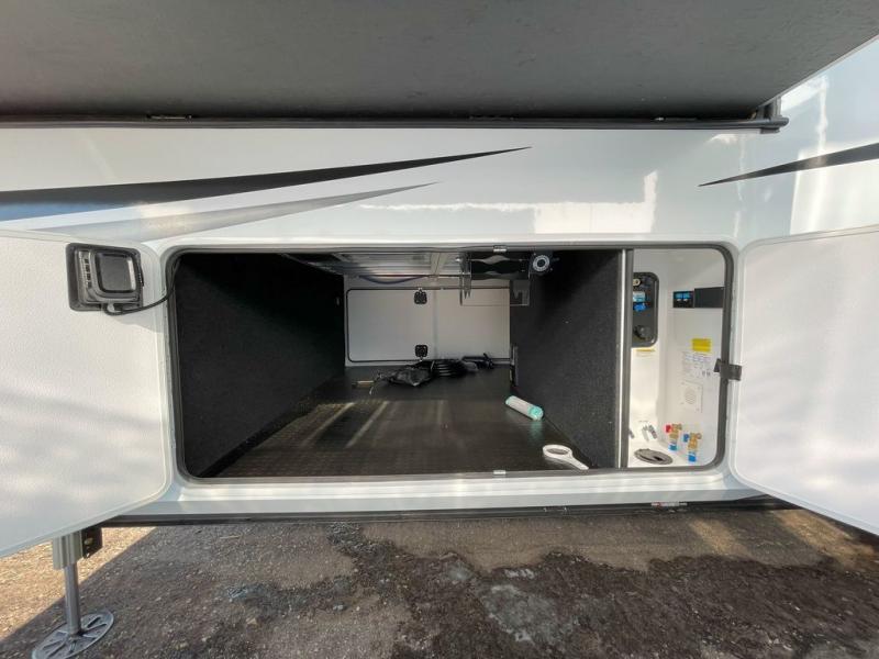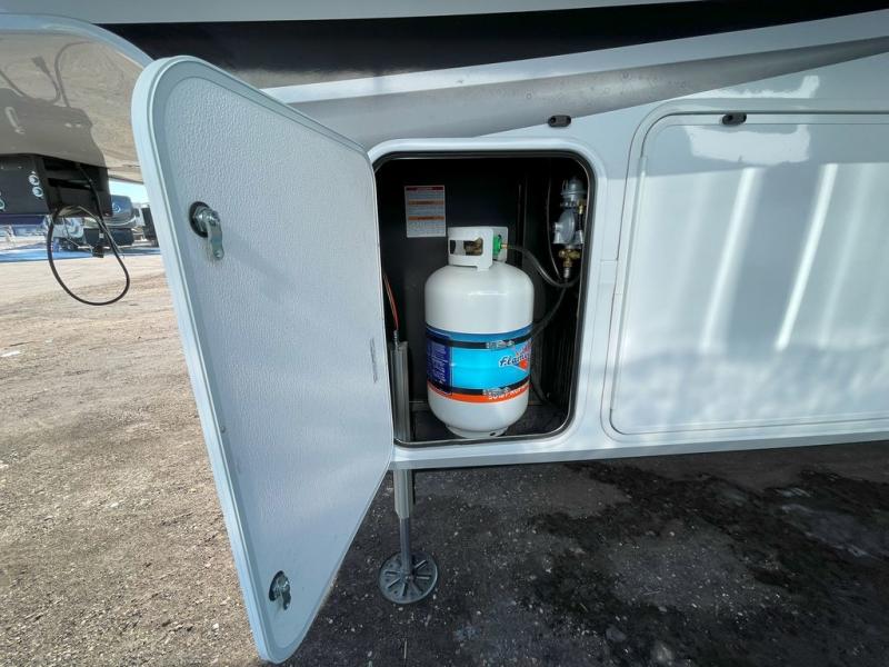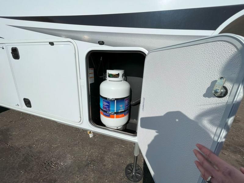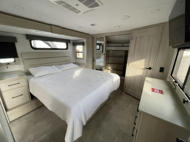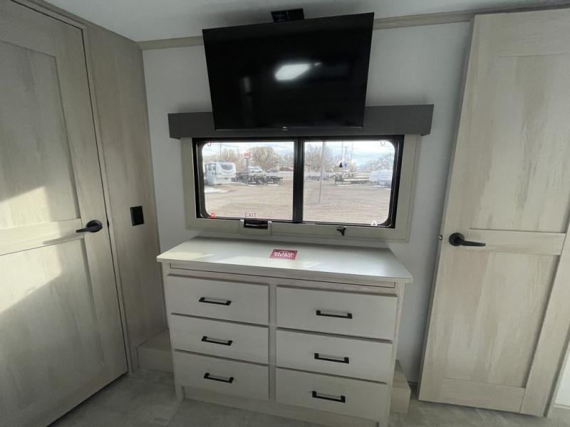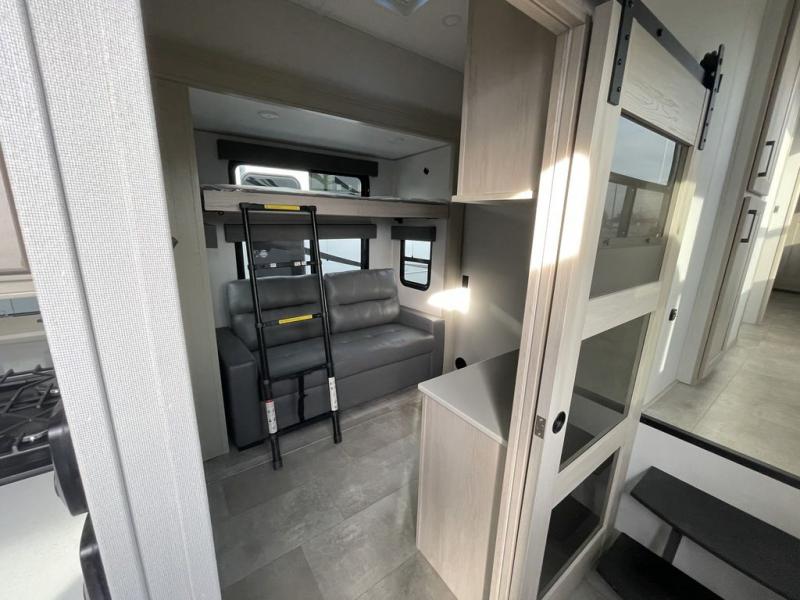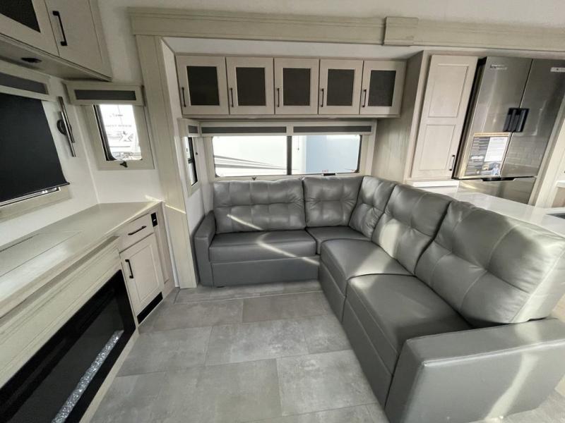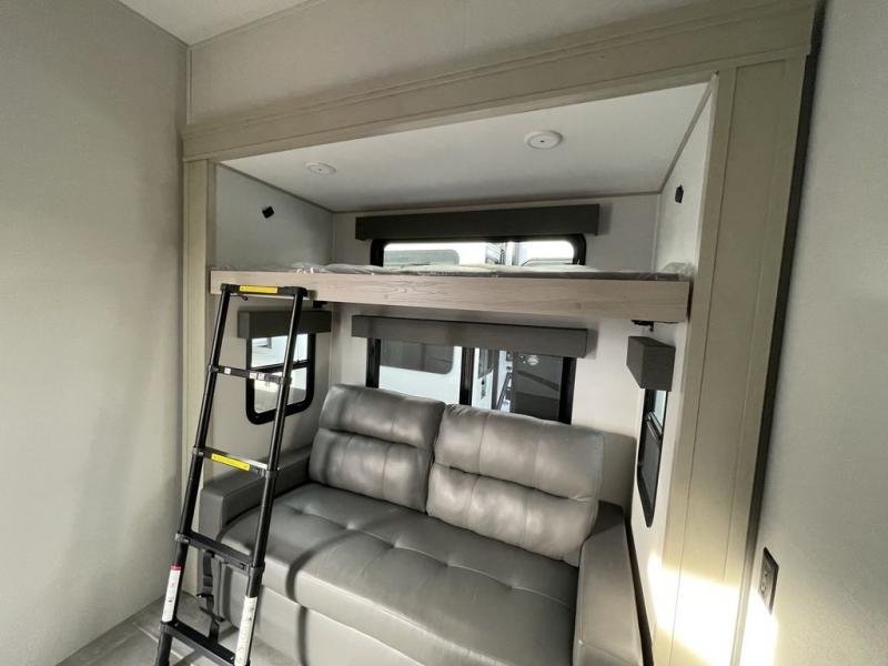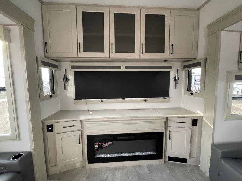 The whole gang will love camping in this spacious fifth wheel for five to six! You'll have your own bedroom up front with a queen bed slide out, a large front closet with a hamper and washer and dryer prep, plus a private entry door into the dual entry bath. Your guest can take the middle bedroom that includes a tri-fold sofa with a bunk above, a dresser/desk, plus a 50" TV for entertainment. A full kitchen includes an L-shaped counter, a 20 cu. ft. refrigerator, pull-out trash cans plus many more convenient features. And don't overlook the rear living area with its L-shaped sofa, theater seating, and free-standing dinette. There is also an entertainment center with a telescoping TV and a fireplace plus an electronics drawer to charge your phone or laptop.