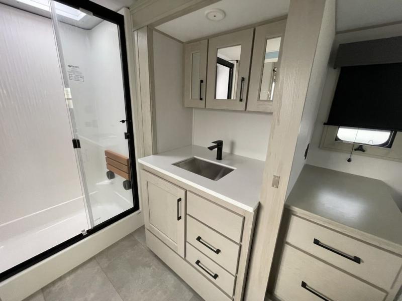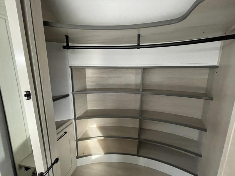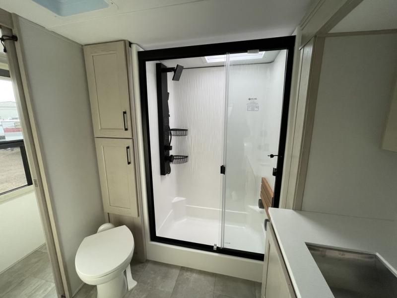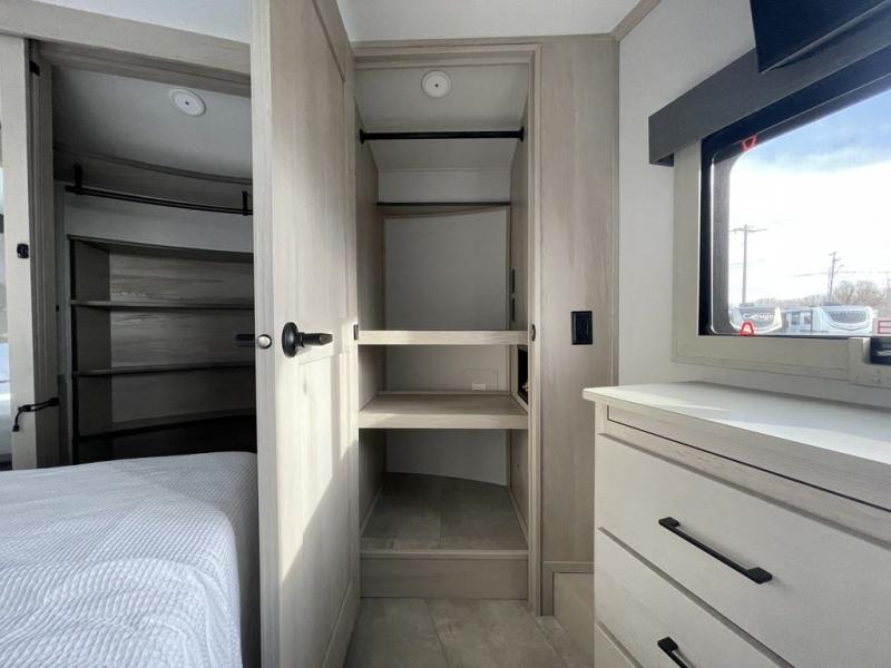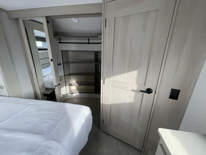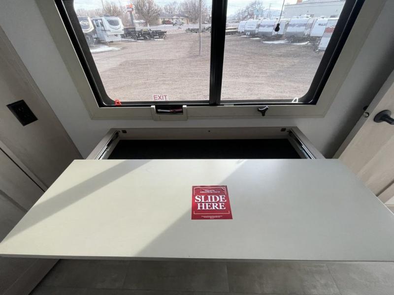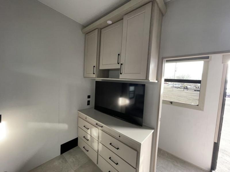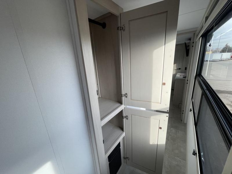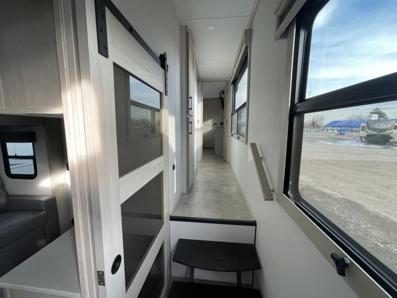 The whole gang will love camping in this spacious fifth wheel for five to six! You'll have your own bedroom up front with a queen bed slide out, a large front closet with a hamper and washer and dryer prep, plus a private entry door into the dual entry bath. Your guest can take the middle bedroom that includes a tri-fold sofa with a bunk above, a dresser/desk, plus a 50" TV for entertainment. A full kitchen includes an L-shaped counter, a 20 cu. ft. refrigerator, pull-out trash cans plus many more convenient features. And don't overlook the rear living area with its L-shaped sofa, theater seating, and free-standing dinette. There is also an entertainment center with a telescoping TV and a fireplace plus an electronics drawer to charge your phone or laptop.