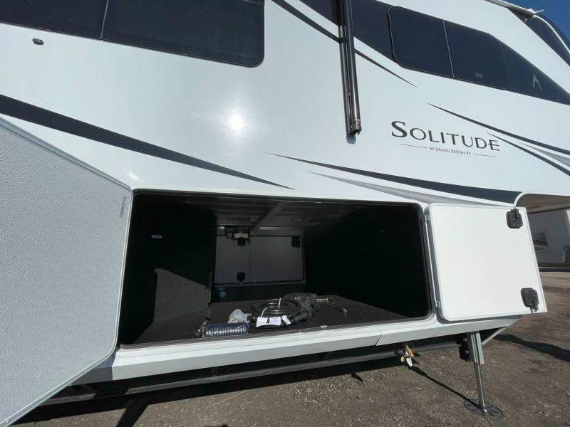 Each Solitude fifth wheel by Grand Design features a 101" wide-body construction, heavy duty 8,000 lb. axles, frameless tinted windows, and high-gloss gel coat sidewalls. You can camp year around thanks to the Weather-Tek Package that includes a 35K BTU high-capacity furnace, an all-in-one enclosed and heated utility center, and a fully enclosed underbelly with heated tanks and storage. Inside, you'll love the premium roller shades, hardwood cabinet doors, solid surface countertops, plus residential finishes throughout to make you truly feel at home. Each model also includes a MORryde CRE3000 suspension system, self adjusting brakes, and a MORryde pin box that will provide smooth towing from home to campground. Affordable luxury is possible with the Solitude fifth wheels; choose yours today!