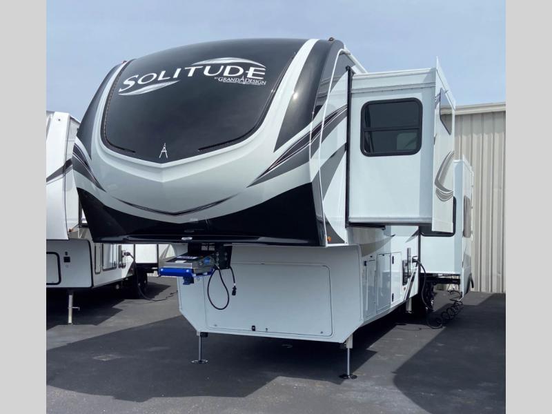 Each Solitude fifth wheel by Grand Design features a 101" wide-body construction, heavy duty 8,000 lb. axles, frameless tinted windows, and high-gloss gel coat sidewalls. You can camp year around thanks to the Weather-Tek Package that includes a 35K BTU high-capacity furnace, an all-in-one enclosed and heated utility center, and a fully enclosed underbelly with heated tanks and storage. Inside, you'll love the premium roller shades, hardwood cabinet doors, solid surface countertops, plus residential finishes throughout to make you truly feel at home. Each model also includes a MORryde CRE3000 suspension system, self adjusting brakes, and a MORryde pin box that will provide smooth towing from home to campground. Affordable luxury is possible with the Solitude fifth wheels; choose yours today!