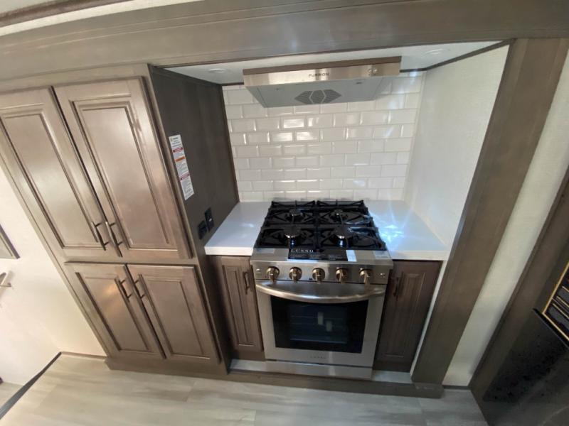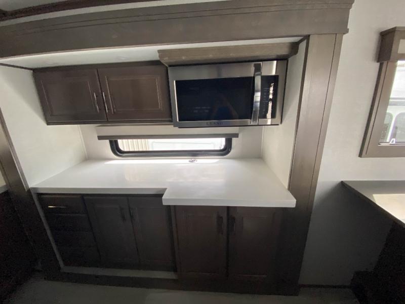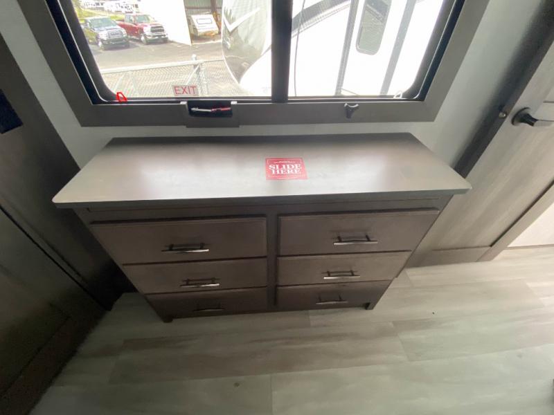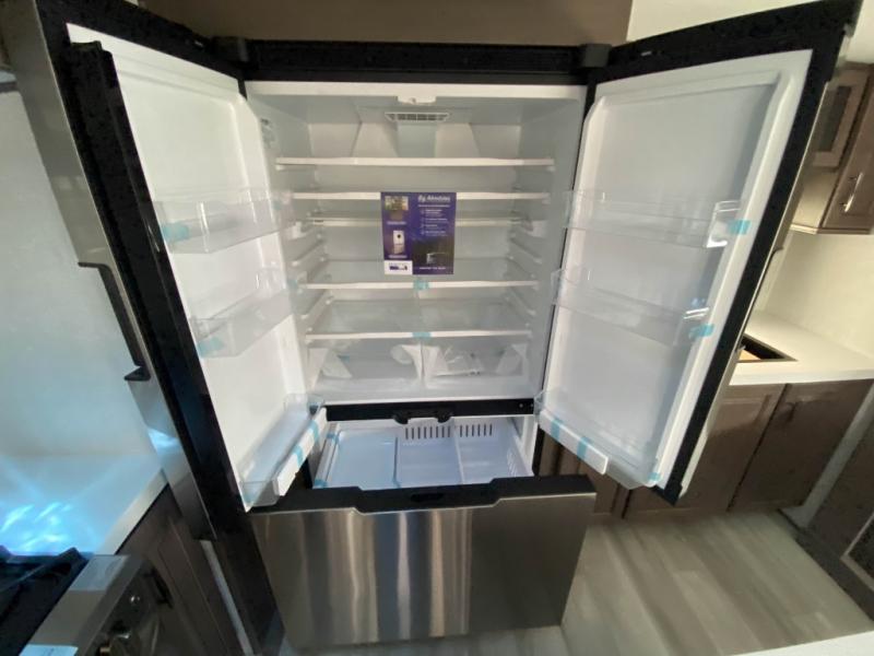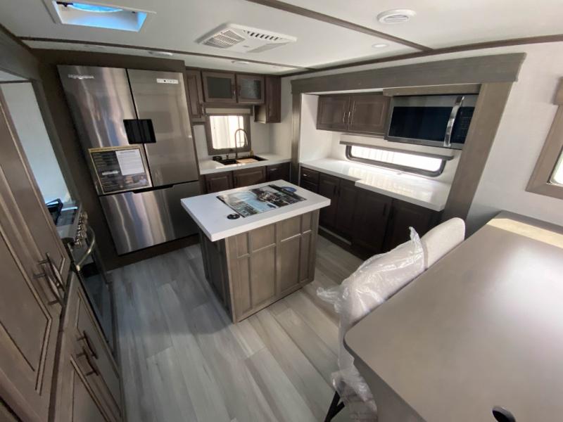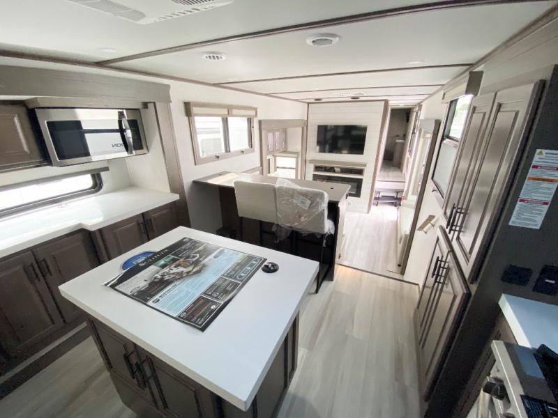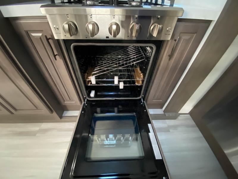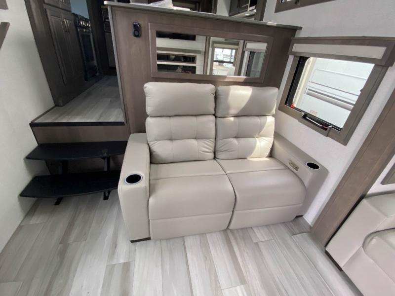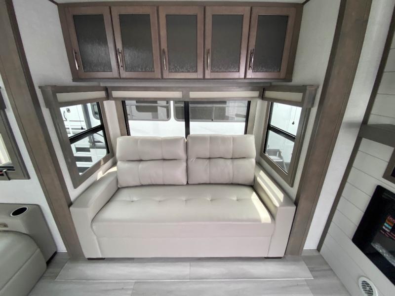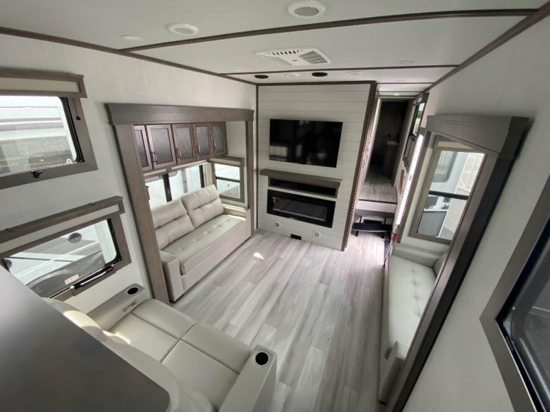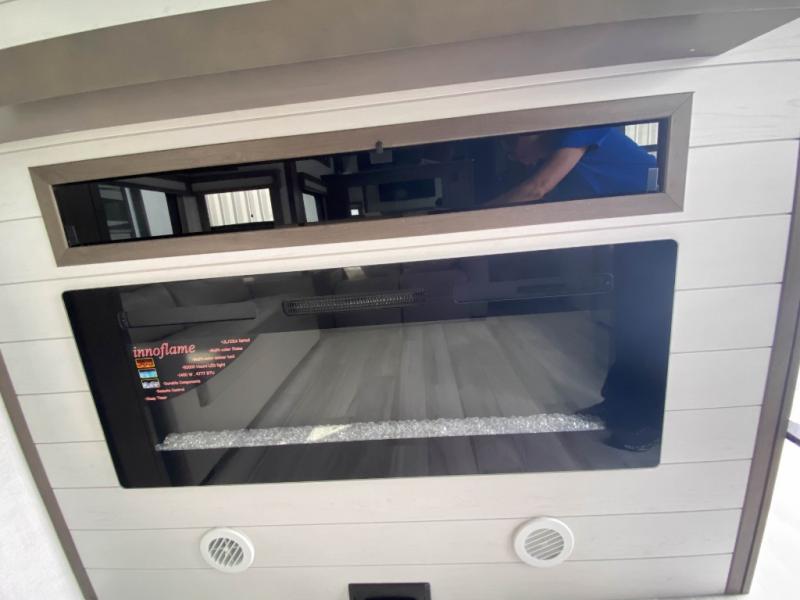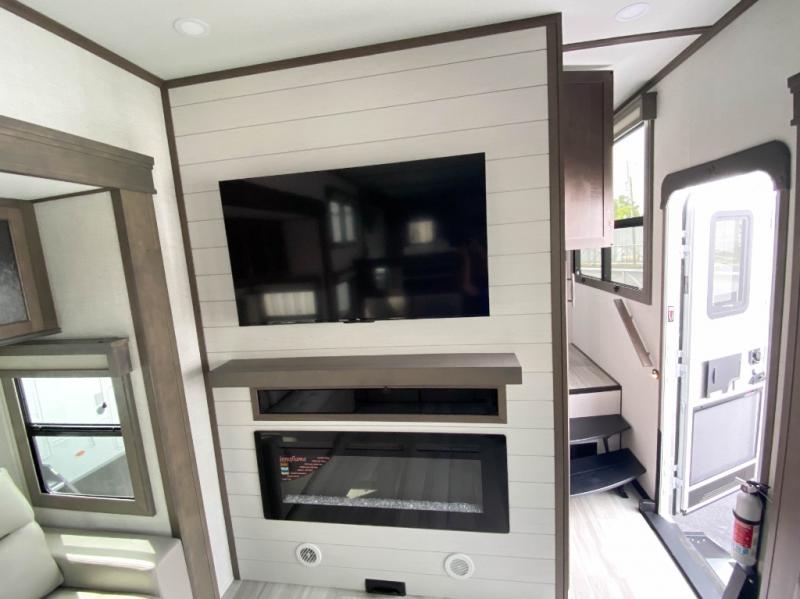 Enjoy each and every vacation, month-long trips, or even extended stays at an RV park in this spacious fifth wheel! The raised rear kitchen gives the cook plenty of room to whip up any type of meal using the stainless steel appliances including a built-in oven, an oversized pantry, and the raised bar top will provide you even more counter space on top of dining with two chairs that overlook the middle living area. Relaxing is made easy thanks to two tri-fold sofas and theatre seating while watching the big game on the LED Smart TV and enjoying the fireplace below. At night, retire to your own queen bed which slides out to provide more floor space, and you can store your clothes in the slide top dresser and front closet with washer and dryer prep.