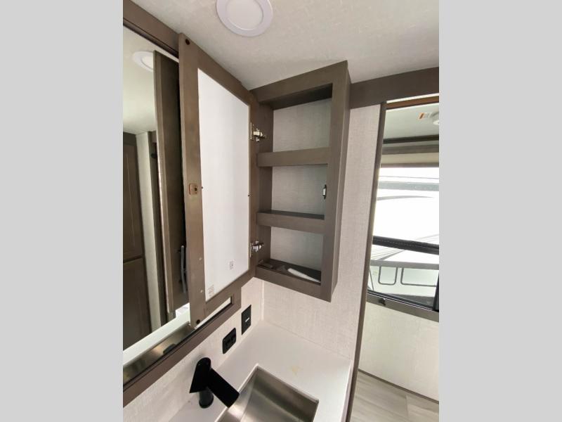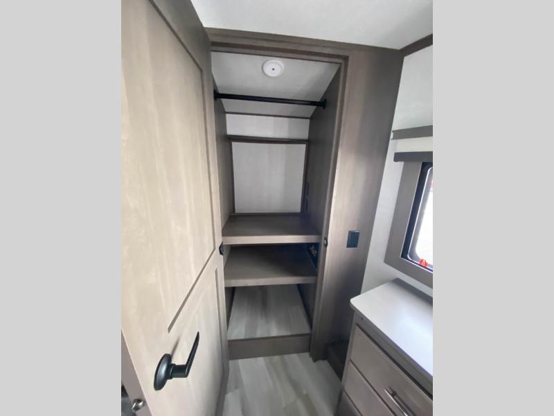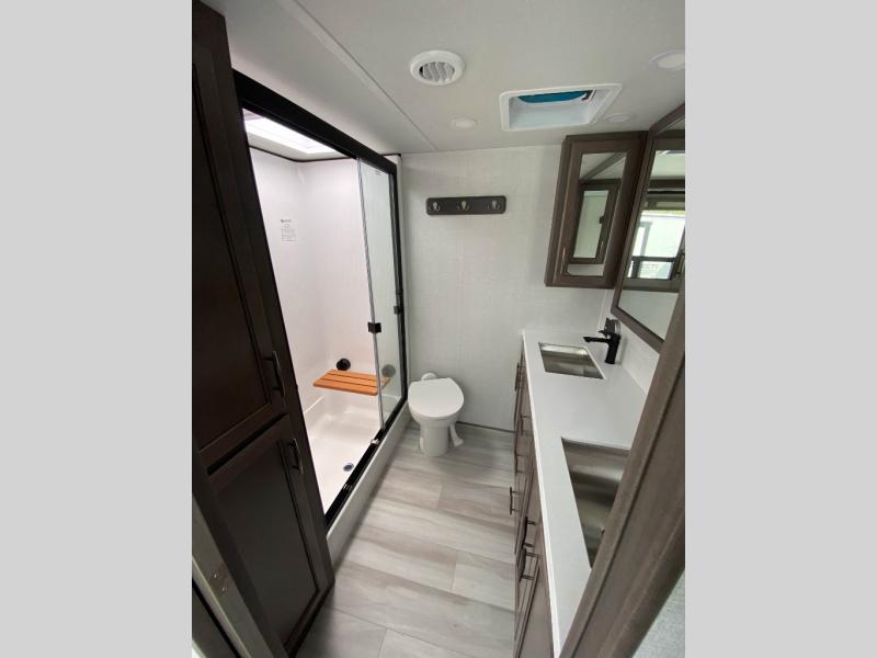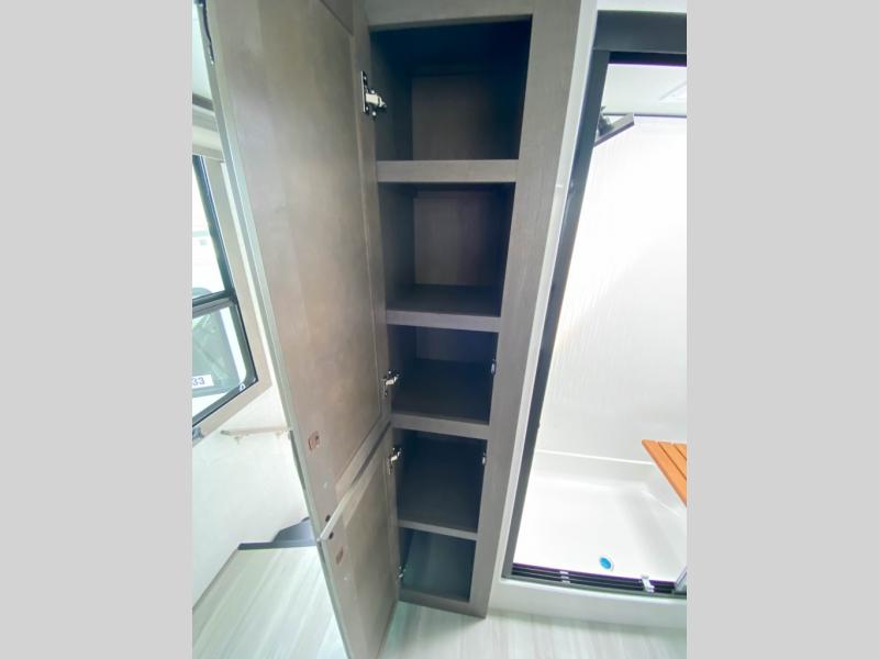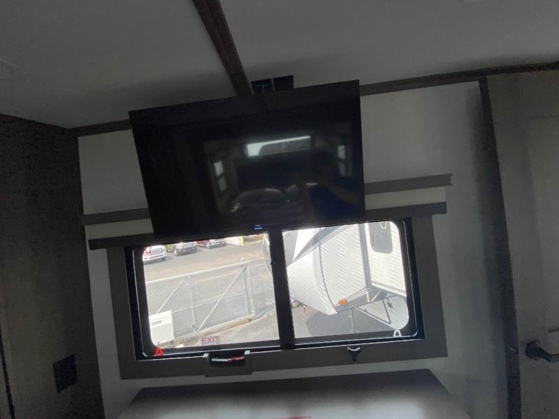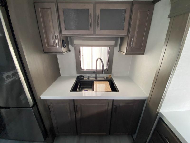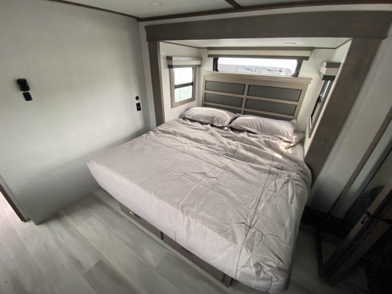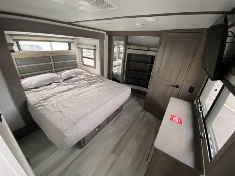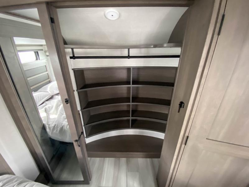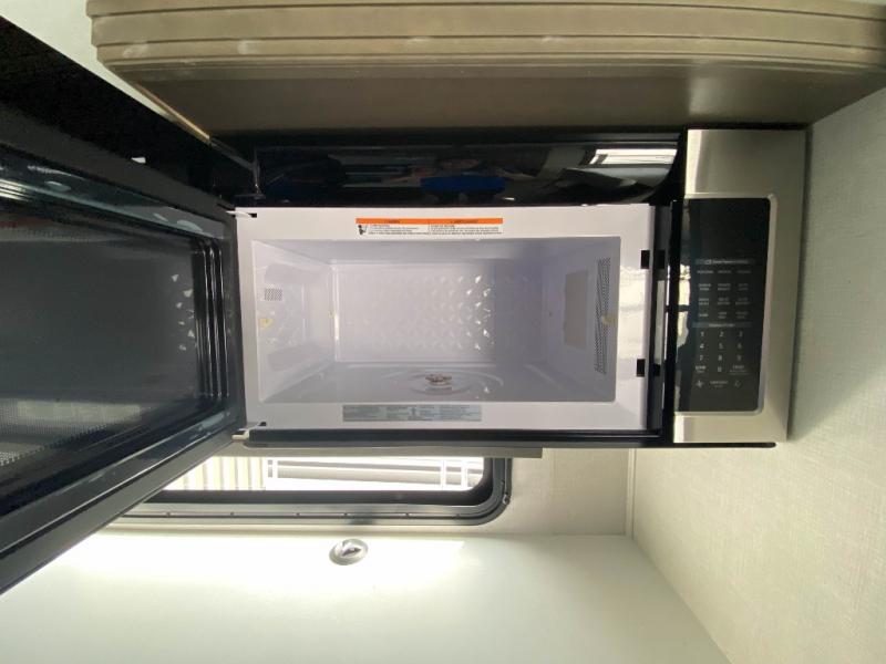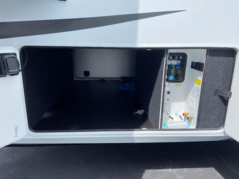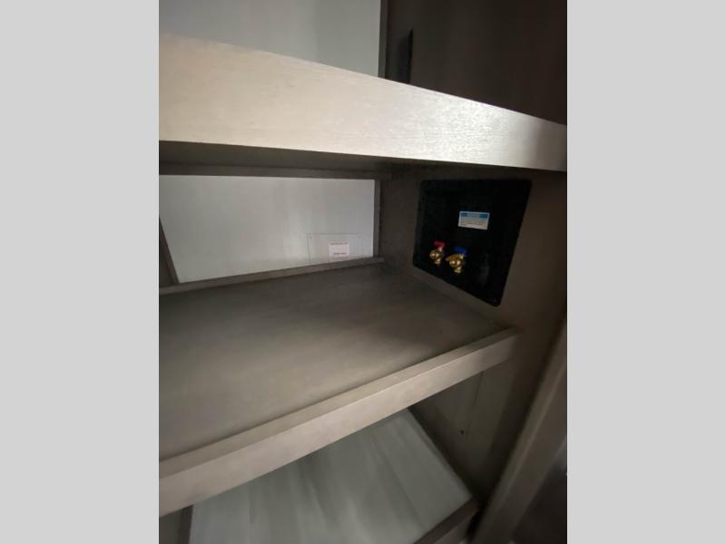 Enjoy each and every vacation, month-long trips, or even extended stays at an RV park in this spacious fifth wheel! The raised rear kitchen gives the cook plenty of room to whip up any type of meal using the stainless steel appliances including a built-in oven, an oversized pantry, and the raised bar top will provide you even more counter space on top of dining with two chairs that overlook the middle living area. Relaxing is made easy thanks to two tri-fold sofas and theatre seating while watching the big game on the LED Smart TV and enjoying the fireplace below. At night, retire to your own queen bed which slides out to provide more floor space, and you can store your clothes in the slide top dresser and front closet with washer and dryer prep.