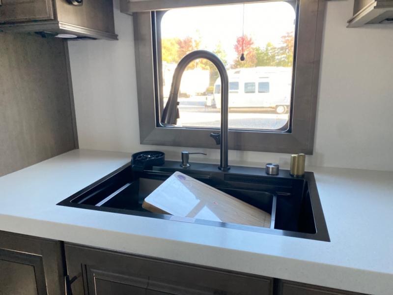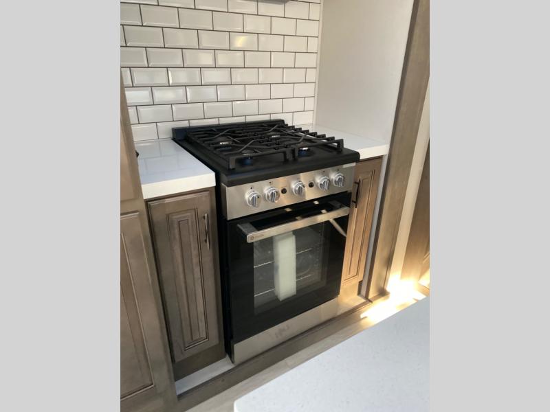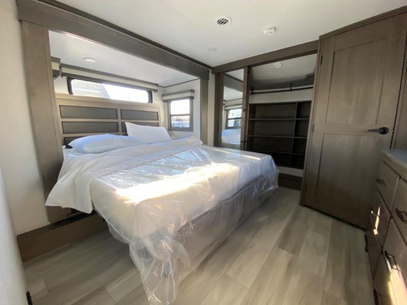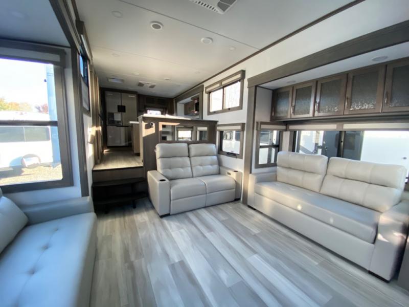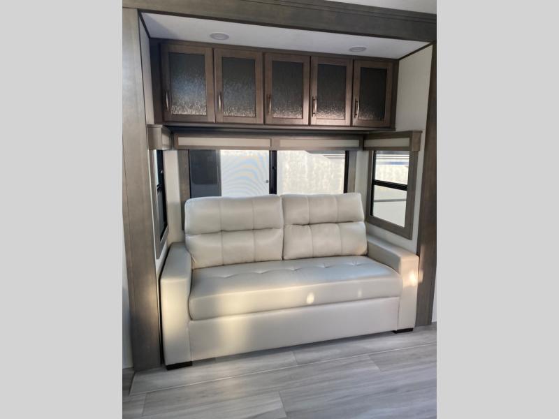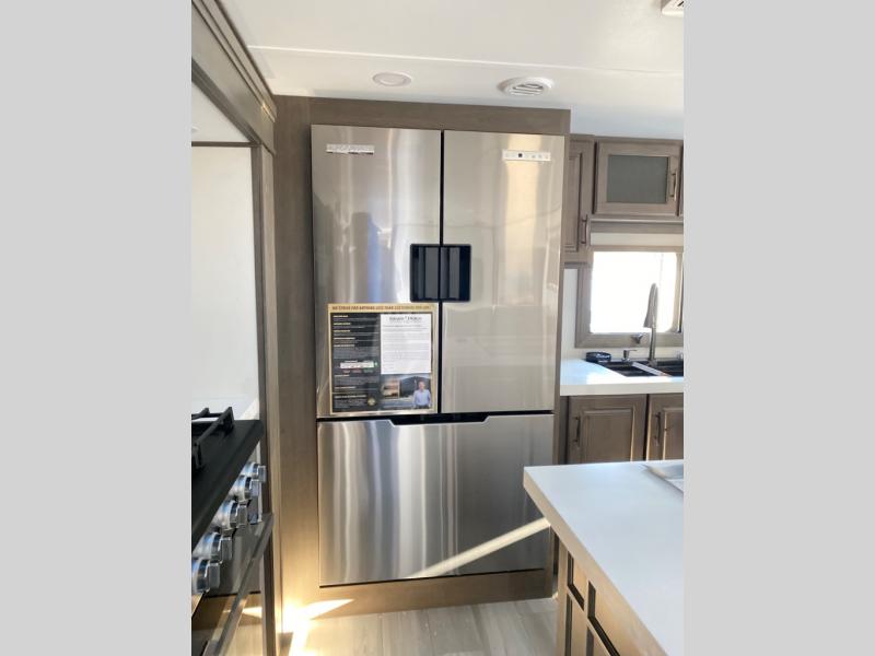 Enjoy each and every vacation, month-long trips, or even extended stays at an RV park in this spacious fifth wheel! The raised rear kitchen gives the cook plenty of room to whip up any type of meal using the stainless steel appliances including a built-in oven, an oversized pantry, and the raised bar top will provide you even more counter space on top of dining with two chairs that overlook the middle living area. Relaxing is made easy thanks to two tri-fold sofas and theatre seating while watching the big game on the LED Smart TV and enjoying the fireplace below. At night, retire to your own queen bed which slides out to provide more floor space, and you can store your clothes in the slide top dresser and front closet with washer and dryer prep.