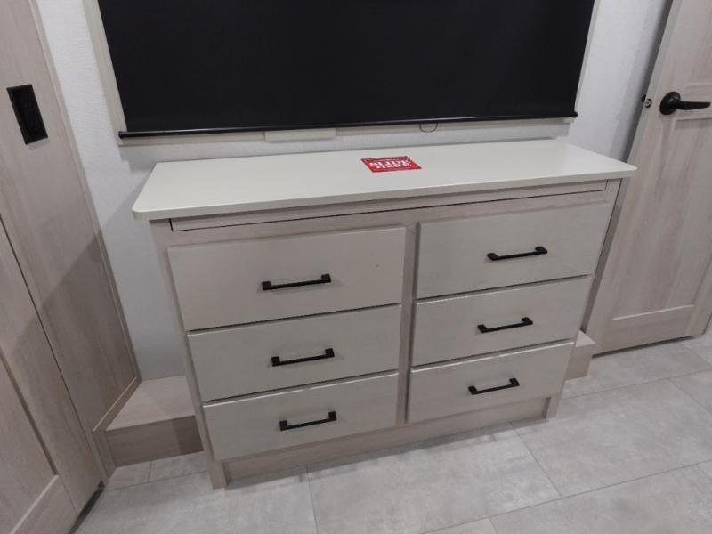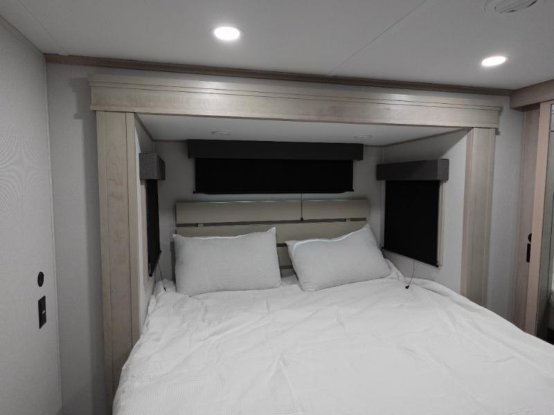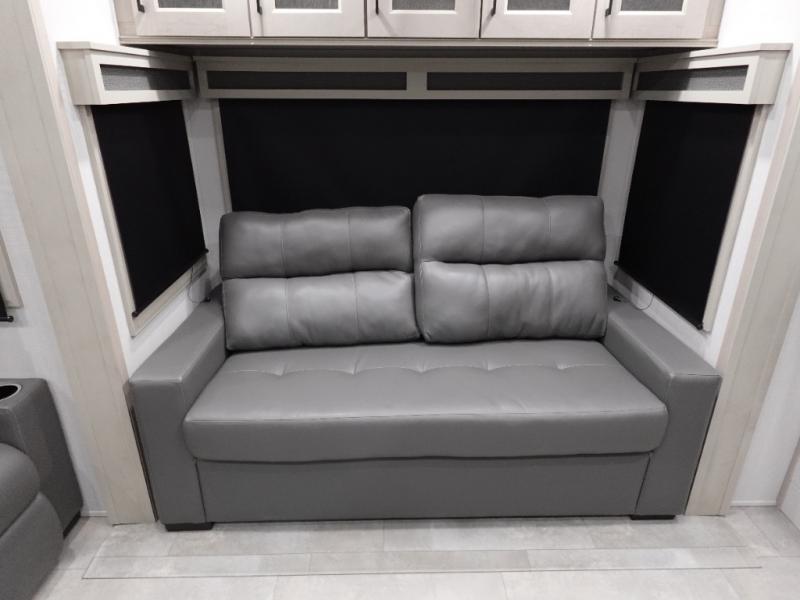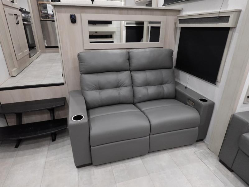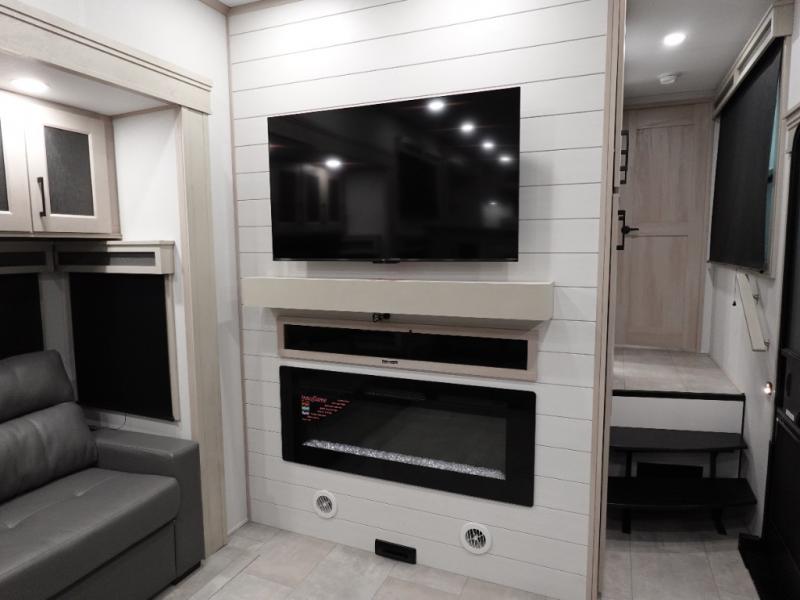 Enjoy each and every vacation, month-long trips, or even extended stays at an RV park in this spacious fifth wheel! The raised rear kitchen gives the cook plenty of room to whip up any type of meal using the stainless steel appliances including a built-in oven, an oversized pantry, and the raised bar top will provide you even more counter space on top of dining with two chairs that overlook the middle living area. Relaxing is made easy thanks to two tri-fold sofas and theatre seating while watching the big game on the LED Smart TV and enjoying the fireplace below. At night, retire to your own king bed which slides out to provide more floor space, and you can store your clothes in the slide top dresser and front closet with washer and dryer prep.