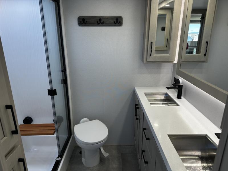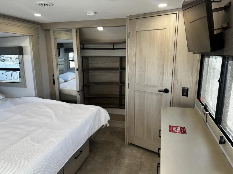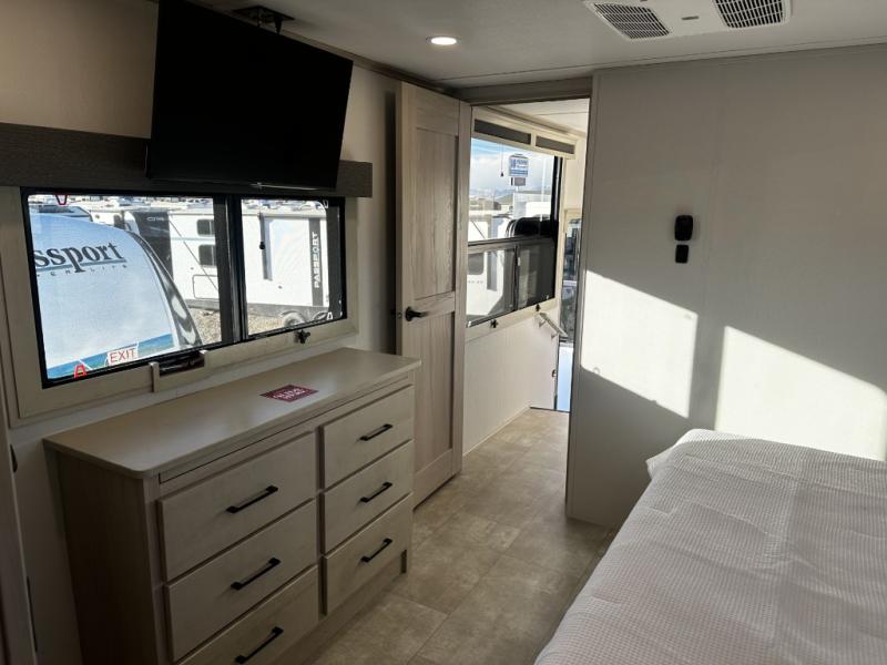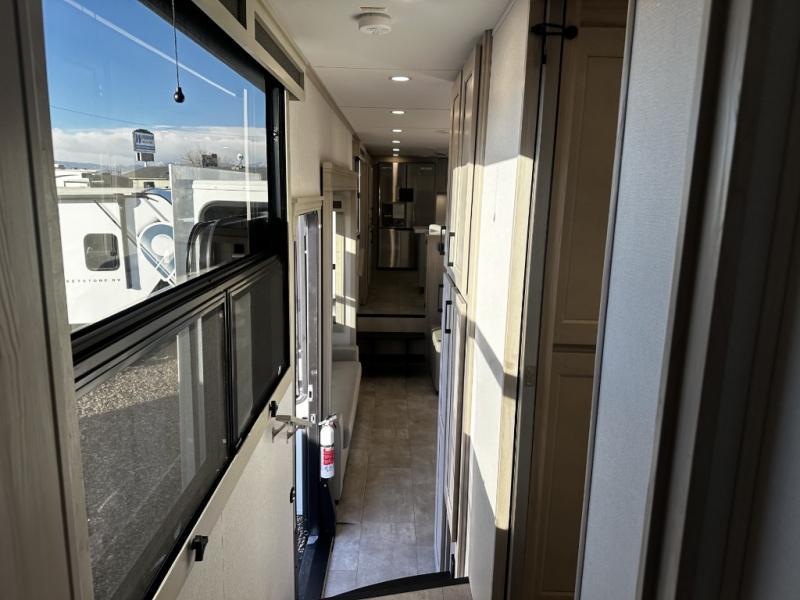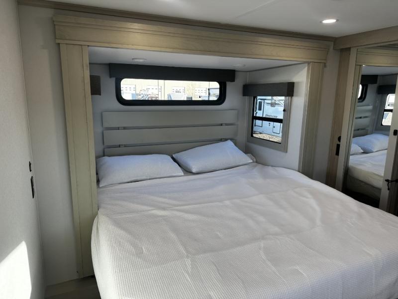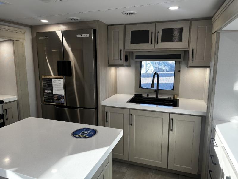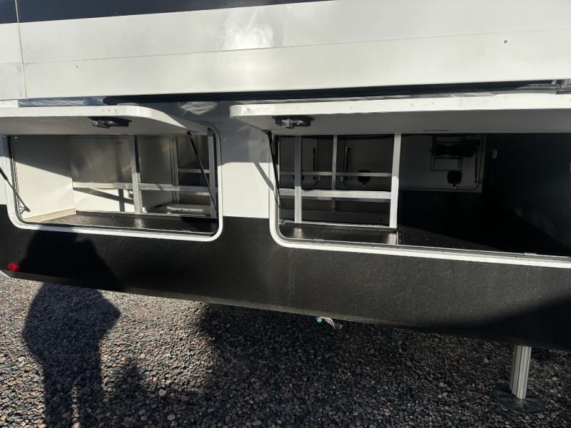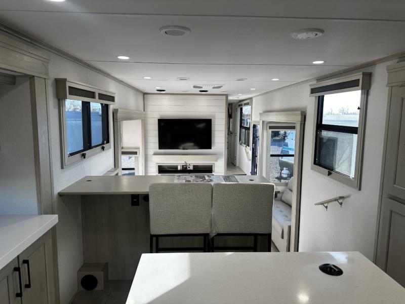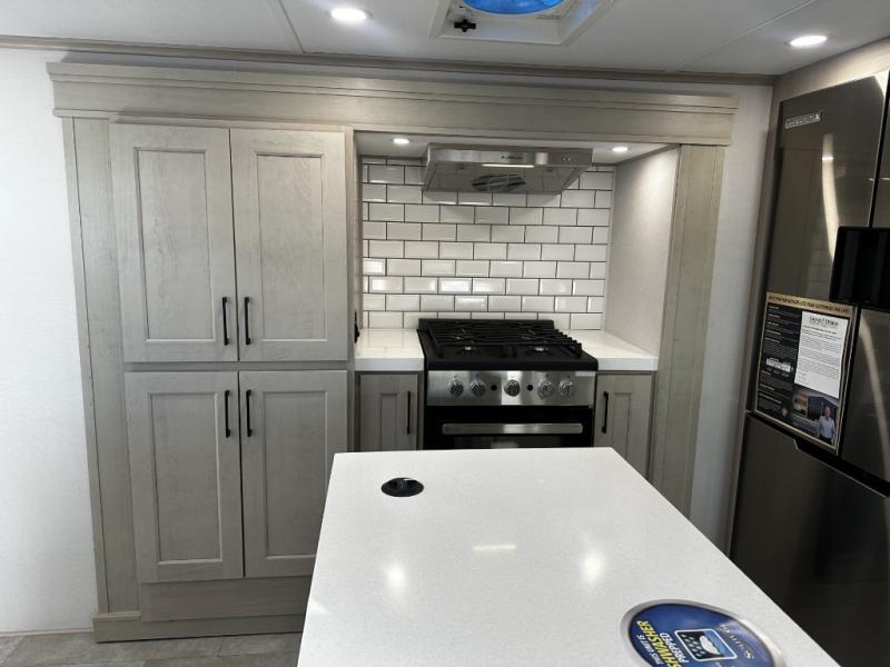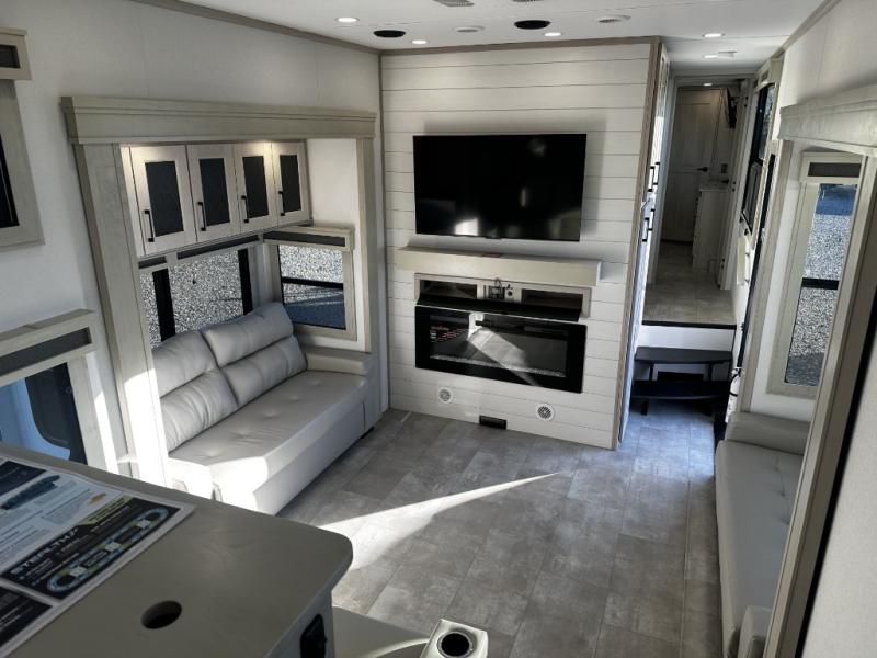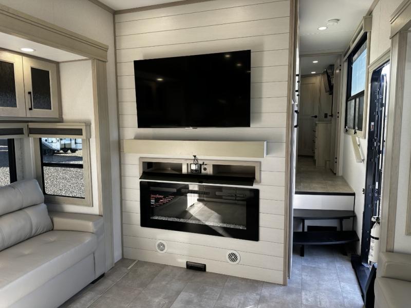 Enjoy each and every vacation, month-long trips, or even extended stays at an RV park in this spacious fifth wheel! The raised rear kitchen gives the cook plenty of room to whip up any type of meal using the stainless steel appliances including a built-in oven, an oversized pantry, and the raised bar top will provide you even more counter space on top of dining with two chairs that overlook the middle living area. Relaxing is made easy thanks to two tri-fold sofas and theatre seating while watching the big game on the LED Smart TV and enjoying the fireplace below. At night, retire to your own queen bed which slides out to provide more floor space, and you can store your clothes in the slide top dresser and front closet with washer and dryer prep.