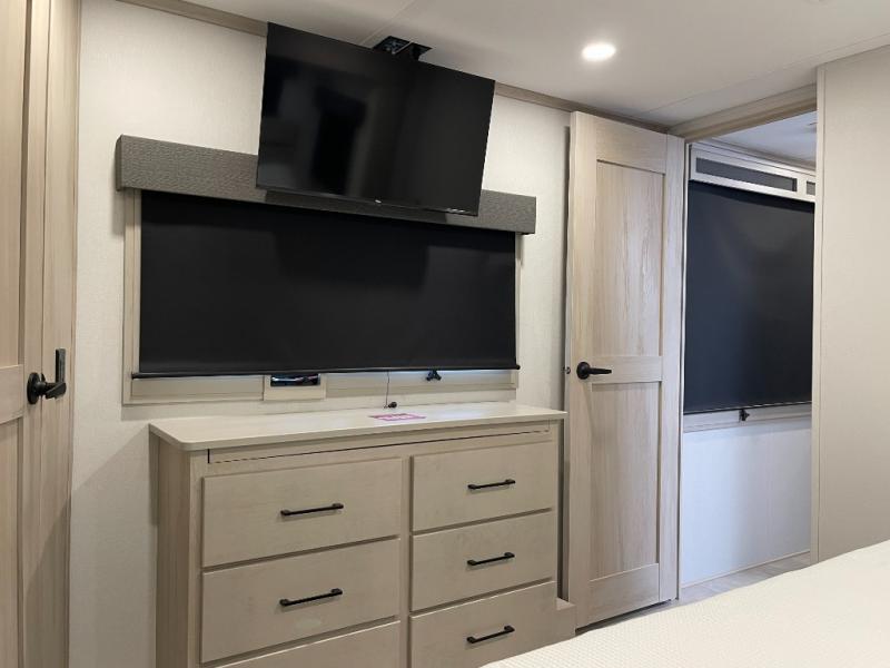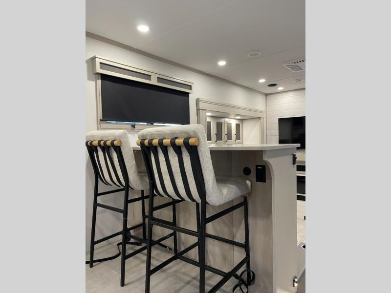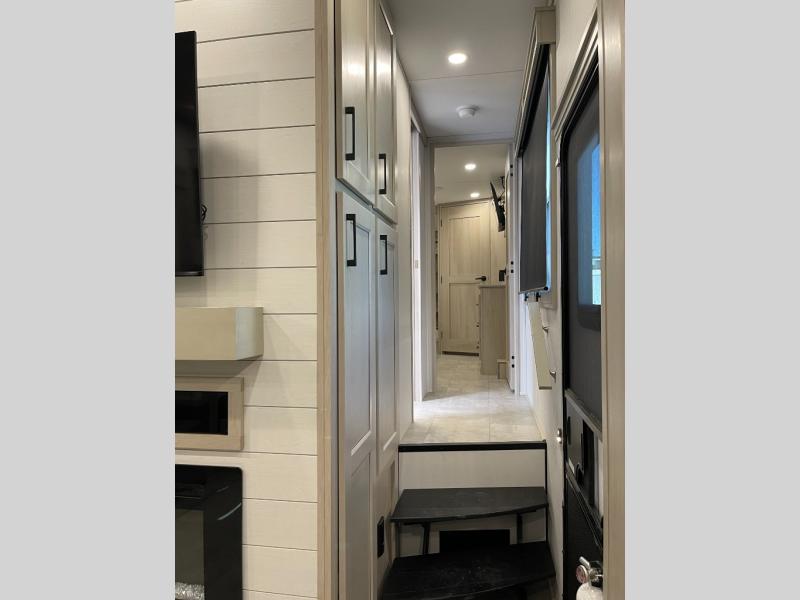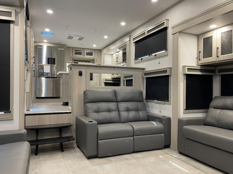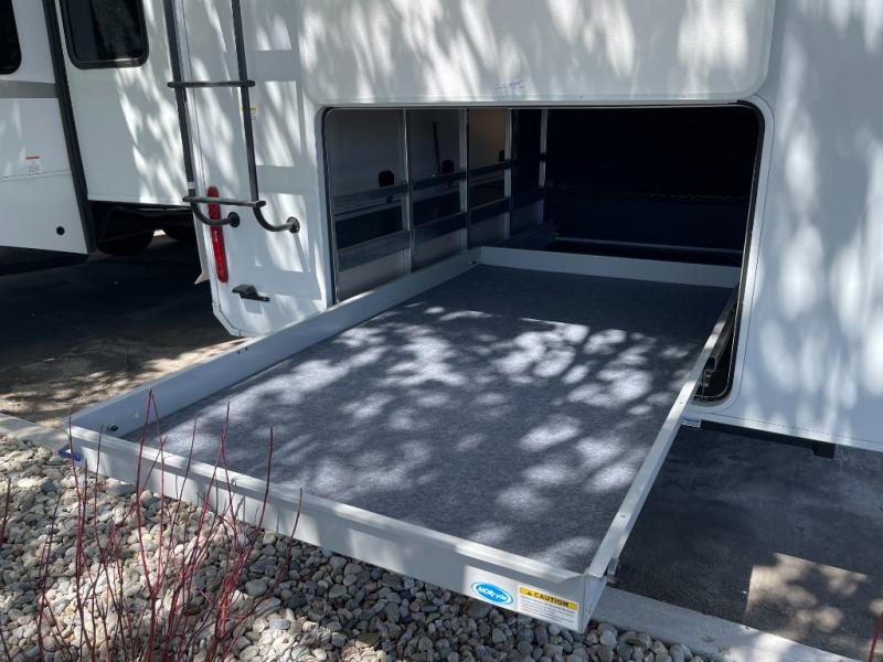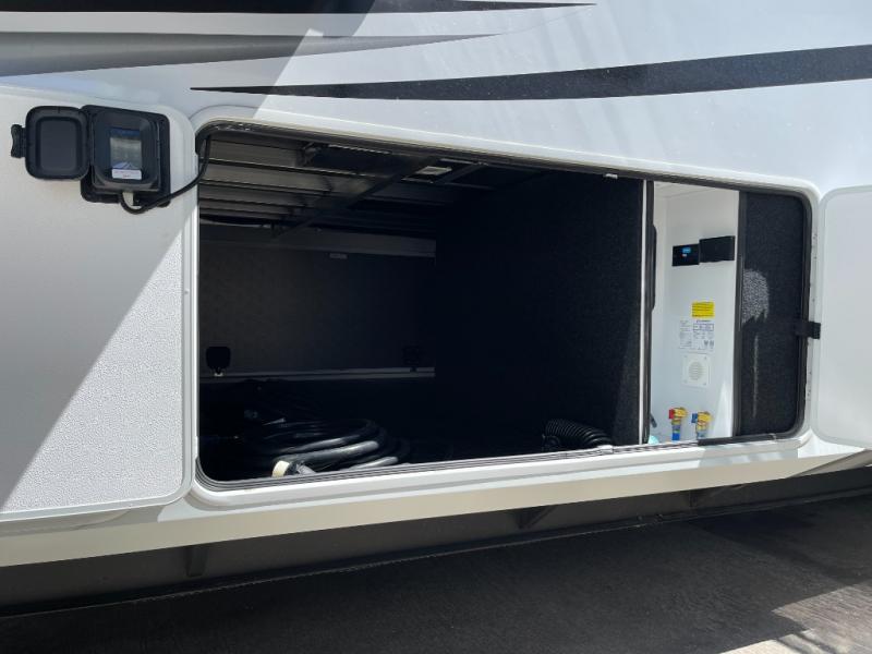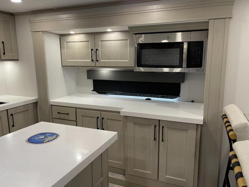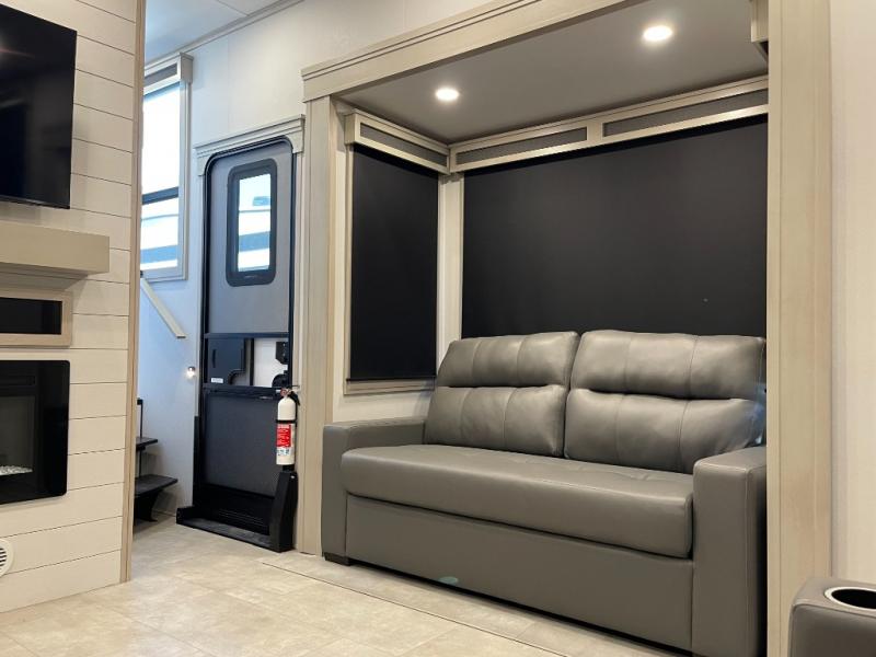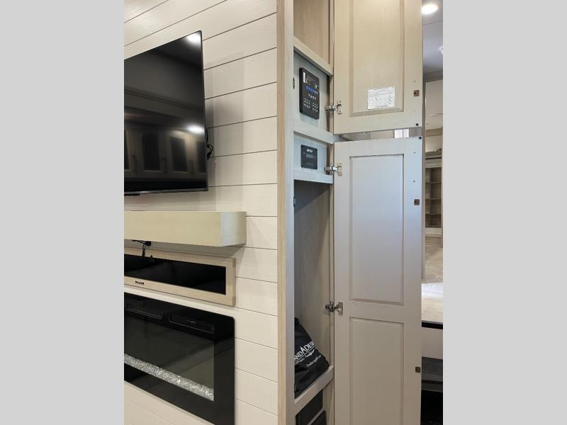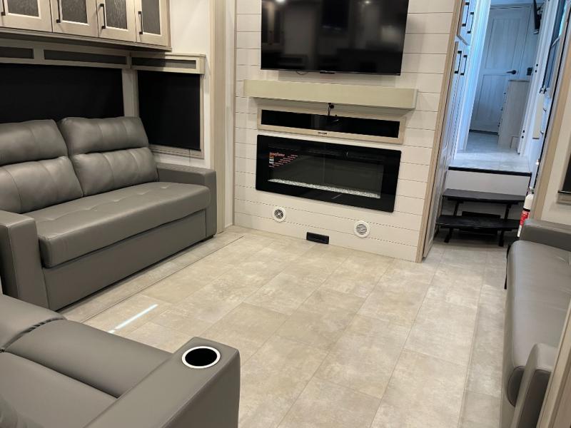 Enjoy each and every vacation, month-long trips, or even extended stays at an RV park in this spacious fifth wheel! The raised rear kitchen gives the cook plenty of room to whip up any type of meal using the stainless steel appliances including a built-in oven, an oversized pantry, and the raised bar top will provide you even more counter space on top of dining with two chairs that overlook the middle living area. Relaxing is made easy thanks to two tri-fold sofas and theatre seating while watching the big game on the LED Smart TV and enjoying the fireplace below. At night, retire to your own queen bed which slides out to provide more floor space, and you can store your clothes in the slide top dresser and front closet with washer and dryer prep.