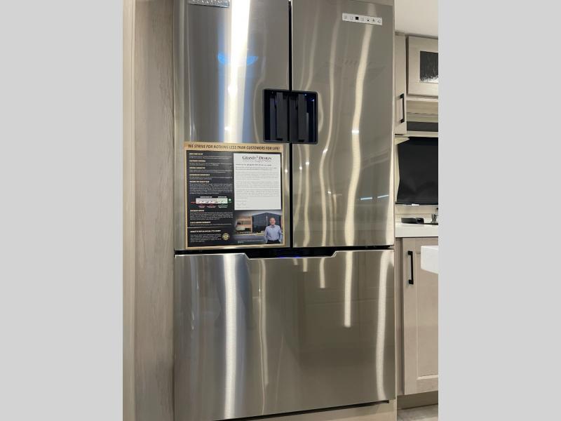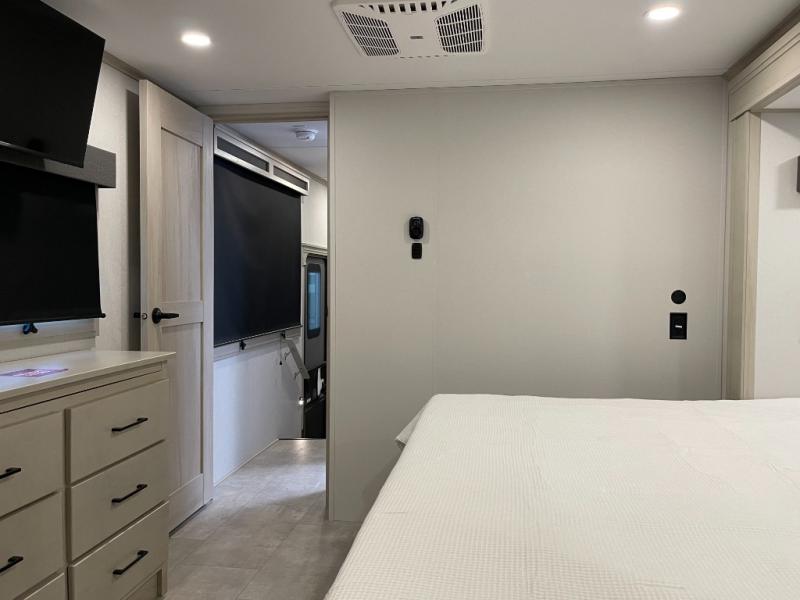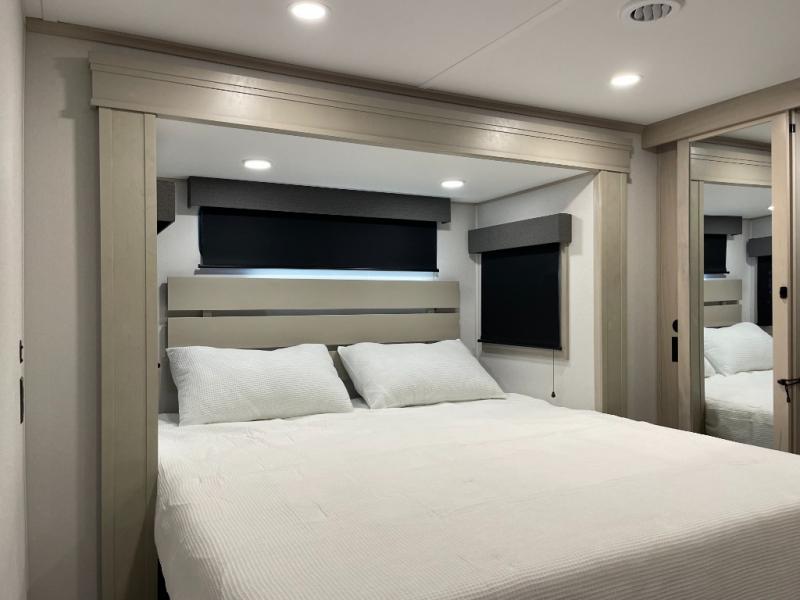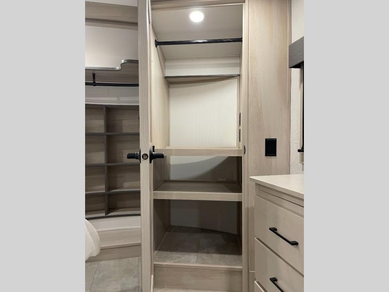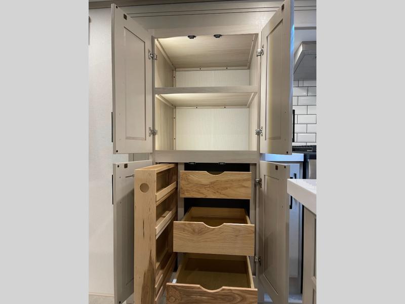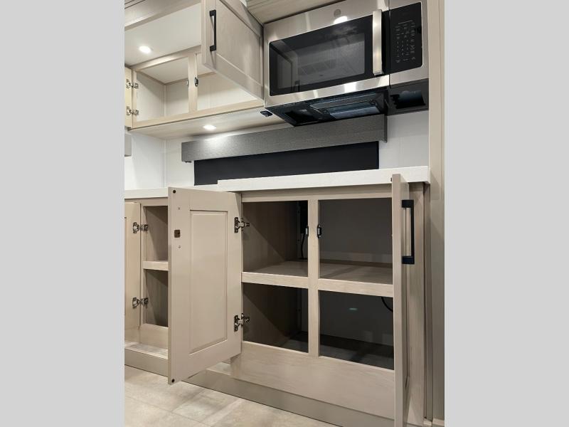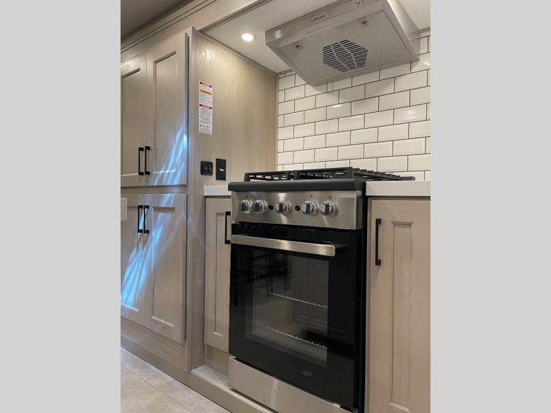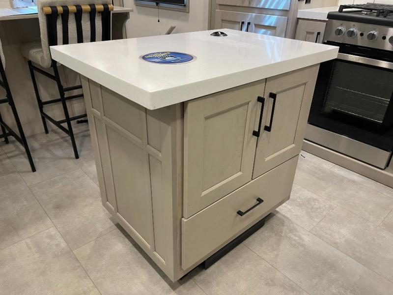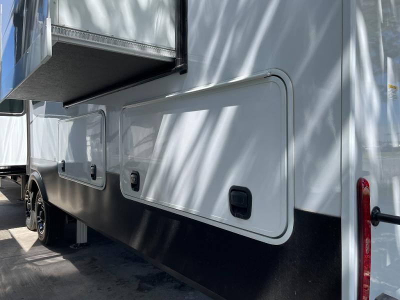Enjoy each and every vacation, month-long trips, or even extended stays at an RV park in this spacious fifth wheel! The raised rear kitchen gives the cook plenty of room to whip up any type of meal using the stainless steel appliances including a built-in oven, an oversized pantry, and the raised bar top will provide you even more counter space on top of dining with two chairs that overlook the middle living area. Relaxing is made easy thanks to two tri-fold sofas and theatre seating while watching the big game on the LED Smart TV and enjoying the fireplace below. At night, retire to your own queen bed which slides out to provide more floor space, and you can store your clothes in the slide top dresser and front closet with washer and dryer prep.