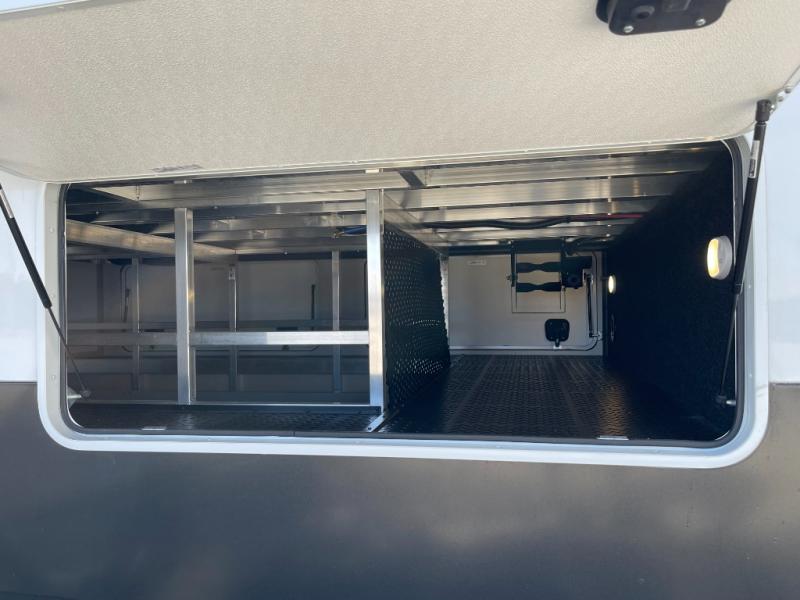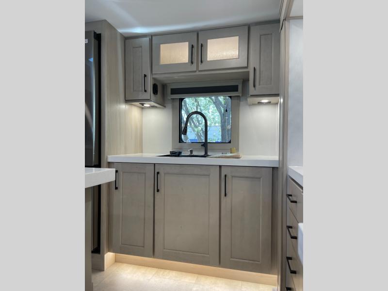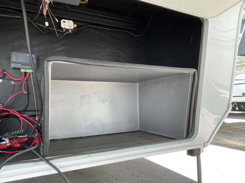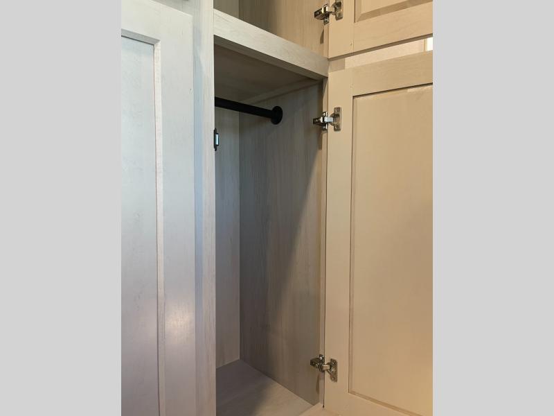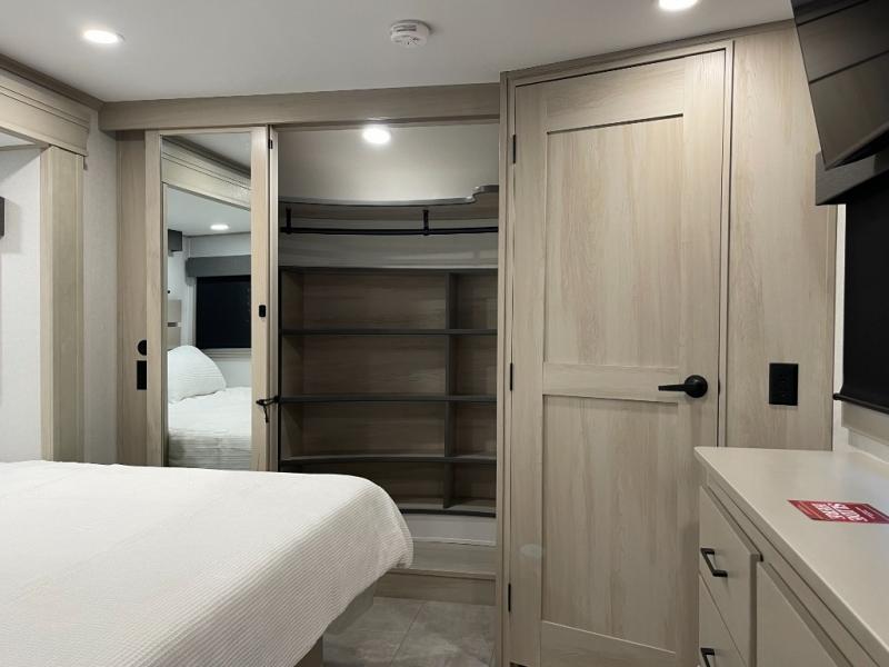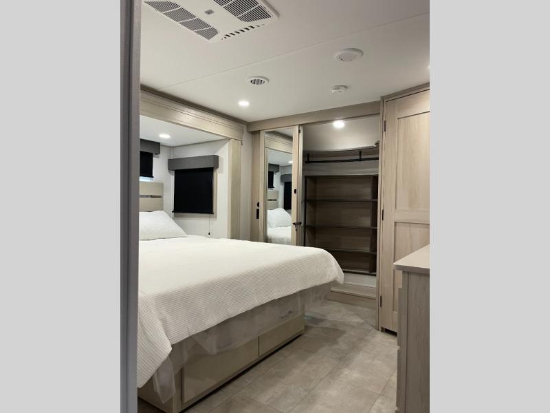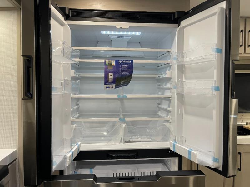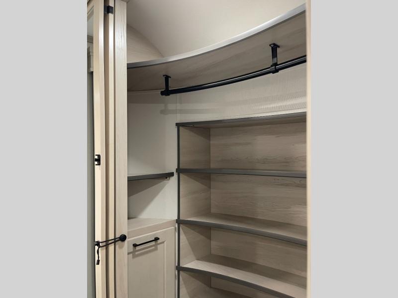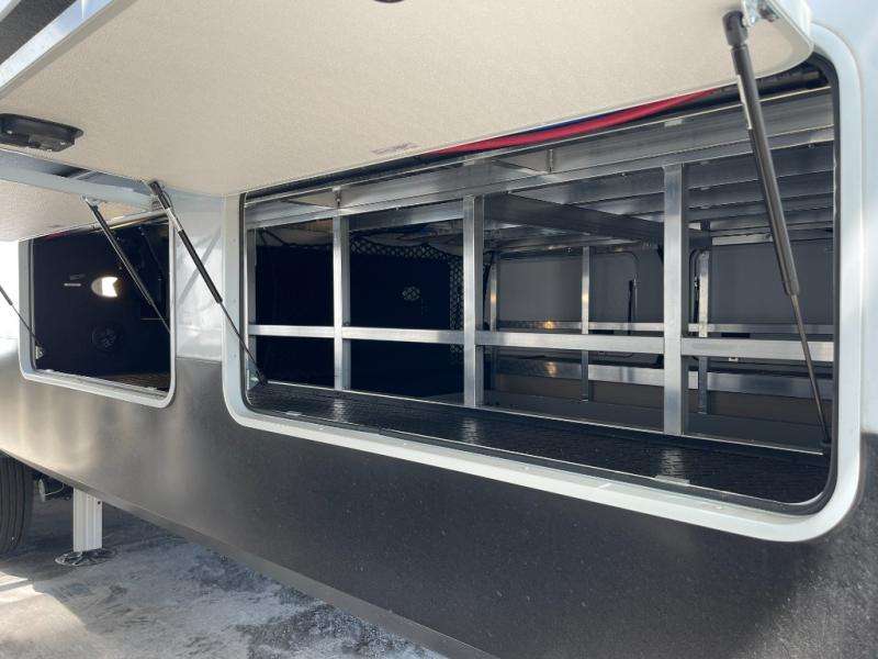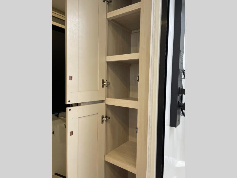 Enjoy each and every vacation, month-long trips, or even extended stays at an RV park in this spacious fifth wheel! The raised rear kitchen gives the cook plenty of room to whip up any type of meal using the stainless steel appliances including a built-in oven, an oversized pantry, and the raised bar top will provide you even more counter space on top of dining with two chairs that overlook the middle living area. Relaxing is made easy thanks to two tri-fold sofas and theatre seating while watching the big game on the LED Smart TV and enjoying the fireplace below. At night, retire to your own queen bed which slides out to provide more floor space, and you can store your clothes in the slide top dresser and front closet with washer and dryer prep.