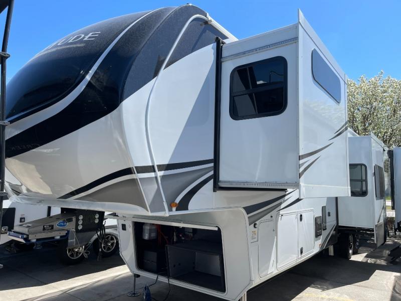 Each Solitude fifth wheel by Grand Design features a 101" wide-body construction, heavy duty 8,000 lb. axles, frameless tinted windows, and high-gloss gel coat sidewalls. You can camp year around thanks to the Weather-Tek Package that includes a 35K BTU high-capacity furnace, an all-in-one enclosed and heated utility center, and a fully enclosed underbelly with heated tanks and storage. Inside, you'll love the premium roller shades, hardwood cabinet doors, solid surface countertops, plus residential finishes throughout to make you truly feel at home. Each model also includes a MORryde CRE3000 suspension system, self adjusting brakes, and a MORryde pin box that will provide smooth towing from home to campground. Affordable luxury is possible with the Solitude fifth wheels; choose yours today!