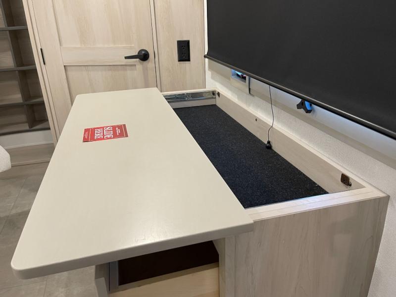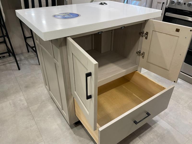 Rear Kitchen, Rear Storage with Storage Drawer, 2 Tri-Fold Sofas, Theater Seats, King Bed on Slide