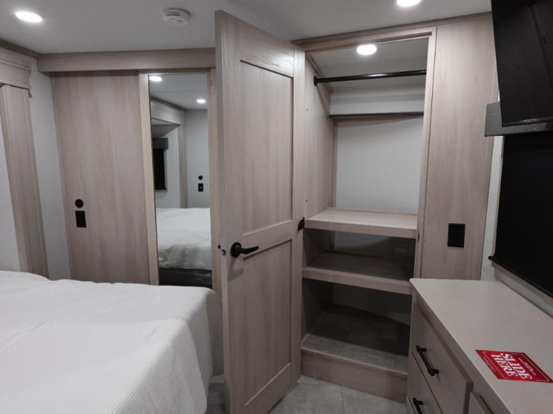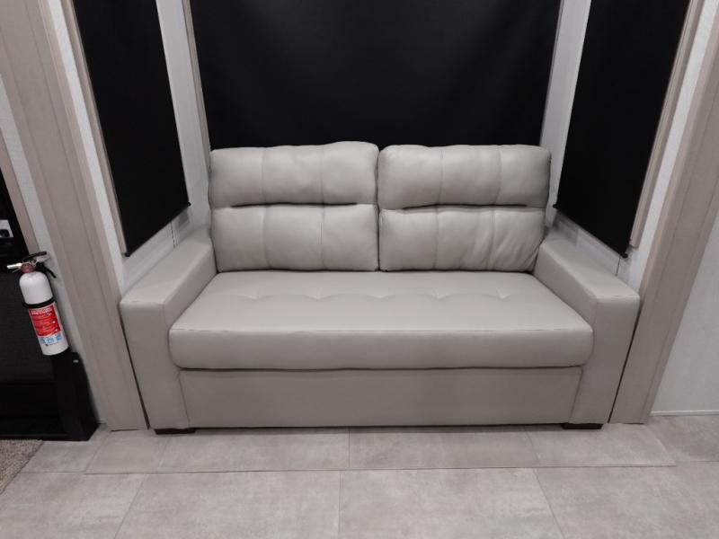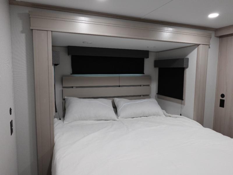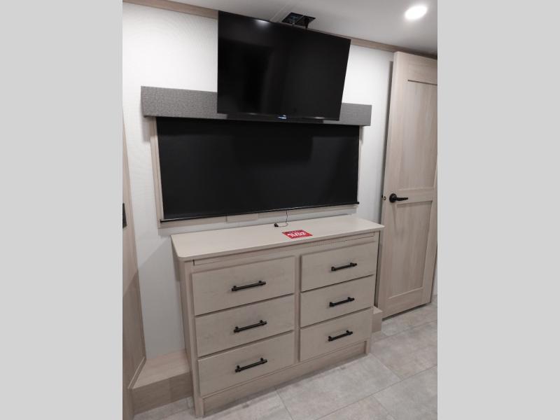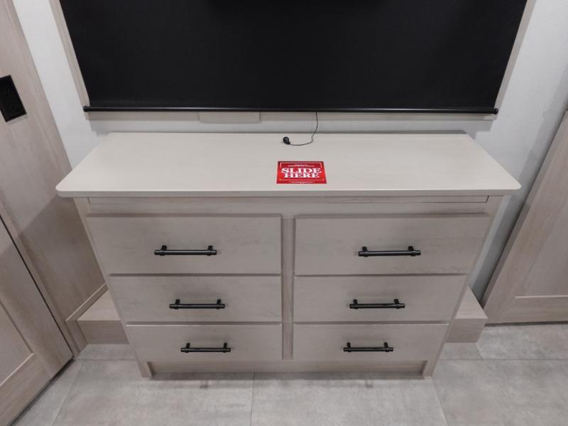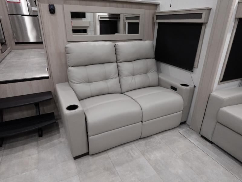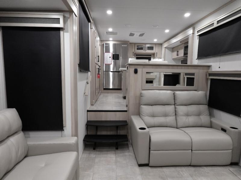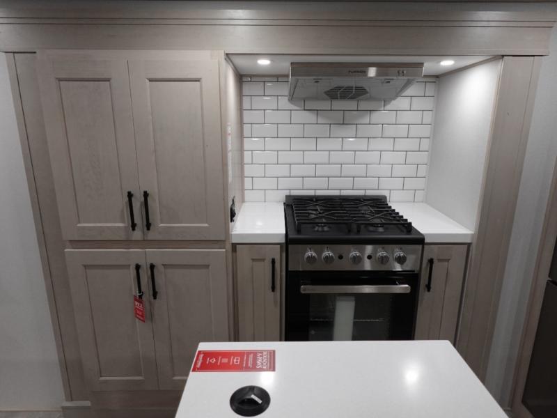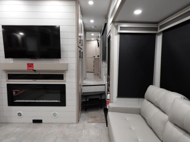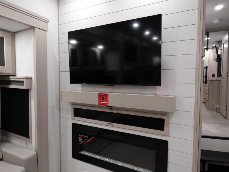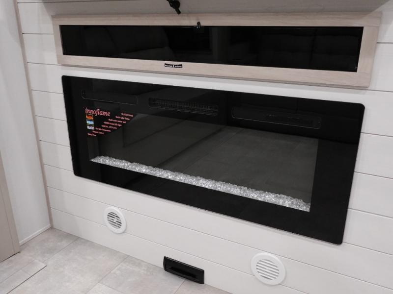 Enjoy each and every vacation, month-long trips, or even extended stays at an RV park in this spacious fifth wheel! The raised rear kitchen gives the cook plenty of room to whip up any type of meal using the stainless steel appliances including a built-in oven, an oversized pantry, and the raised bar top will provide you even more counter space on top of dining with two chairs that overlook the middle living area. Relaxing is made easy thanks to two tri-fold sofas and theatre seating while watching the big game on the LED Smart TV and enjoying the fireplace below. At night, retire to your own queen bed which slides out to provide more floor space, and you can store your clothes in the slide top dresser and front closet with washer and dryer prep.