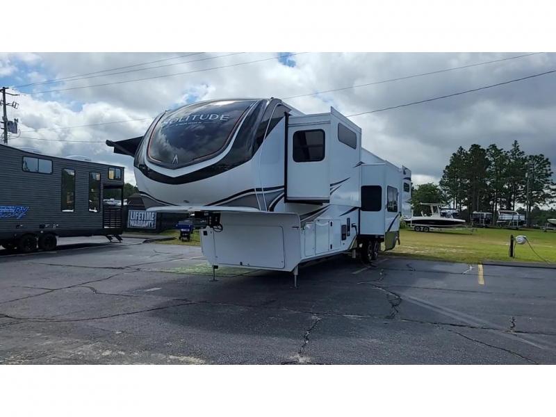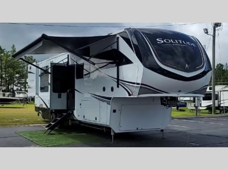 Each Solitude fifth wheel by Grand Design features a 101" wide-body construction, heavy duty 8,000 lb. axles, frameless tinted windows, and high-gloss gel coat sidewalls. You can camp year around thanks to the Weather-Tek Package that includes a 35K BTU high-capacity furnace, an all-in-one enclosed and heated utility center, and a fully enclosed underbelly with heated tanks and storage. Inside, you'll love the premium roller shades, hardwood cabinet doors, solid surface countertops, plus residential finishes throughout to make you truly feel at home. Each model also includes a MORryde CRE3000 suspension system, self adjusting brakes, and a MORryde pin box that will provide smooth towing from home to campground. Affordable luxury is possible with the Solitude fifth wheels; choose yours today!