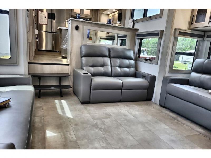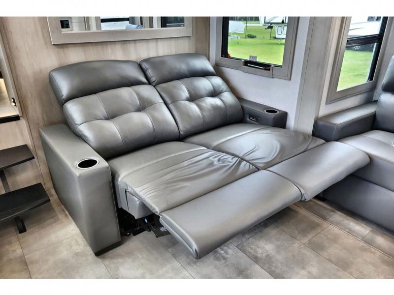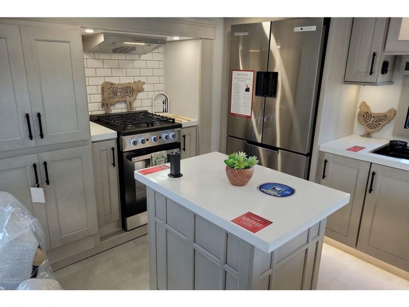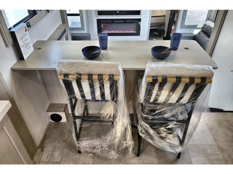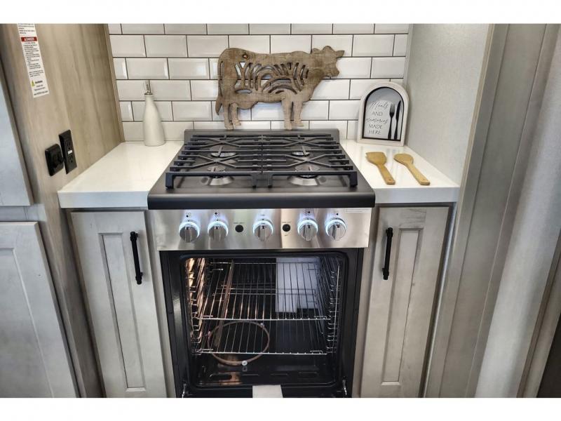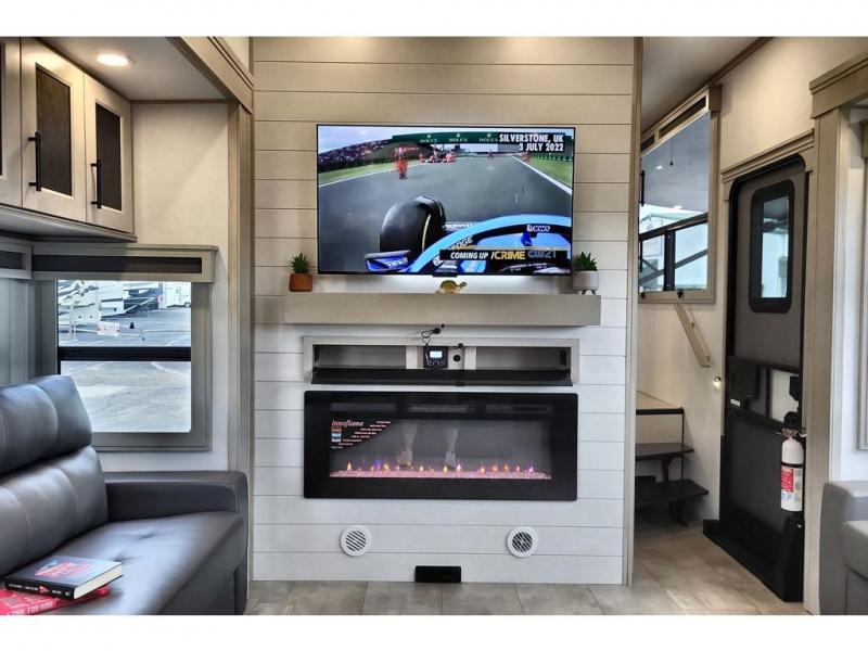 Enjoy each and every vacation, month-long trips, or even extended stays at an RV park in this spacious fifth wheel! The raised rear kitchen gives the cook plenty of room to whip up any type of meal using the stainless steel appliances including a built-in oven, an oversized pantry, and the raised bar top will provide you even more counter space on top of dining with two chairs that overlook the middle living area. Relaxing is made easy thanks to two tri-fold sofas and theatre seating while watching the big game on the LED Smart TV and enjoying the fireplace below. At night, retire to your own queen bed which slides out to provide more floor space, and you can store your clothes in the slide top dresser and front closet with washer and dryer prep.