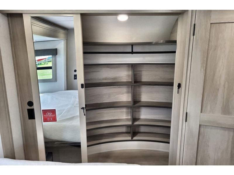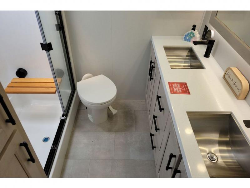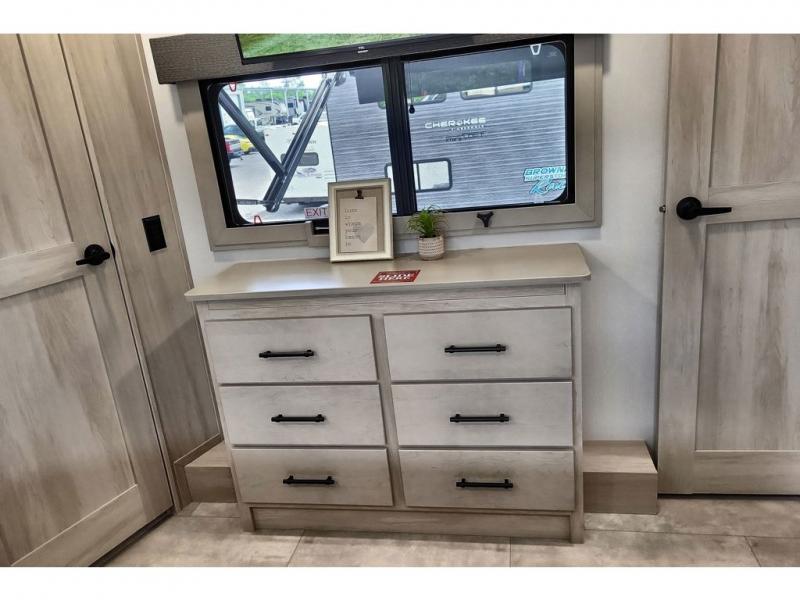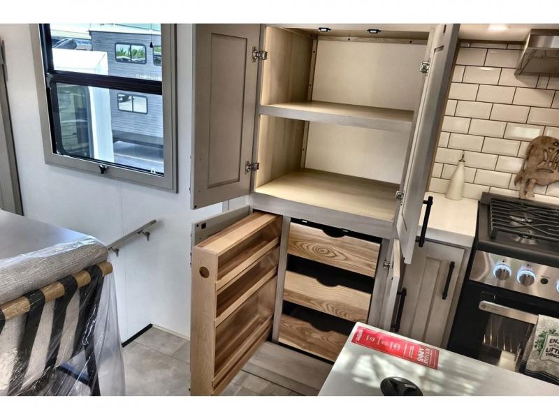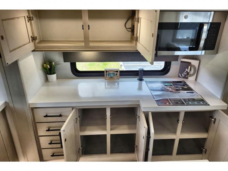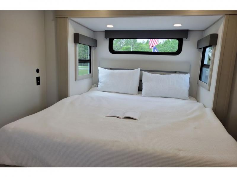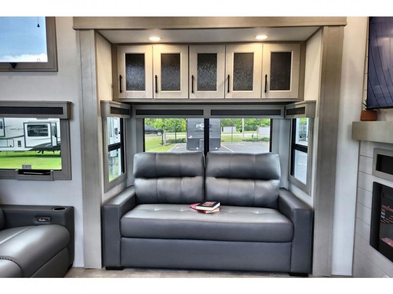 Enjoy each and every vacation, month-long trips, or even extended stays at an RV park in this spacious fifth wheel! The raised rear kitchen gives the cook plenty of room to whip up any type of meal using the stainless steel appliances including a built-in oven, an oversized pantry, and the raised bar top will provide you even more counter space on top of dining with two chairs that overlook the middle living area. Relaxing is made easy thanks to two tri-fold sofas and theatre seating while watching the big game on the LED Smart TV and enjoying the fireplace below. At night, retire to your own queen bed which slides out to provide more floor space, and you can store your clothes in the slide top dresser and front closet with washer and dryer prep.