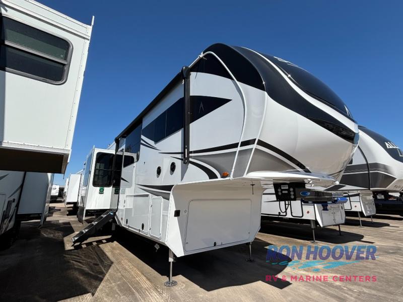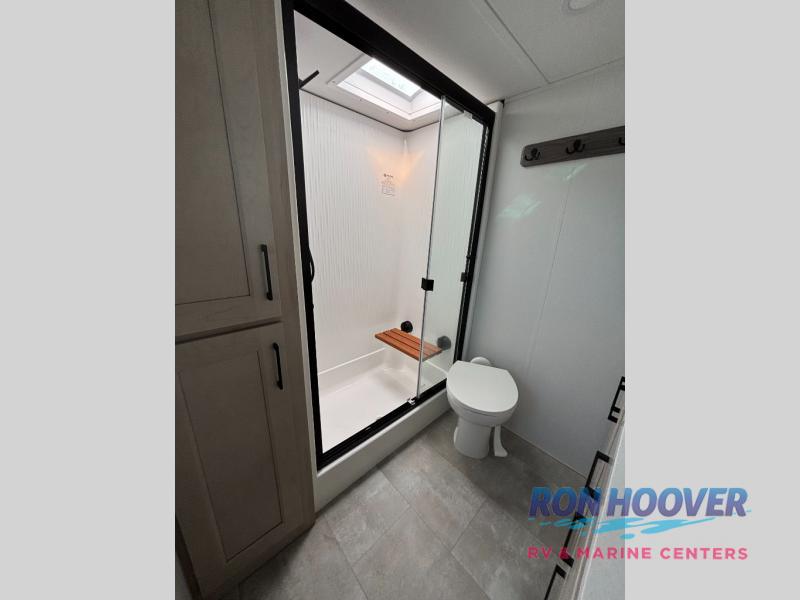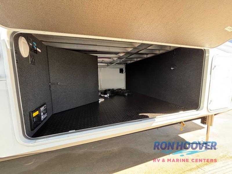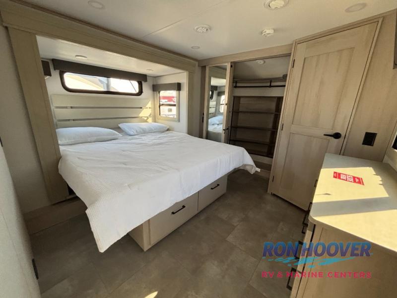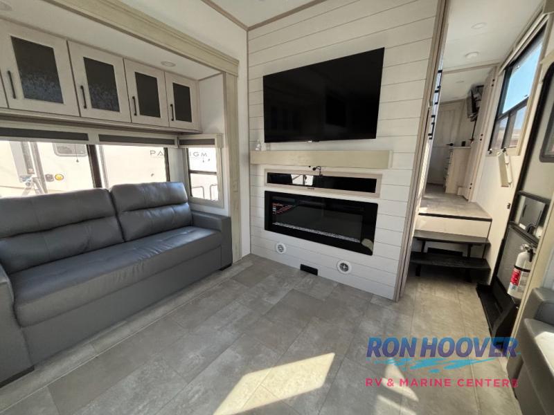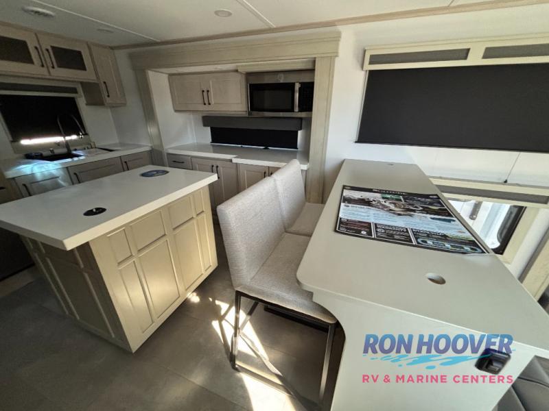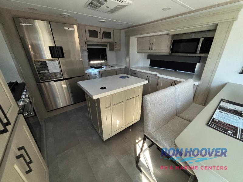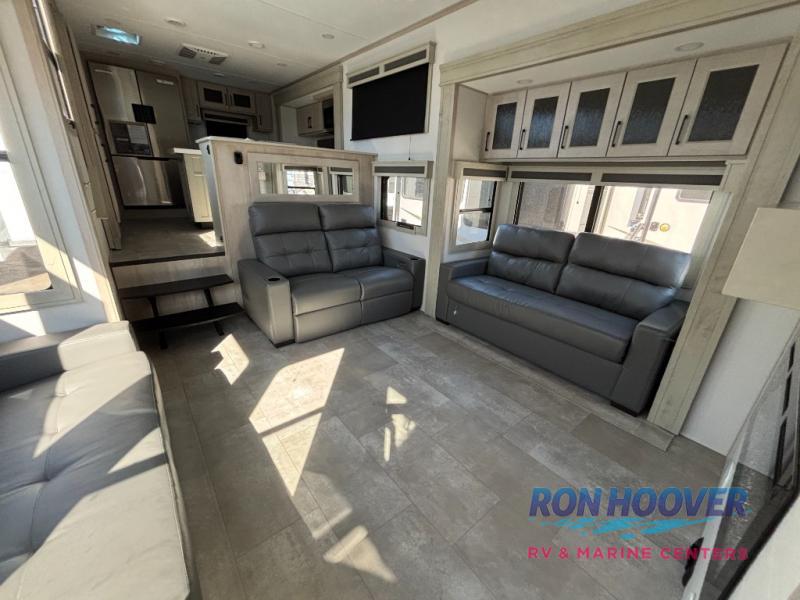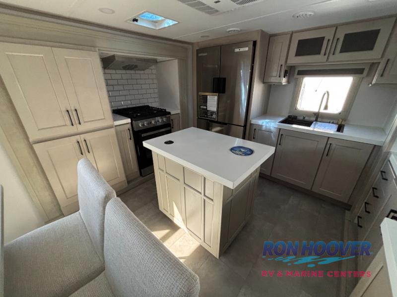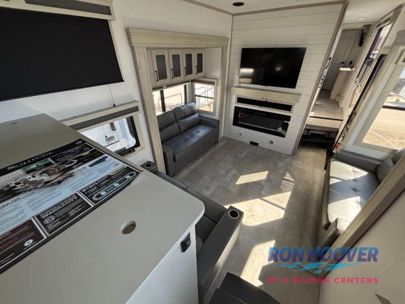 Enjoy each and every vacation, month-long trips, or even extended stays at an RV park in this spacious fifth wheel! The raised rear kitchen gives the cook plenty of room to whip up any type of meal using the stainless steel appliances including a built-in oven, an oversized pantry, and the raised bar top will provide you even more counter space on top of dining with two chairs that overlook the middle living area. Relaxing is made easy thanks to two tri-fold sofas and theatre seating while watching the big game on the LED Smart TV and enjoying the fireplace below. At night, retire to your own queen bed which slides out to provide more floor space, and you can store your clothes in the slide top dresser and front closet with washer and dryer prep.