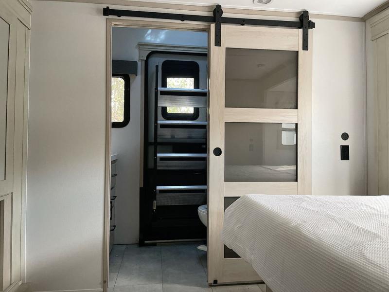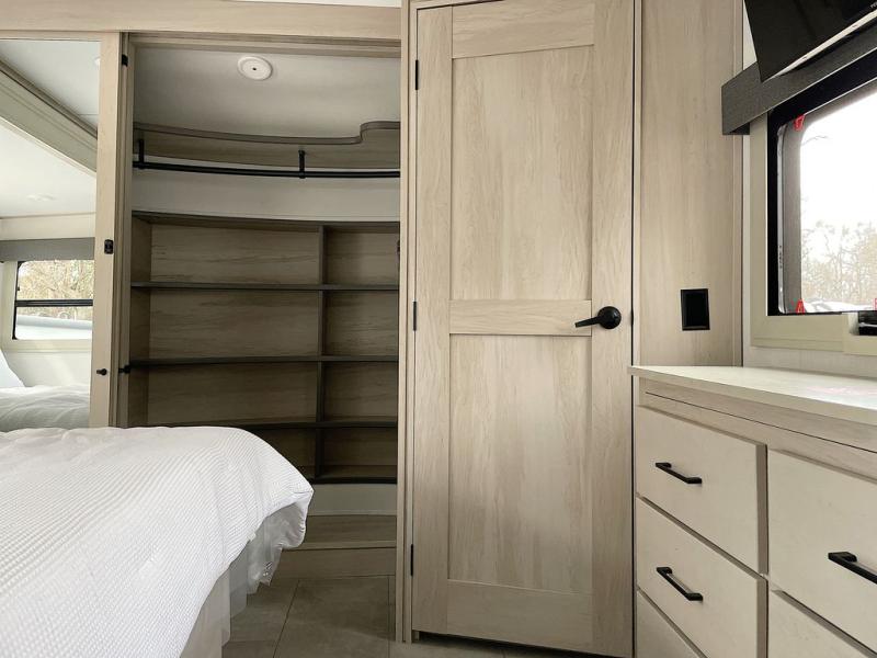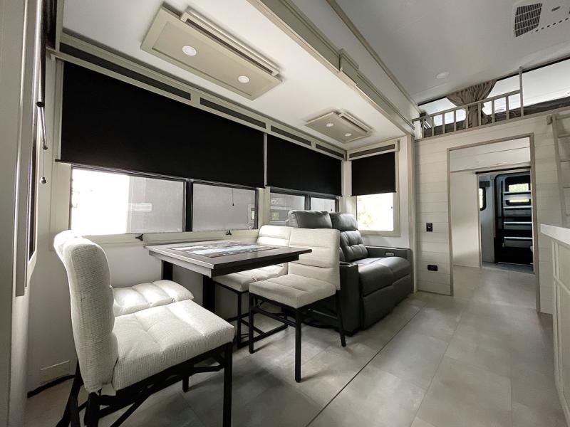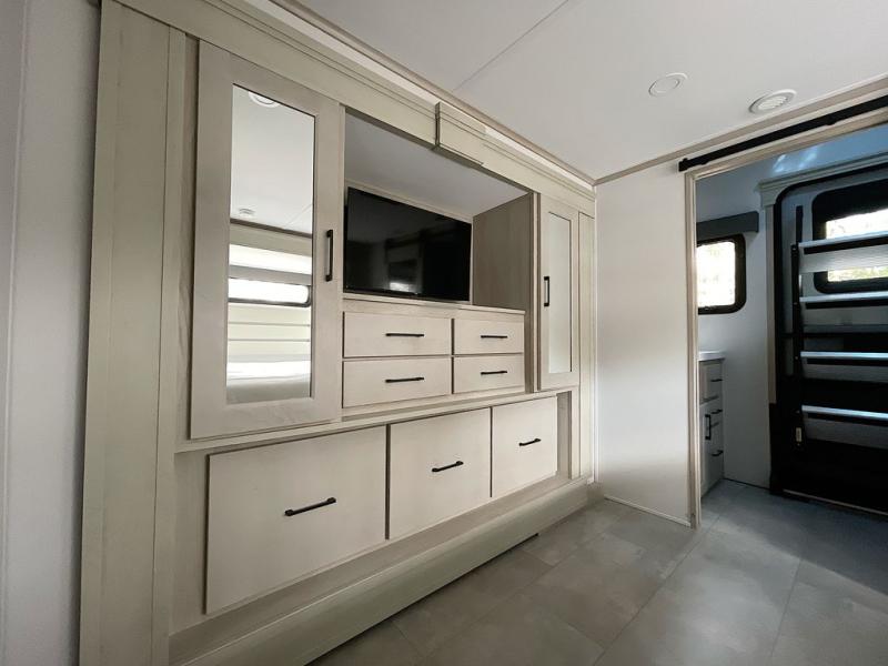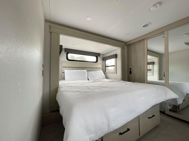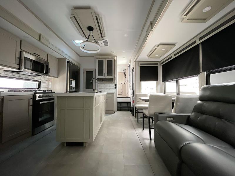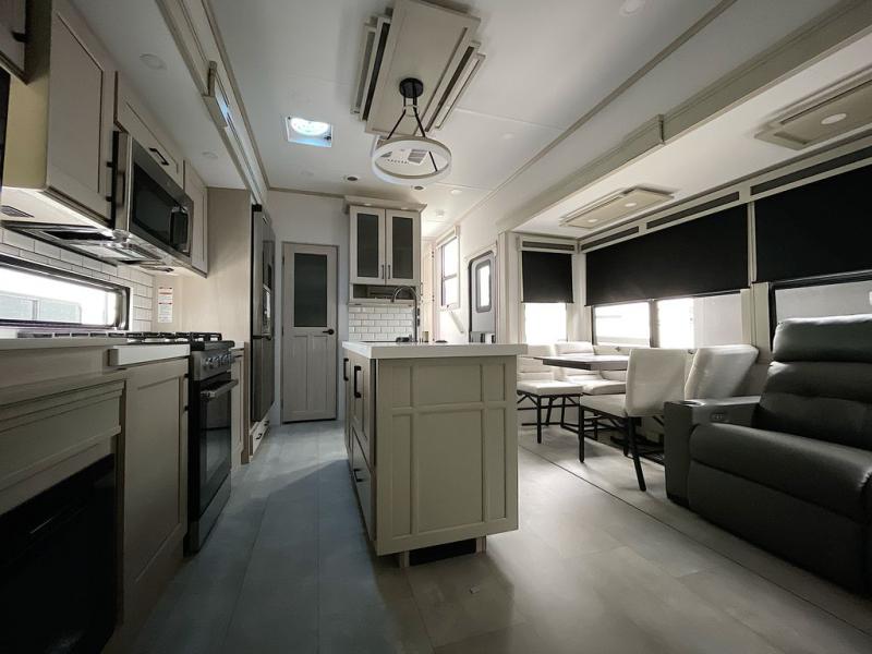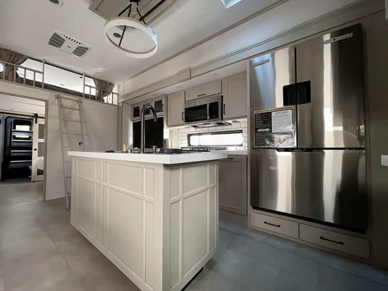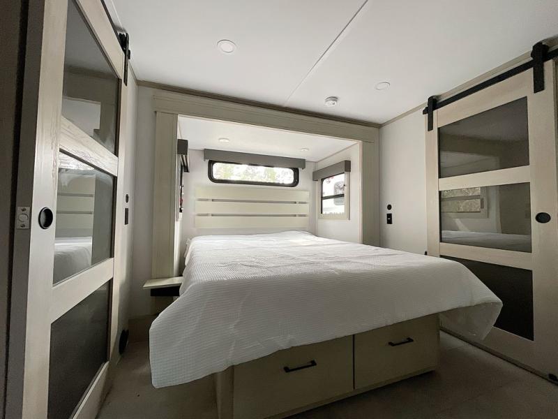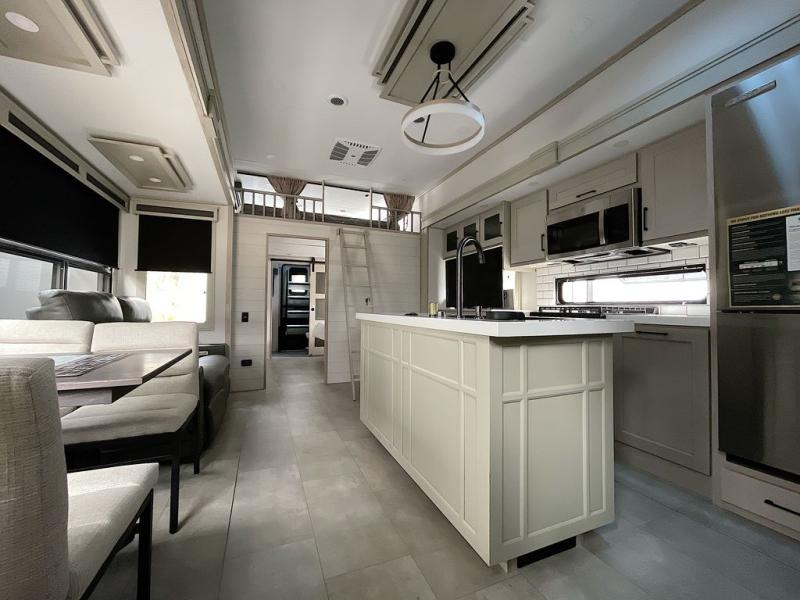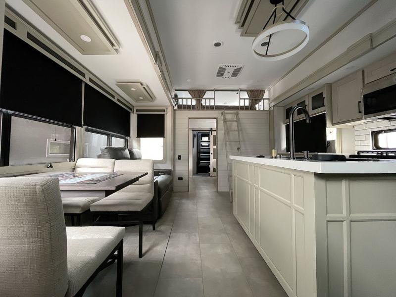 For an affordable luxury extended stay for your family, this Solitude is it! Two private bedrooms plus an overhead Sky Suite loft above the rear bedroom which also has it's own private rear entry/exit door is just the beginning of what is in store for your camping convenience. The upscale kitchen features an island with dishwasher prep, a smart sink, a 12V 20 cu. ft. refrigerator for your perishables, and a built-in oven. There is also a microwave, pantry, and hutch for your dishes, plus a free standing dinette! You can easily take along extra family and friends with the second private bedroom featuring it's own private bath and entry which is great for another couple, and there is even loft space above this rear private bedroom for added storage or sleeping for children. And, you will find ample storage for clothing and belongings throughout with nice size closets, overhead cabinets, plus loads of outside storage.