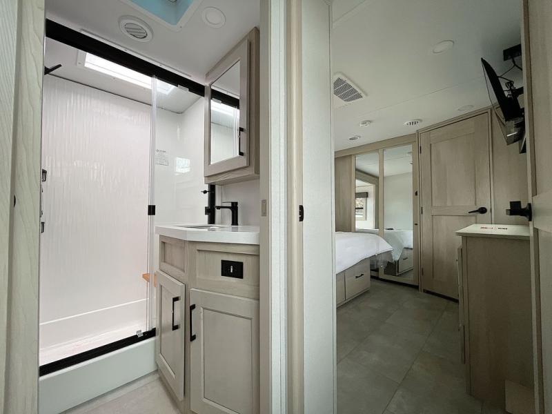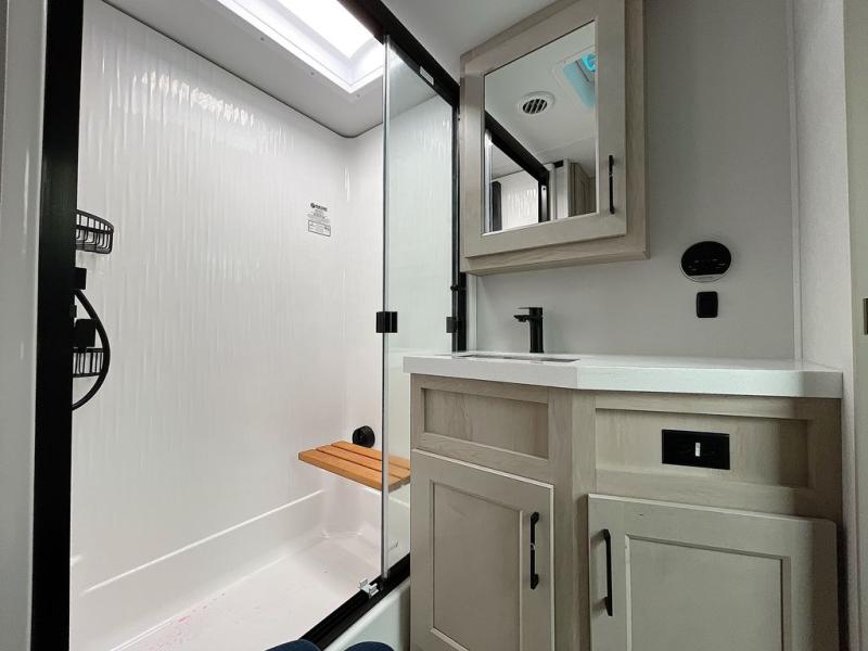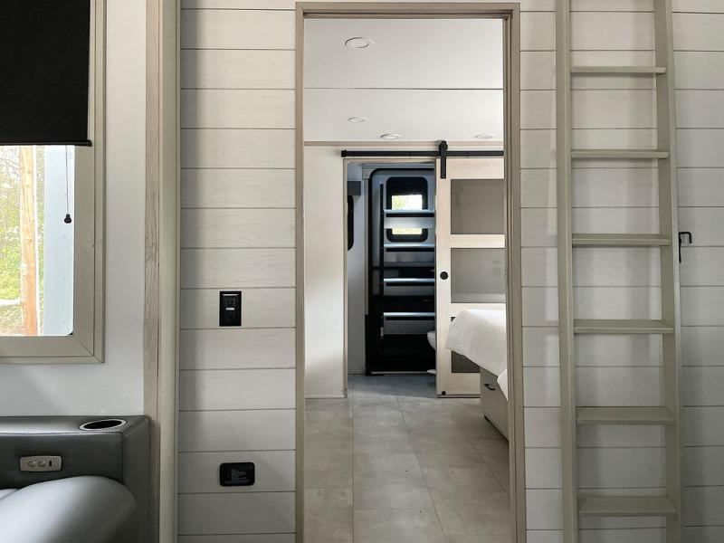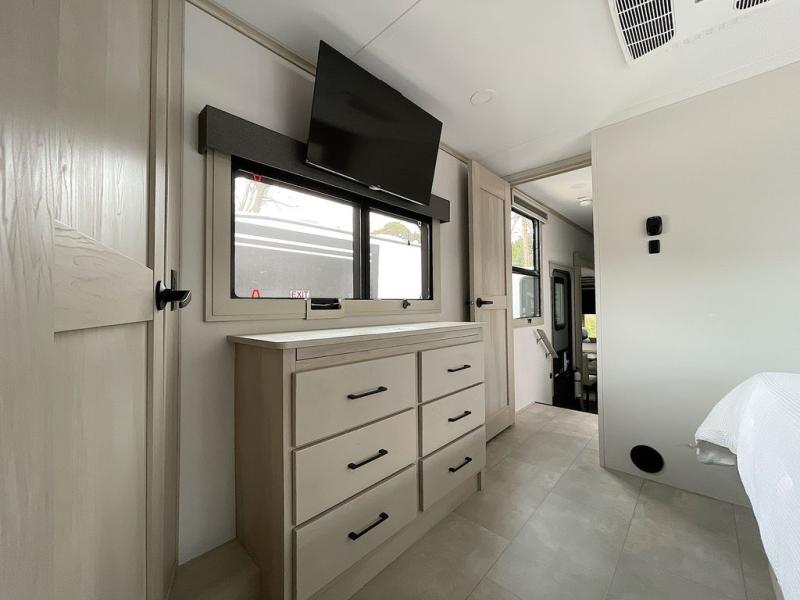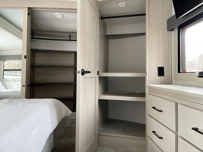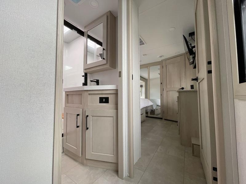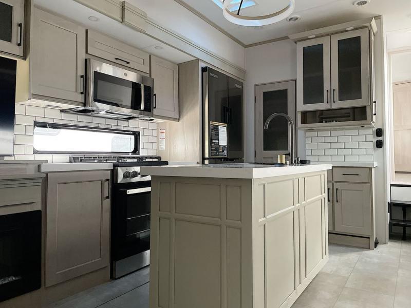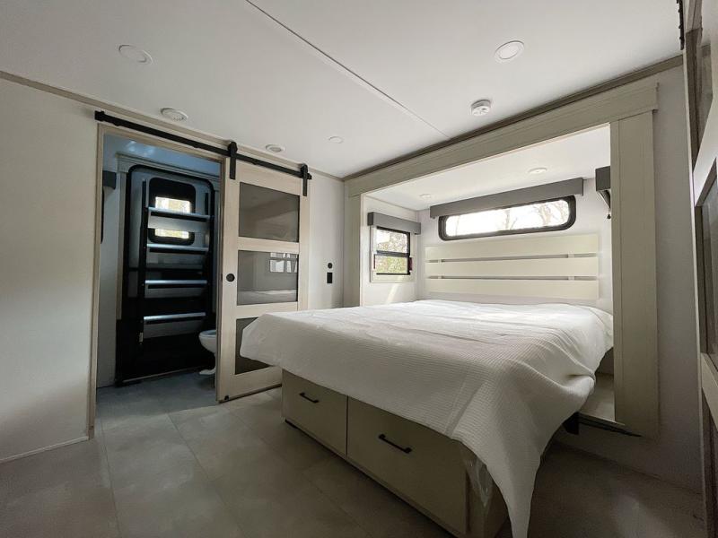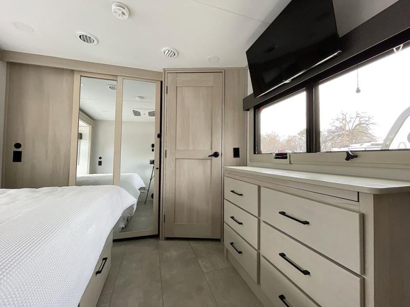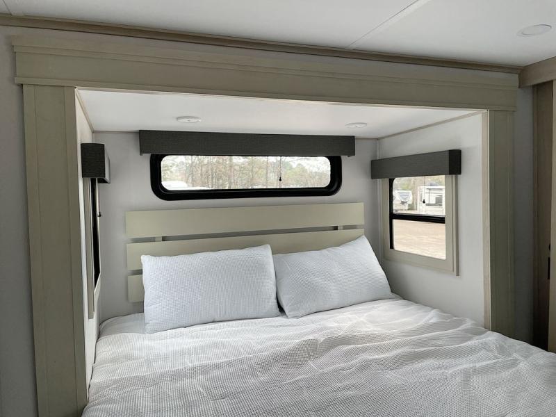 For an affordable luxury extended stay for your family, this Solitude is it! Two private bedrooms plus an overhead Sky Suite loft above the rear bedroom which also has it's own private rear entry/exit door is just the beginning of what is in store for your camping convenience. The upscale kitchen features an island with dishwasher prep, a smart sink, a 12V 20 cu. ft. refrigerator for your perishables, and a built-in oven. There is also a microwave, pantry, and hutch for your dishes, plus a free standing dinette! You can easily take along extra family and friends with the second private bedroom featuring it's own private bath and entry which is great for another couple, and there is even loft space above this rear private bedroom for added storage or sleeping for children. And, you will find ample storage for clothing and belongings throughout with nice size closets, overhead cabinets, plus loads of outside storage.
