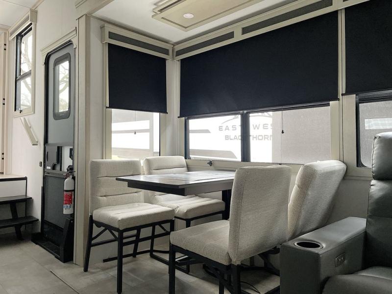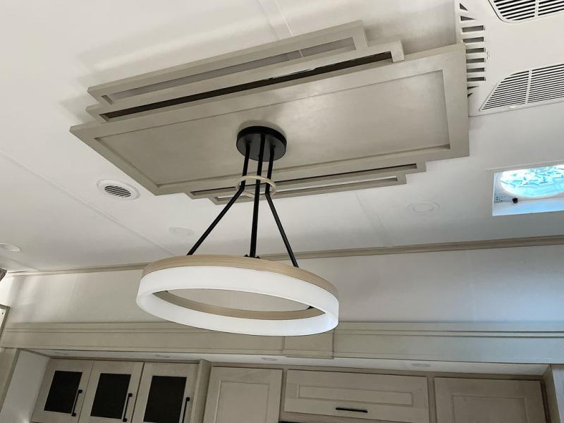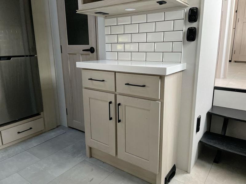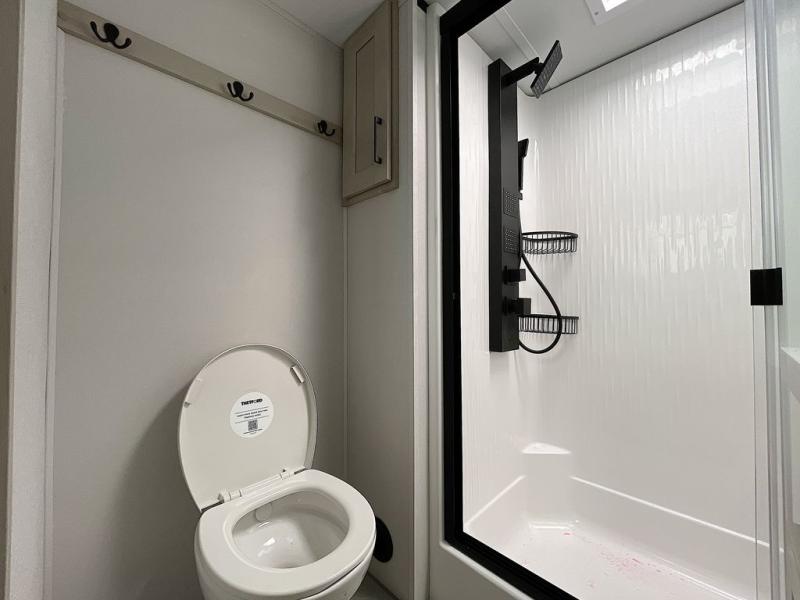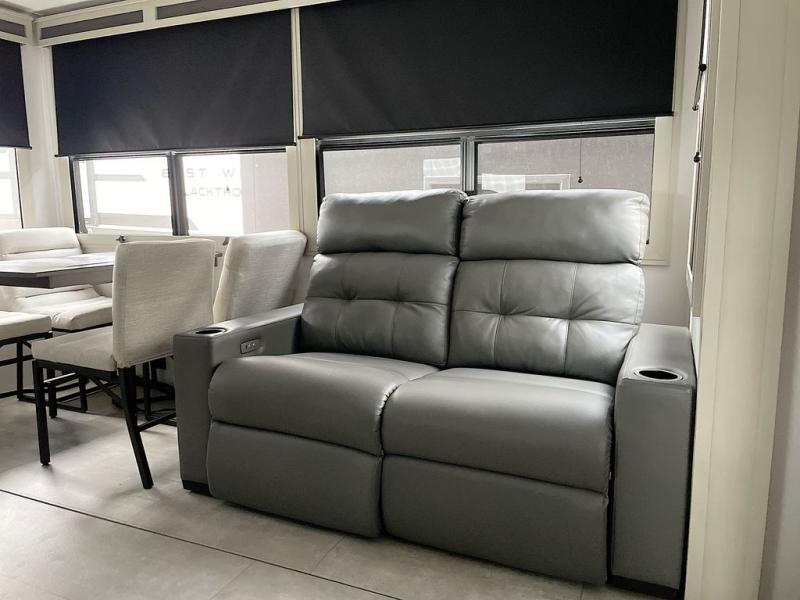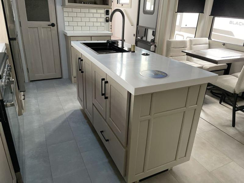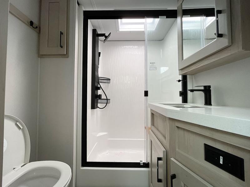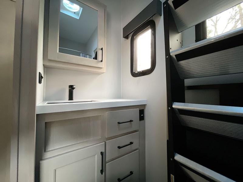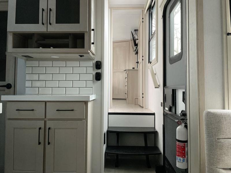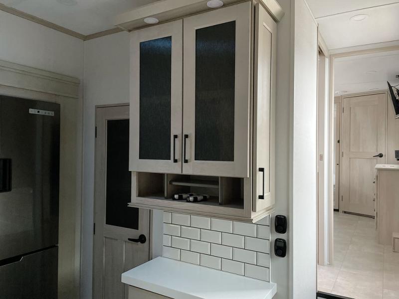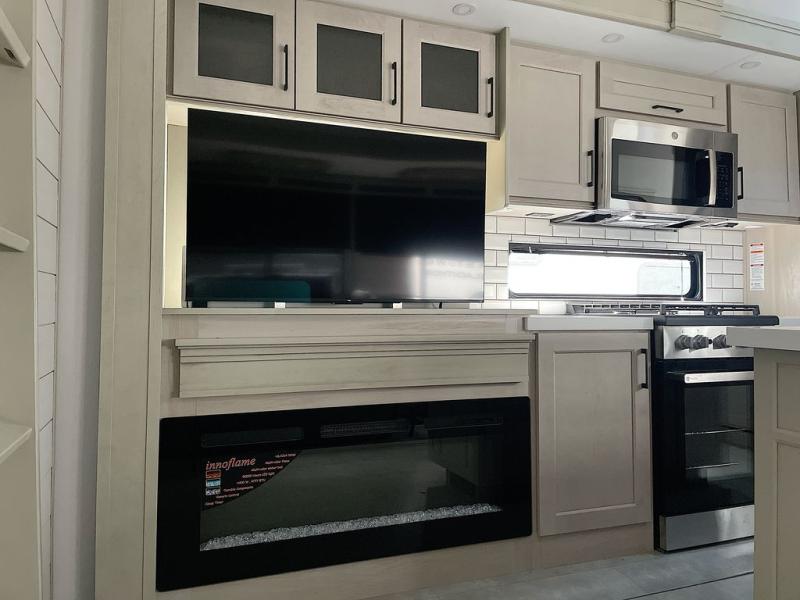 For an affordable luxury extended stay for your family, this Solitude is it! Two private bedrooms plus an overhead Sky Suite loft above the rear bedroom which also has it's own private rear entry/exit door is just the beginning of what is in store for your camping convenience. The upscale kitchen features an island with dishwasher prep, a smart sink, a 12V 20 cu. ft. refrigerator for your perishables, and a built-in oven. There is also a microwave, pantry, and hutch for your dishes, plus a free standing dinette! You can easily take along extra family and friends with the second private bedroom featuring it's own private bath and entry which is great for another couple, and there is even loft space above this rear private bedroom for added storage or sleeping for children. And, you will find ample storage for clothing and belongings throughout with nice size closets, overhead cabinets, plus loads of outside storage.