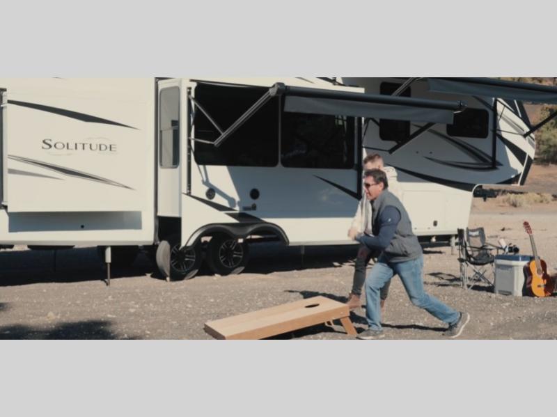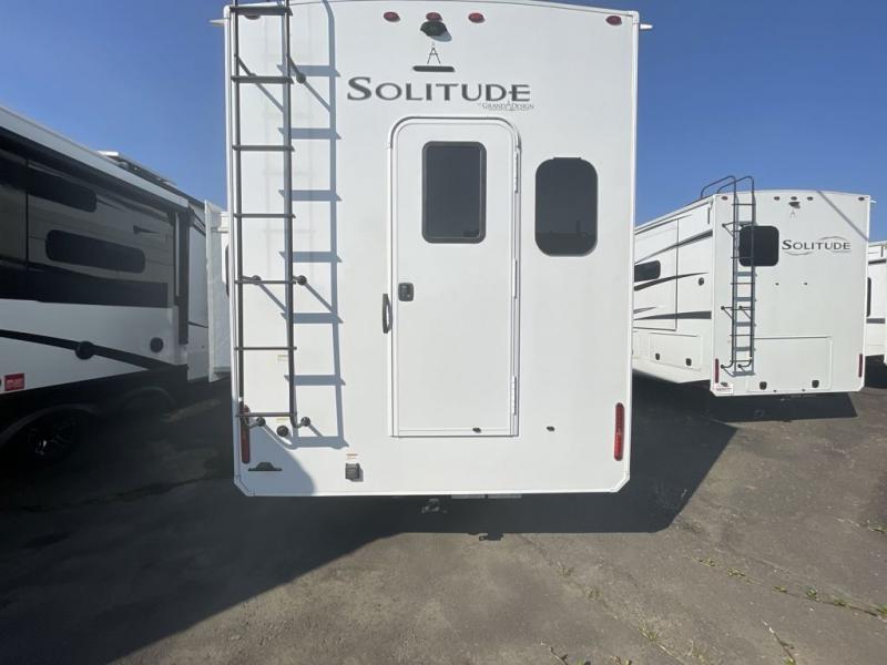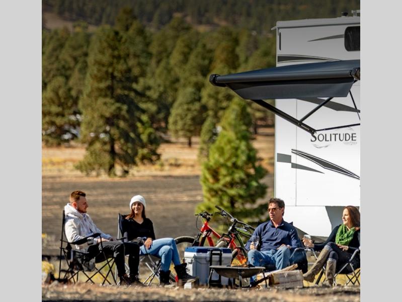 Each Solitude fifth wheel by Grand Design features a 101" wide-body construction, heavy duty 8,000 lb. axles, frameless tinted windows, and high-gloss gel coat sidewalls. You can camp year around thanks to the Weather-Tek Package that includes a 35K BTU high-capacity furnace, an all-in-one enclosed and heated utility center, and a fully enclosed underbelly with heated tanks and storage. Inside, you'll love the premium roller shades, hardwood cabinet doors, solid surface countertops, plus residential finishes throughout to make you truly feel at home. Each model also includes a MORryde CRE3000 suspension system, self adjusting brakes, and a MORryde pin box that will provide smooth towing from home to campground. Affordable luxury is possible with the Solitude fifth wheels; choose yours today!