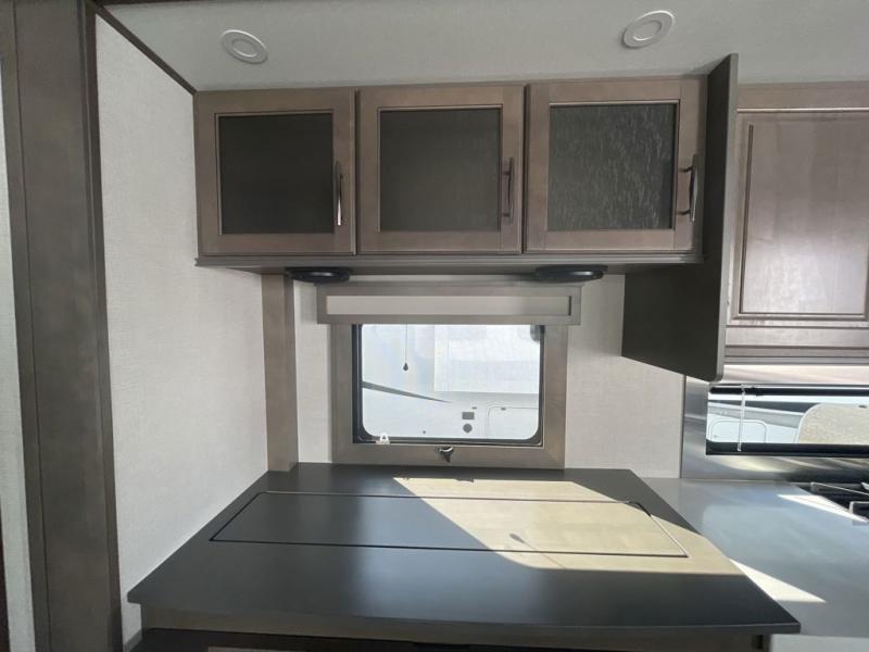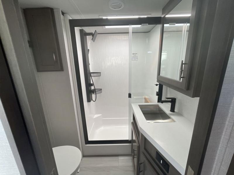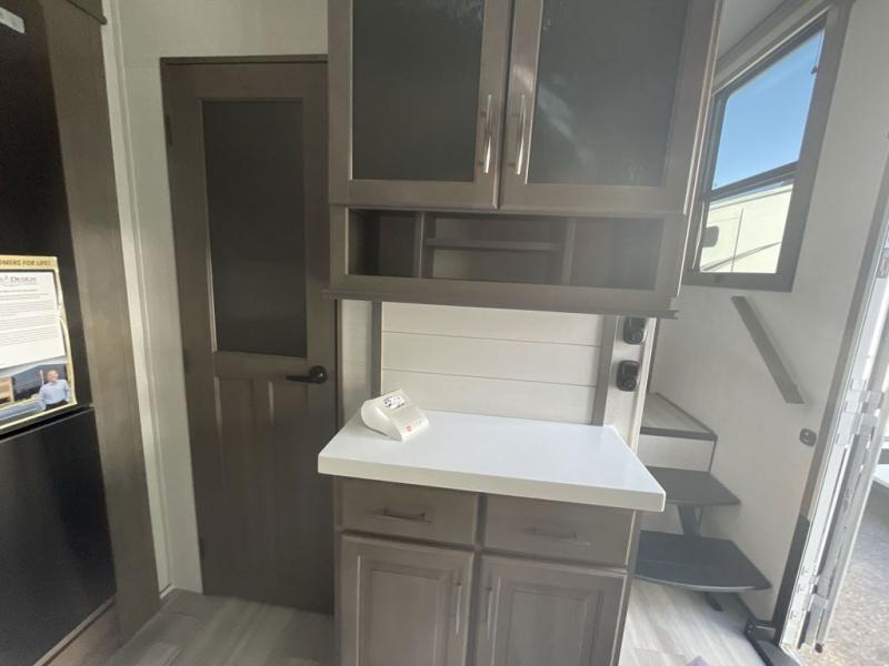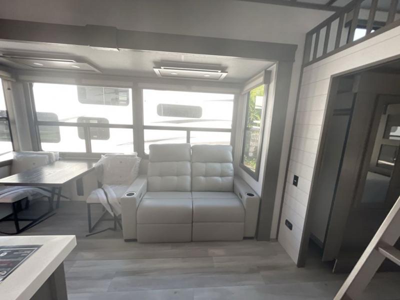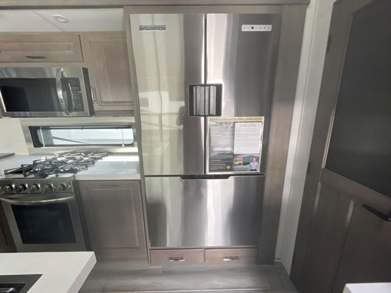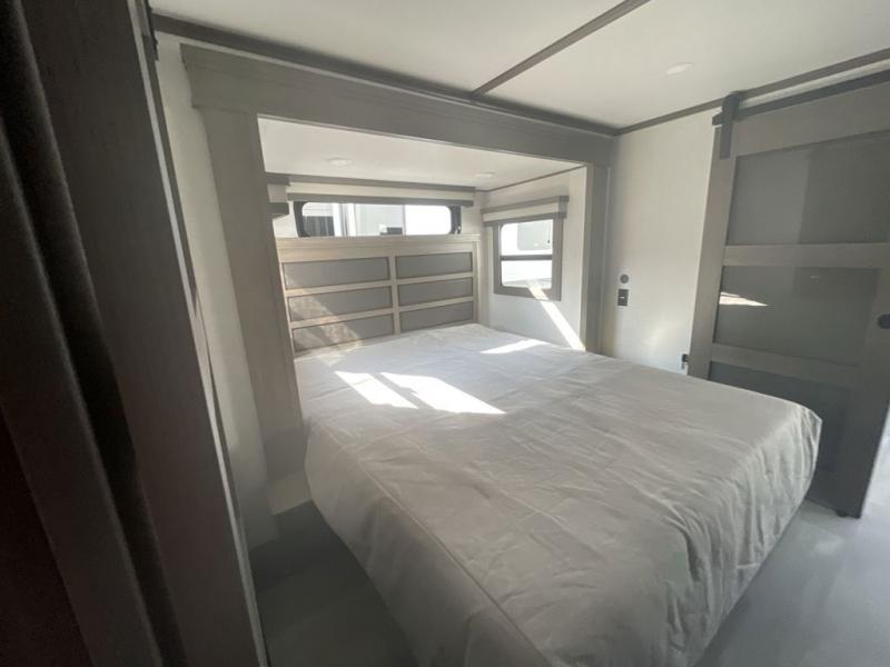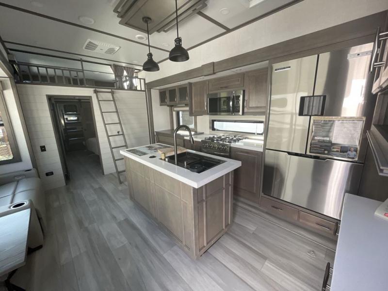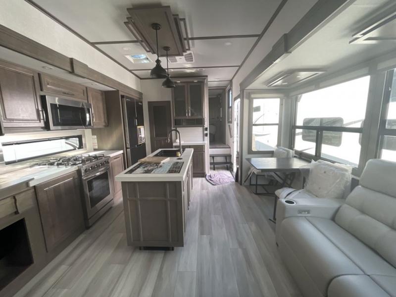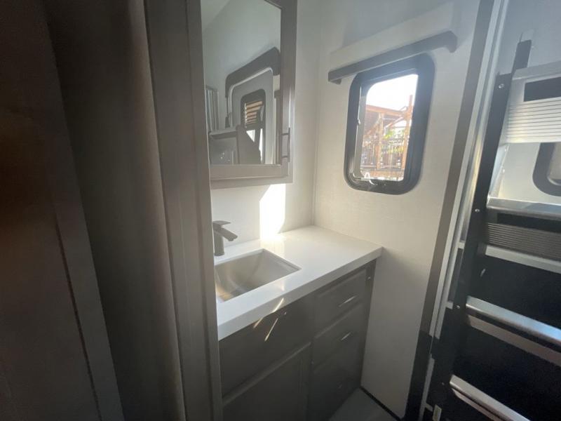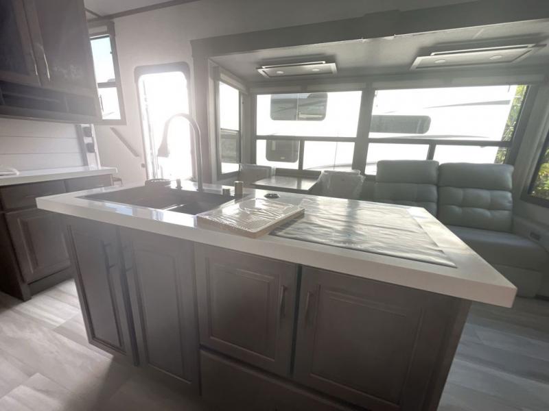 For an affordable luxury extended stay for your family, this Solitude is it! Two private bedrooms plus an overhead Sky Suite loft above the rear bedroom which also has it's own private rear entry/exit door is just the beginning of what is in store for your camping convenience. The upscale kitchen features an island with dishwasher prep, a smart sink, a 12V 20 cu. ft. refrigerator for your perishables, and a built-in oven. There is also a microwave, pantry, and hutch for your dishes, plus a free standing dinette! You can easily take along extra family and friends with the second private bedroom featuring it's own private bath and entry which is great for another couple, and there is even loft space above this rear private bedroom for added storage or sleeping for children. And, you will find ample storage for clothing and belongings throughout with nice size closets, overhead cabinets, plus loads of outside storage.