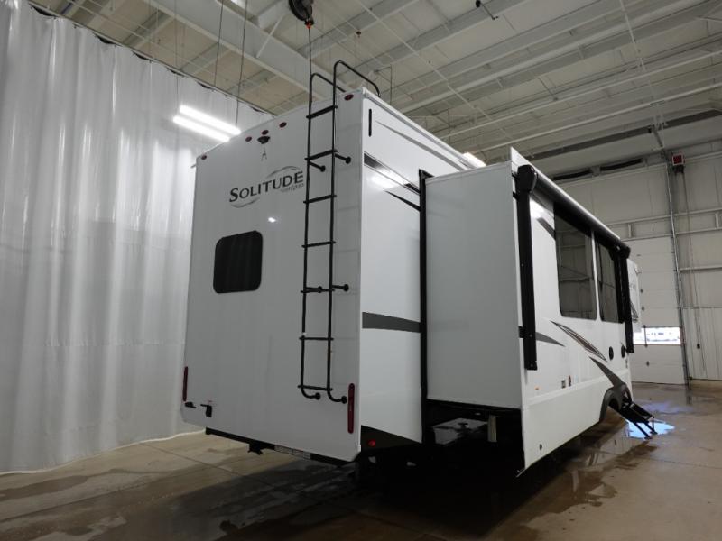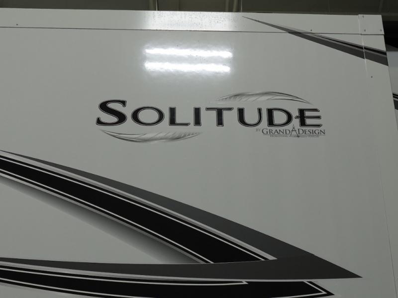 Each Solitude fifth wheel by Grand Design features a 101" wide-body construction, heavy duty 8,000 lb. axles, frameless tinted windows, and high-gloss gel coat sidewalls. You can camp year around thanks to the Weather-Tek Package that includes a 35K BTU high-capacity furnace, an all-in-one enclosed and heated utility center, and a fully enclosed underbelly with heated tanks and storage. Inside, you'll love the premium roller shades, hardwood cabinet doors, solid surface countertops, plus residential finishes throughout to make you truly feel at home. Each model also includes a MORryde CRE3000 suspension system, self adjusting brakes, and a MORryde pin box that will provide smooth towing from home to campground. Affordable luxury is possible with the Solitude fifth wheels; choose yours today!