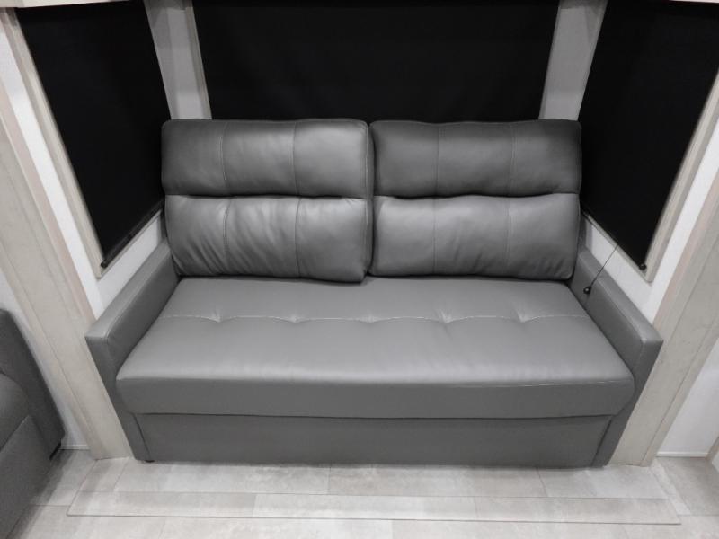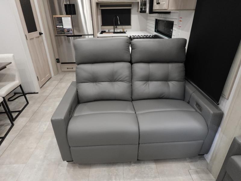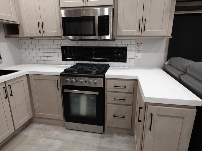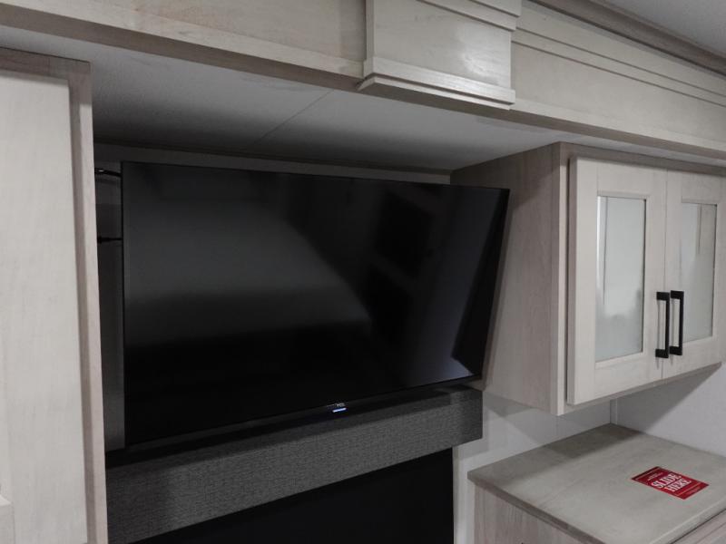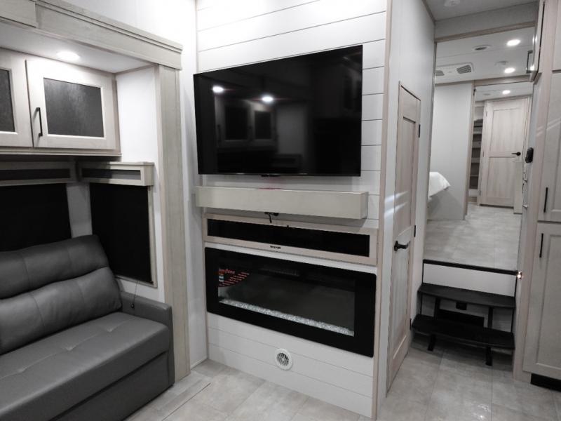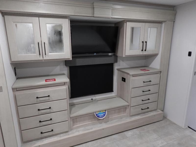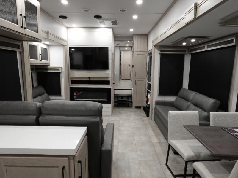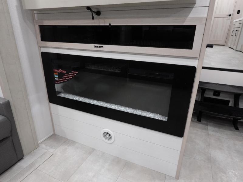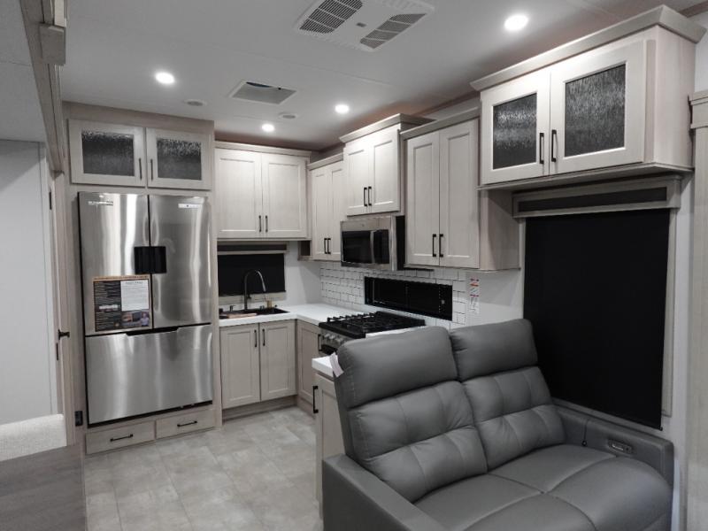 Comfort will come easy in this four slide out fifth wheel! You will feel right at home with a master bedroom that includes a queen bed slide out with a king bed option, dual dressers with a seat in between, plus a large front bath with tons of space. The convenient half bath is right as you enter the unit for convenience. Your crew can get cozy on the dual tri-fold sofas within dual opposing slides, or on the theater seating across from the LED TV and fireplace. One feature you will love about this fifth wheel is the rear kitchen with wrap-around counter space, a built-in oven, plus a 20 cu. ft. 12V refrigerator and a large pantry to keep food fresh.