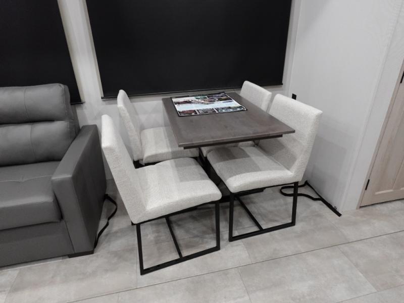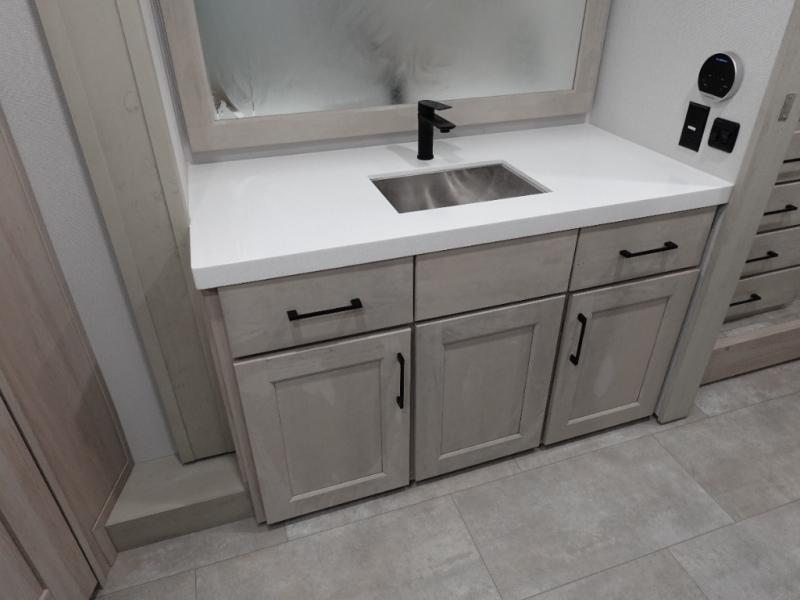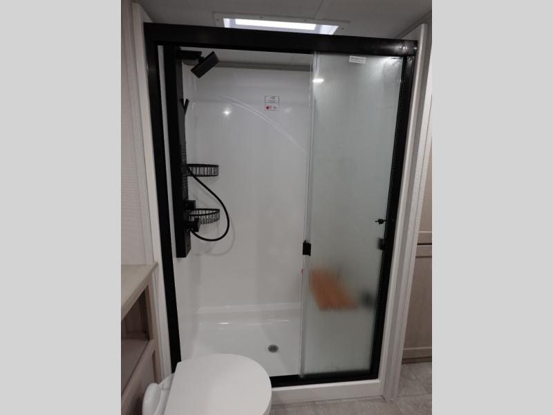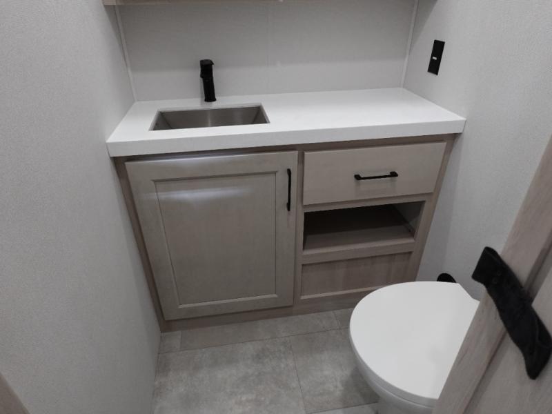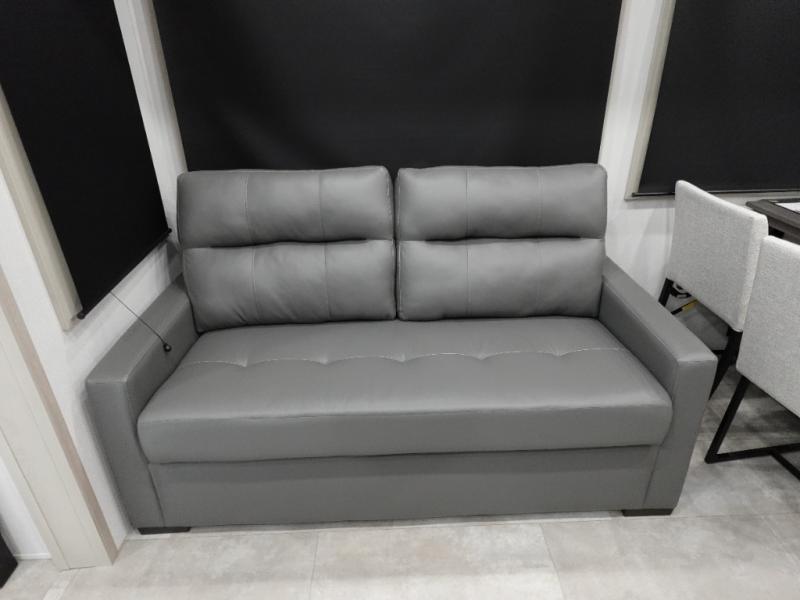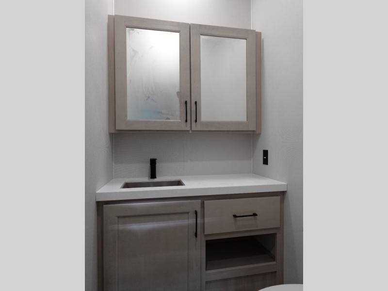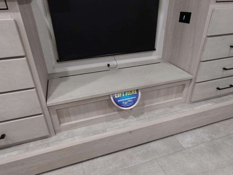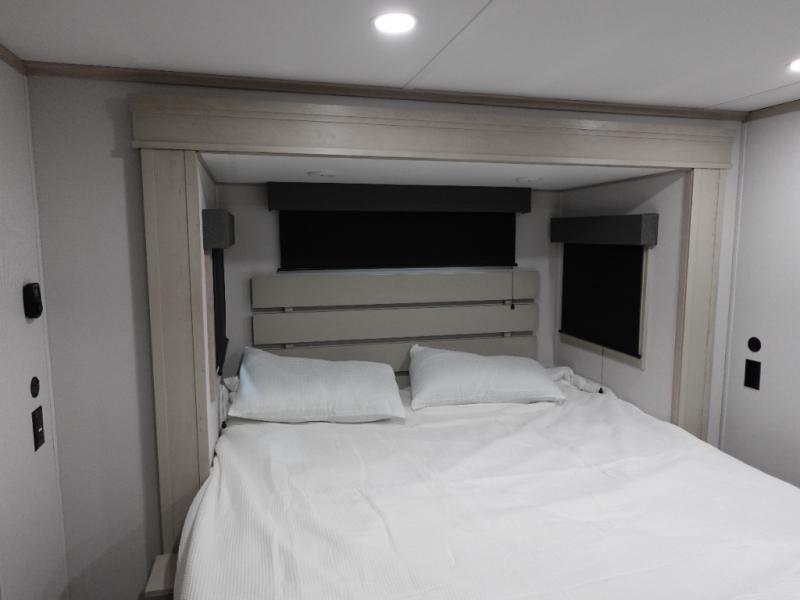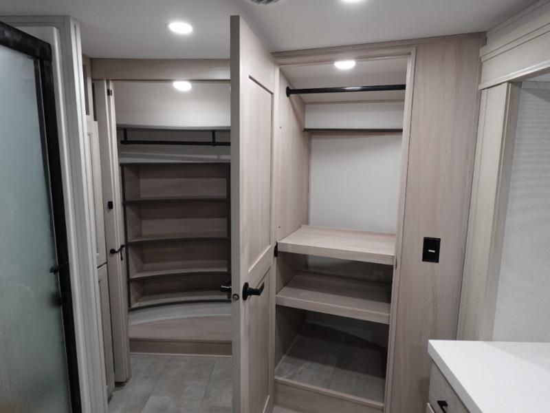 Comfort will come easy in this four slide out fifth wheel! You will feel right at home with a master bedroom that includes a queen bed slide out with a king bed option, dual dressers with a seat in between, plus a large front bath with tons of space. The convenient half bath is right as you enter the unit for convenience. Your crew can get cozy on the dual tri-fold sofas within dual opposing slides, or on the theater seating across from the LED TV and fireplace. One feature you will love about this fifth wheel is the rear kitchen with wrap-around counter space, a built-in oven, plus a 20 cu. ft. 12V refrigerator and a large pantry to keep food fresh.