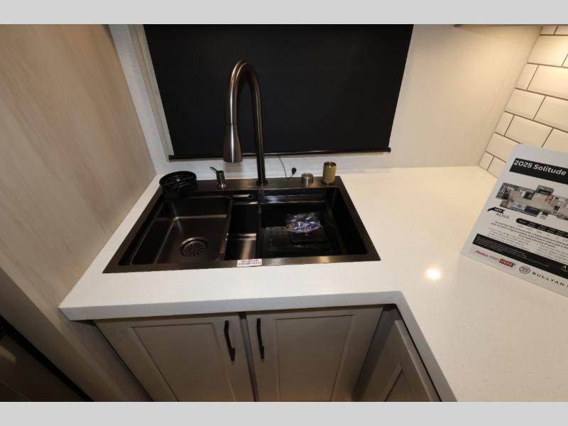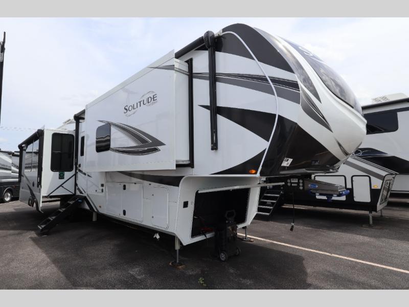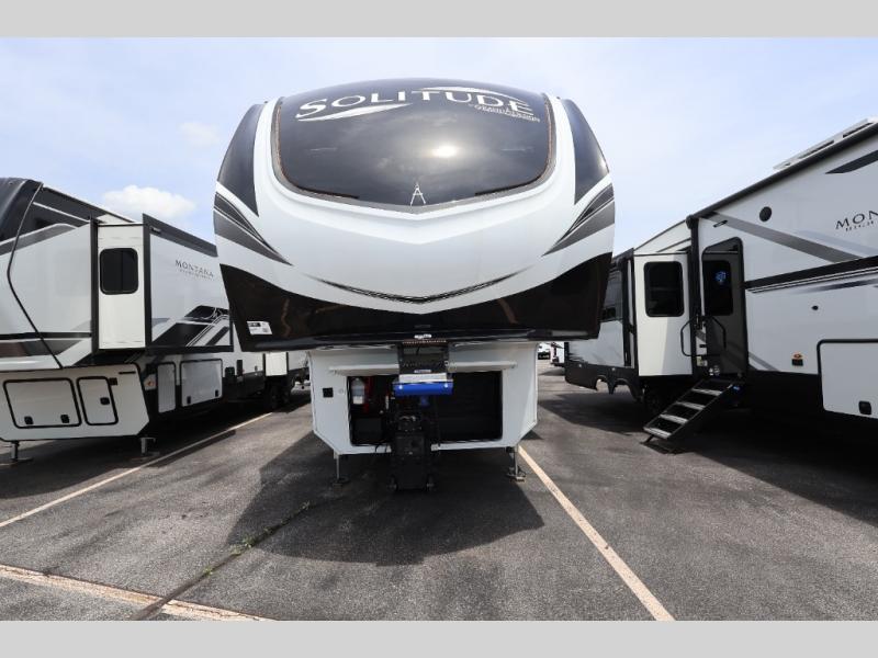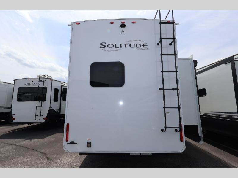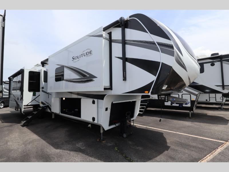 Each Solitude fifth wheel by Grand Design features a 101" wide-body construction, heavy duty 8,000 lb. axles, frameless tinted windows, and high-gloss gel coat sidewalls. You can camp year around thanks to the Weather-Tek Package that includes a 35K BTU high-capacity furnace, an all-in-one enclosed and heated utility center, and a fully enclosed underbelly with heated tanks and storage. Inside, you'll love the premium roller shades, hardwood cabinet doors, solid surface countertops, plus residential finishes throughout to make you truly feel at home. Each model also includes a MORryde CRE3000 suspension system, self adjusting brakes, and a MORryde pin box that will provide smooth towing from home to campground. Affordable luxury is possible with the Solitude fifth wheels; choose yours today!