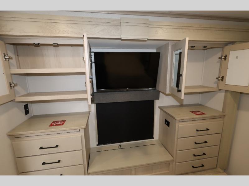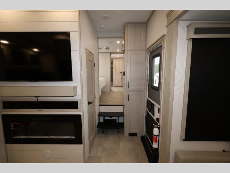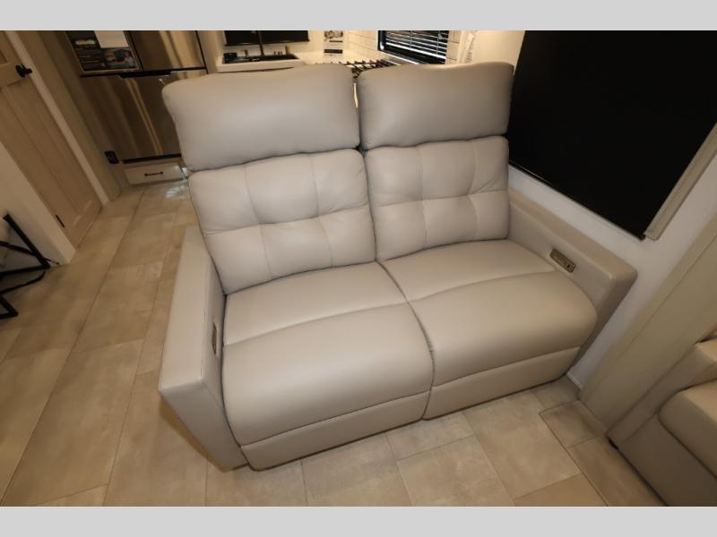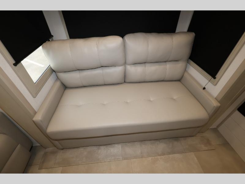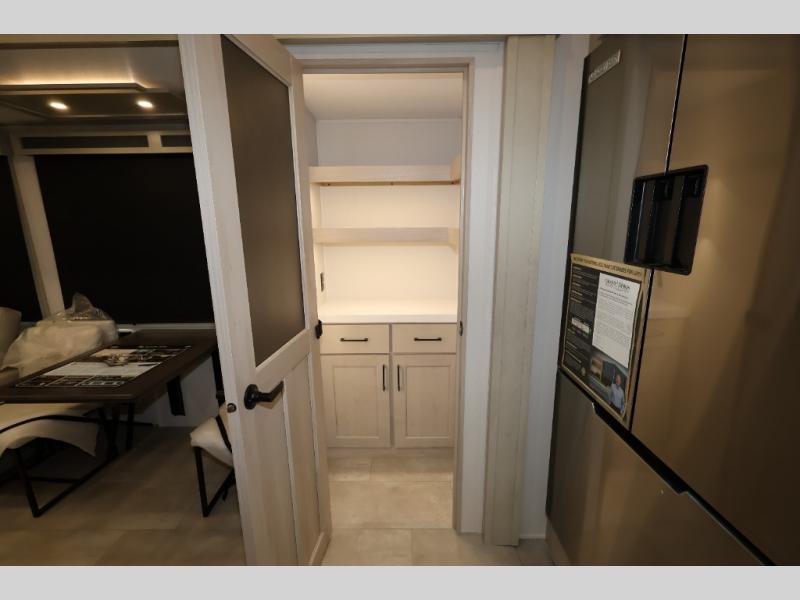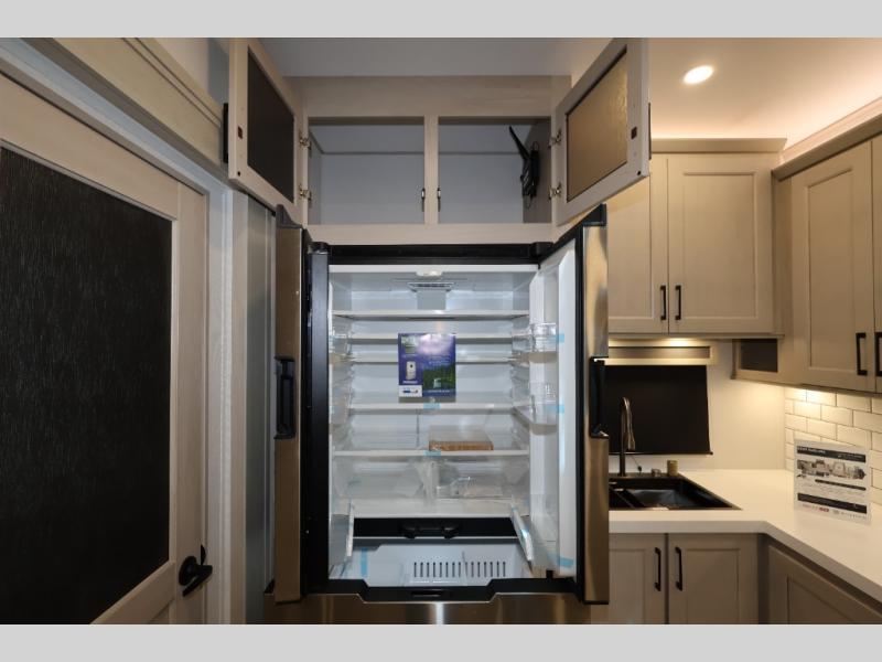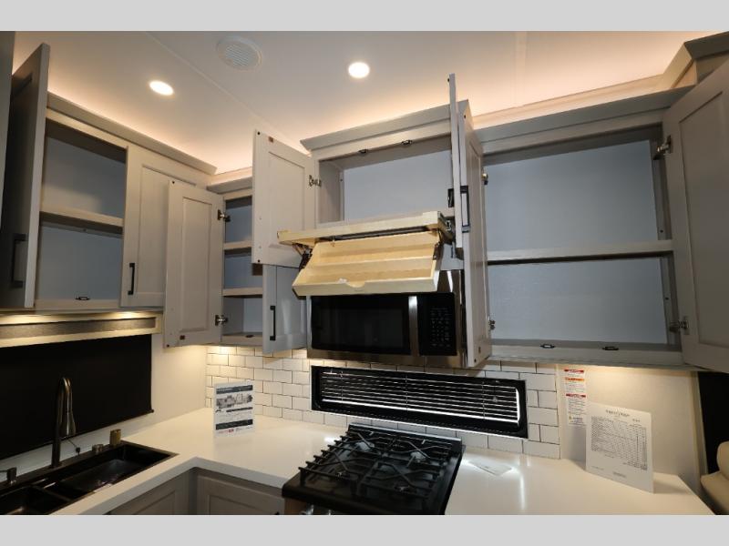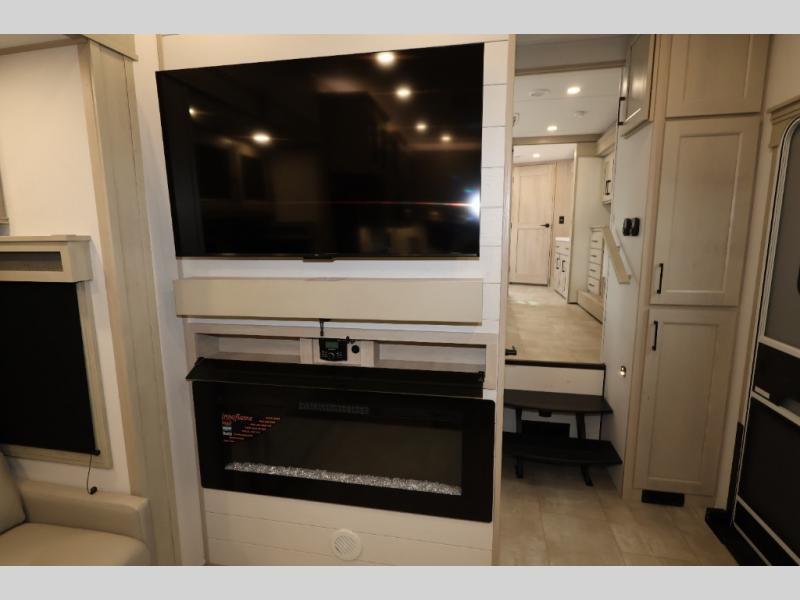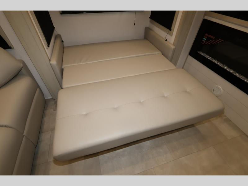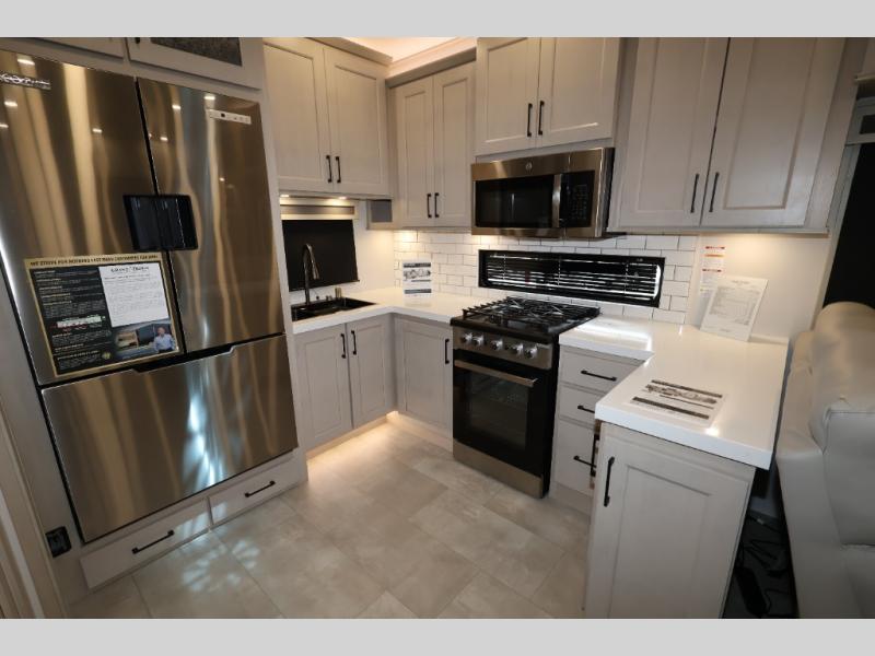 Comfort will come easy in this four slide out fifth wheel! You will feel right at home with a master bedroom that includes a queen bed slide out with a king bed option, dual dressers with a seat in between, plus a large front bath with tons of space. The convenient half bath is right as you enter the unit for convenience. Your crew can get cozy on the dual tri-fold sofas within dual opposing slides, or on the theater seating across from the LED TV and fireplace. One feature you will love about this fifth wheel is the rear kitchen with wrap-around counter space, a built-in oven, plus a 20 cu. ft. 12V refrigerator and a large pantry to keep food fresh.