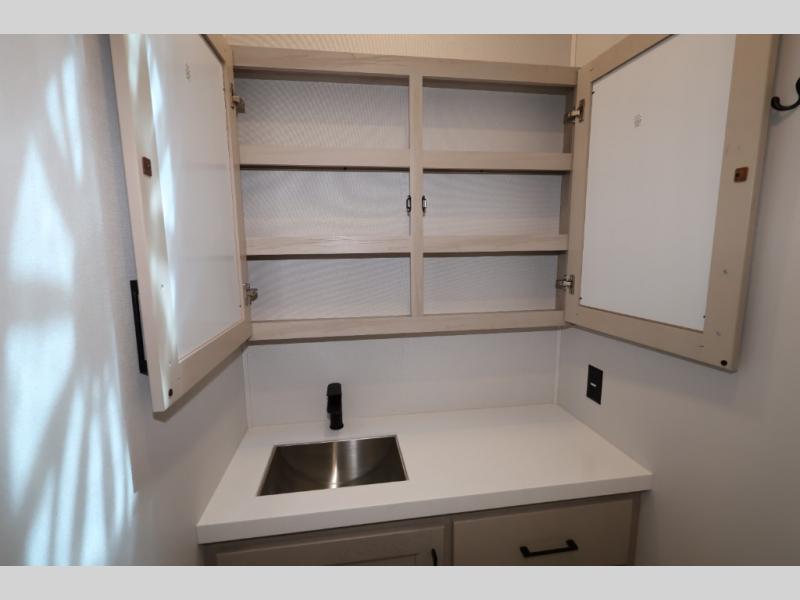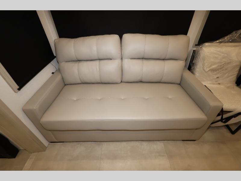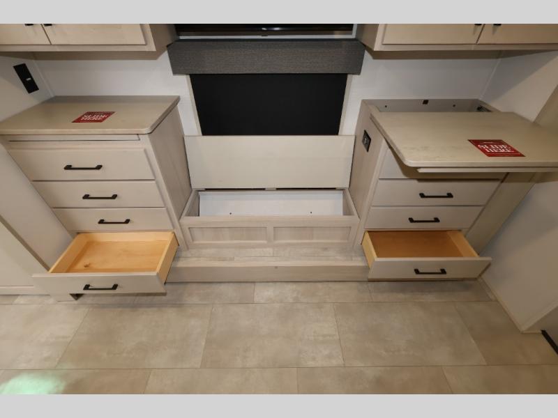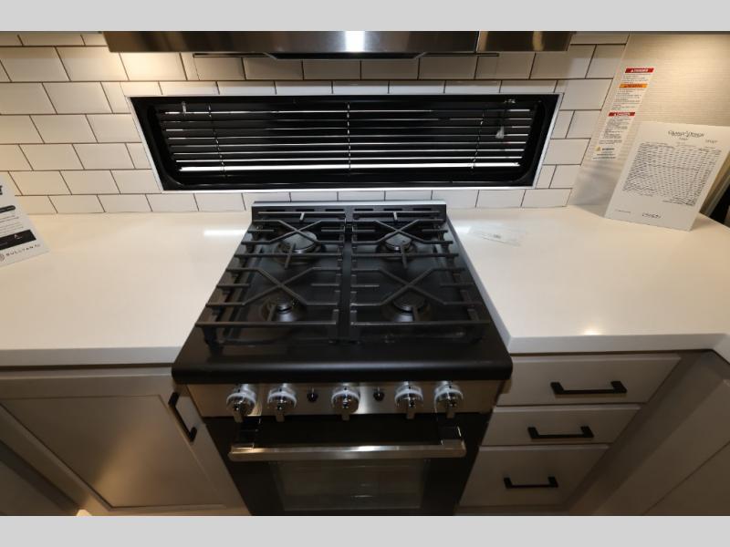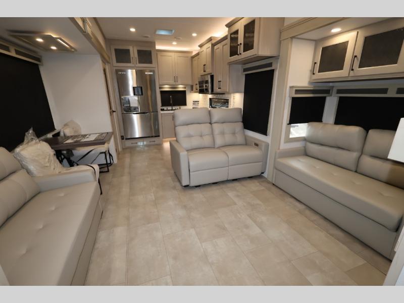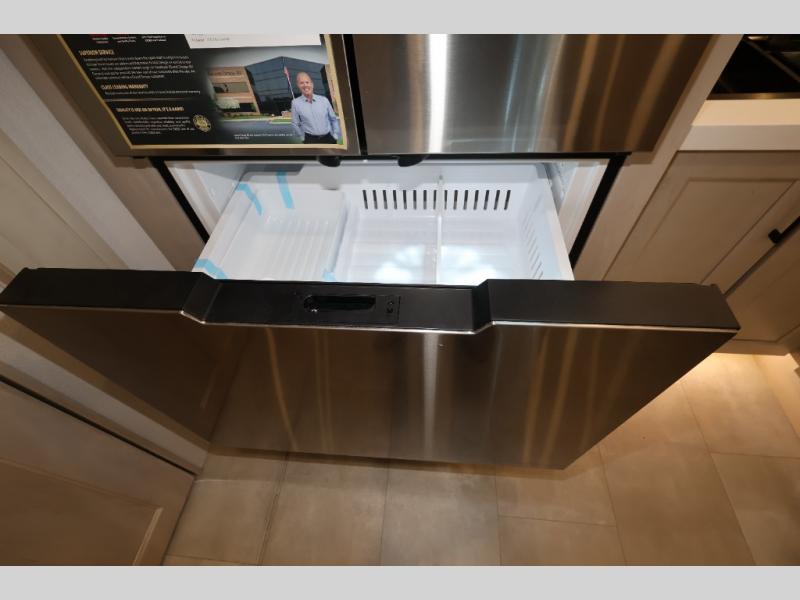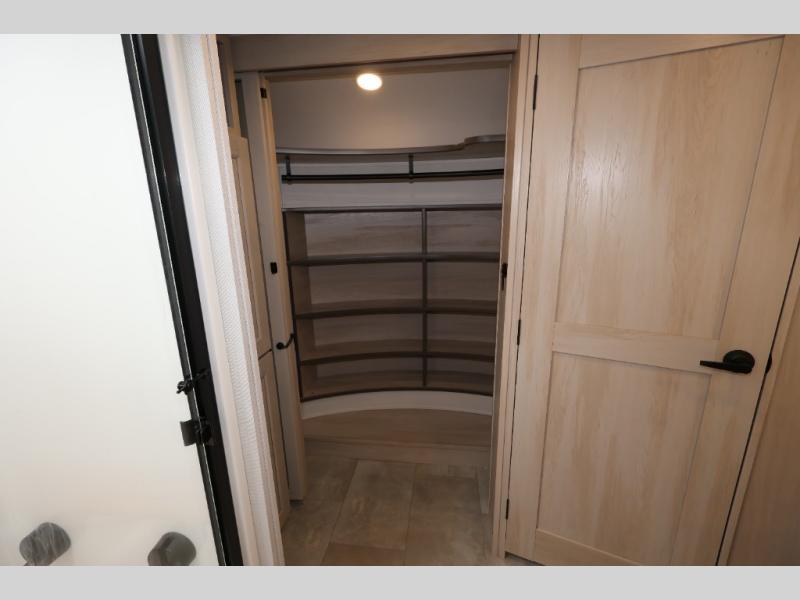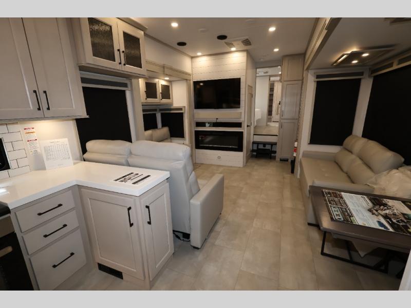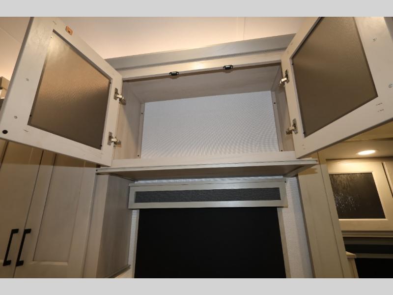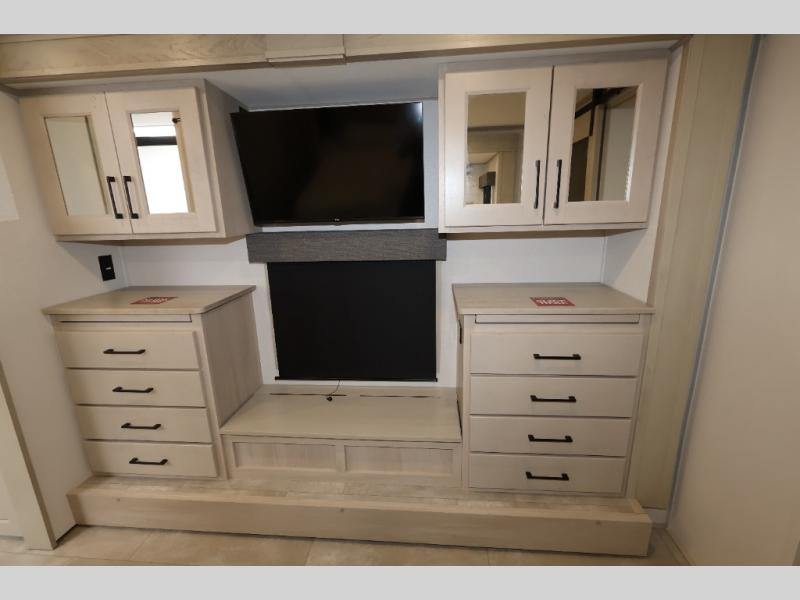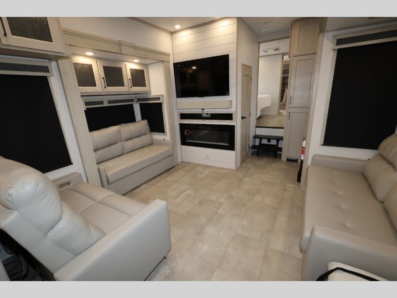 Comfort will come easy in this four slide out fifth wheel! You will feel right at home with a master bedroom that includes a queen bed slide out with a king bed option, dual dressers with a seat in between, plus a large front bath with tons of space. The convenient half bath is right as you enter the unit for convenience. Your crew can get cozy on the dual tri-fold sofas within dual opposing slides, or on the theater seating across from the LED TV and fireplace. One feature you will love about this fifth wheel is the rear kitchen with wrap-around counter space, a built-in oven, plus a 20 cu. ft. 12V refrigerator and a large pantry to keep food fresh.