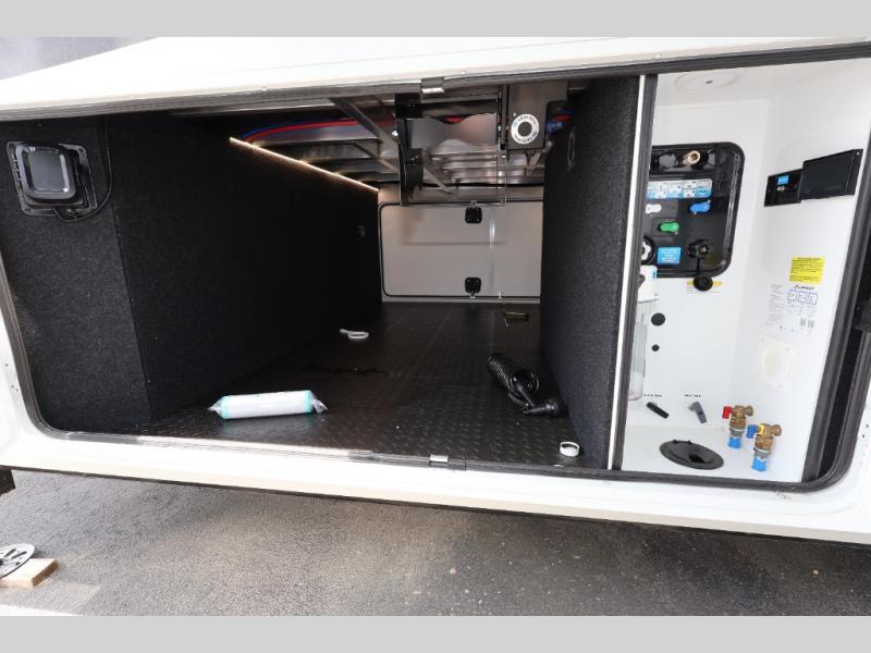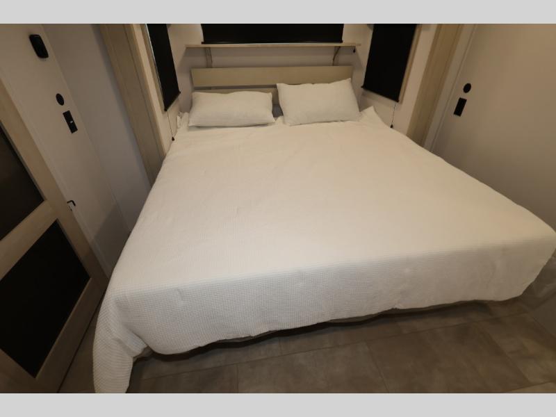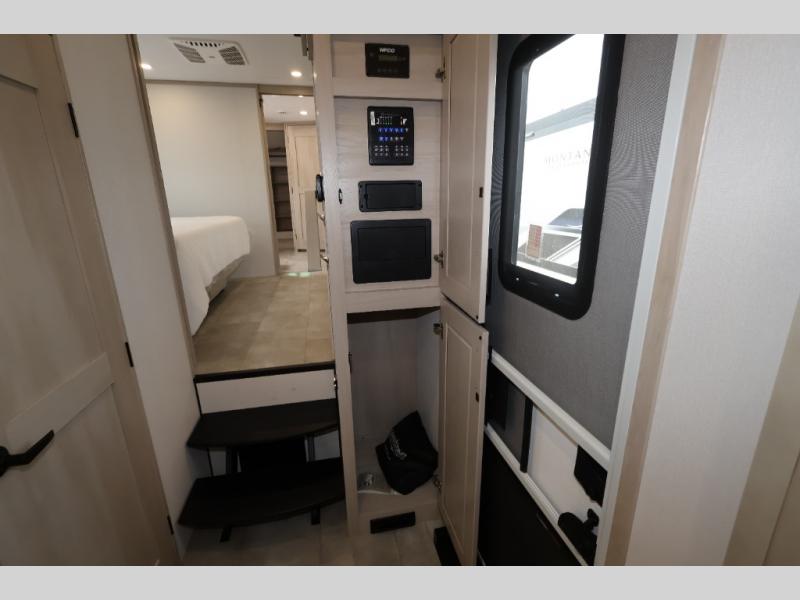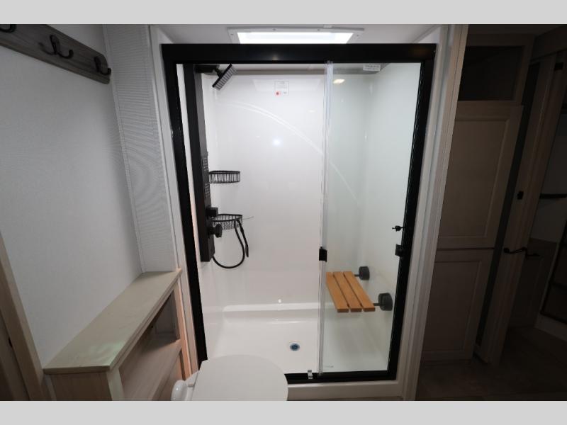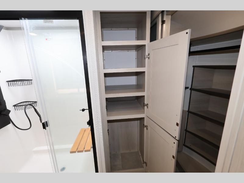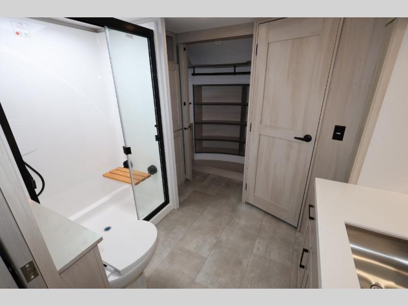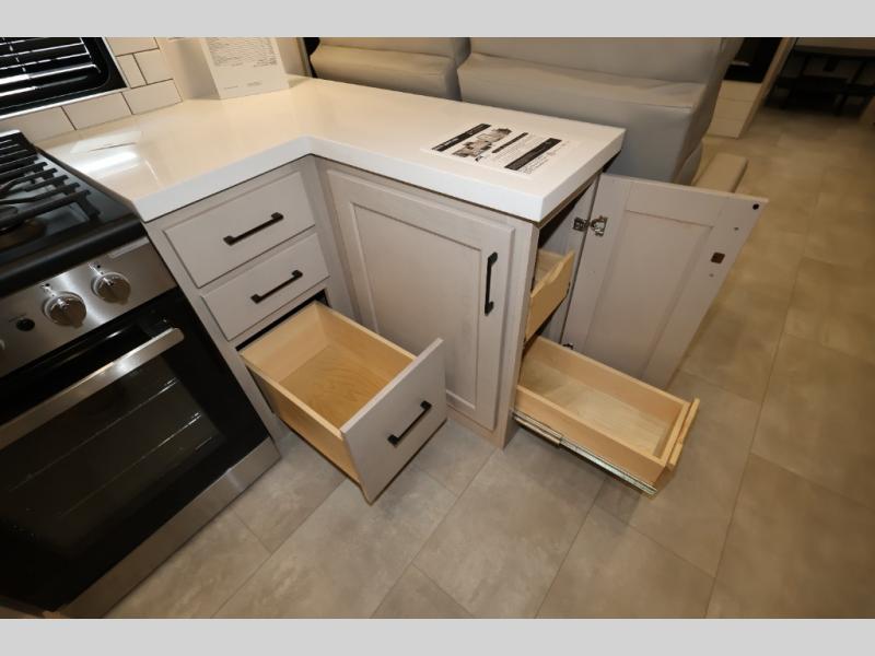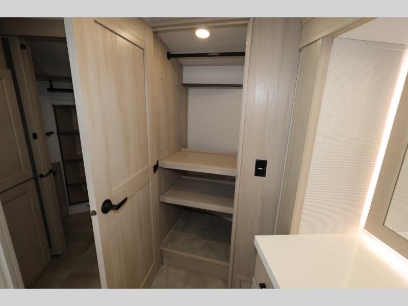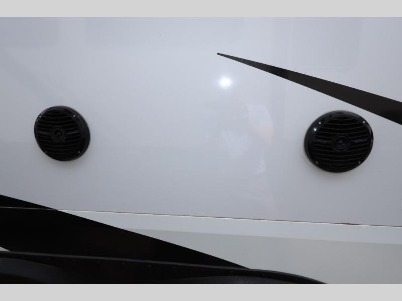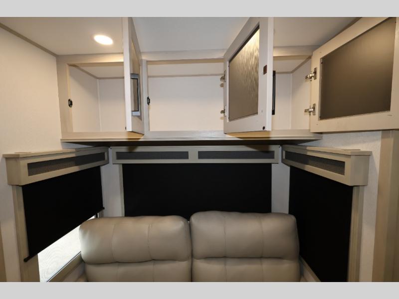 Comfort will come easy in this four slide out fifth wheel! You will feel right at home with a master bedroom that includes a queen bed slide out with a king bed option, dual dressers with a seat in between, plus a large front bath with tons of space. The convenient half bath is right as you enter the unit for convenience. Your crew can get cozy on the dual tri-fold sofas within dual opposing slides, or on the theater seating across from the LED TV and fireplace. One feature you will love about this fifth wheel is the rear kitchen with wrap-around counter space, a built-in oven, plus a 20 cu. ft. 12V refrigerator and a large pantry to keep food fresh.