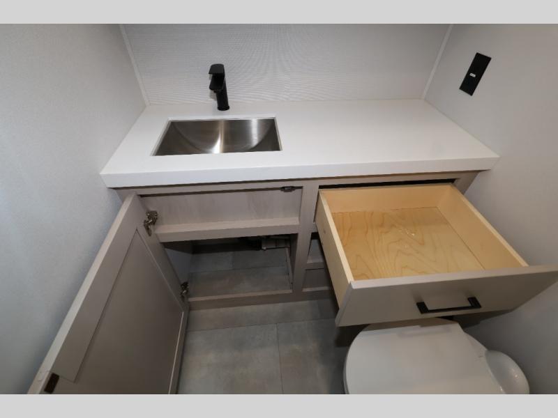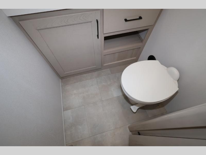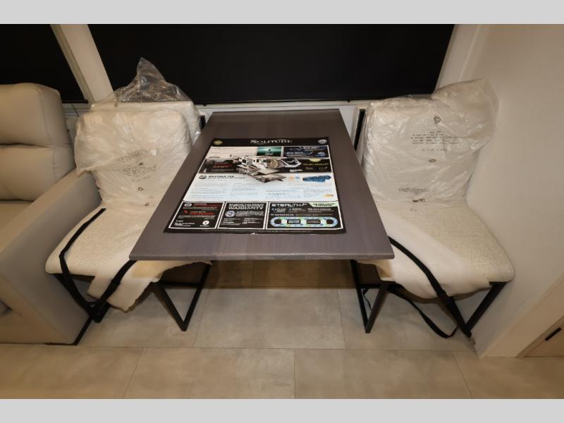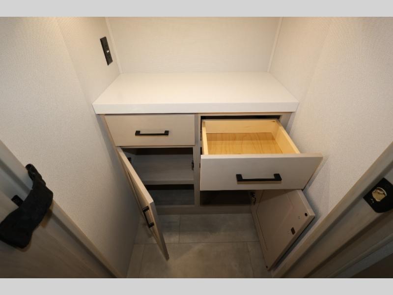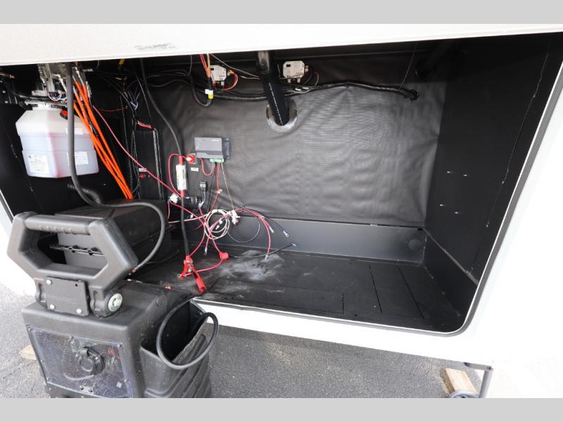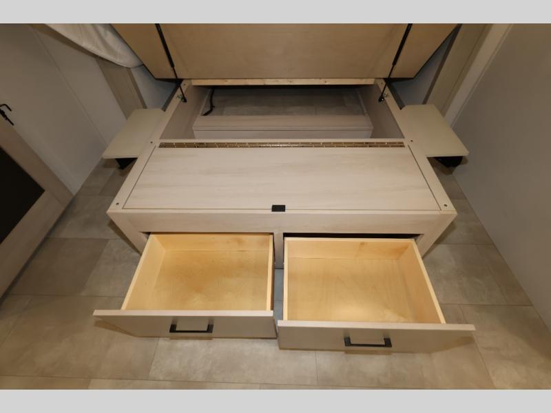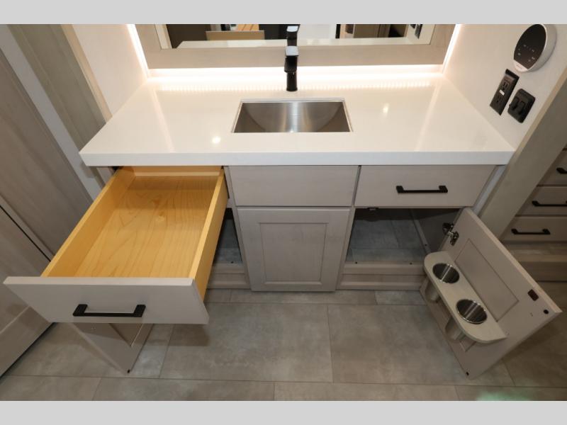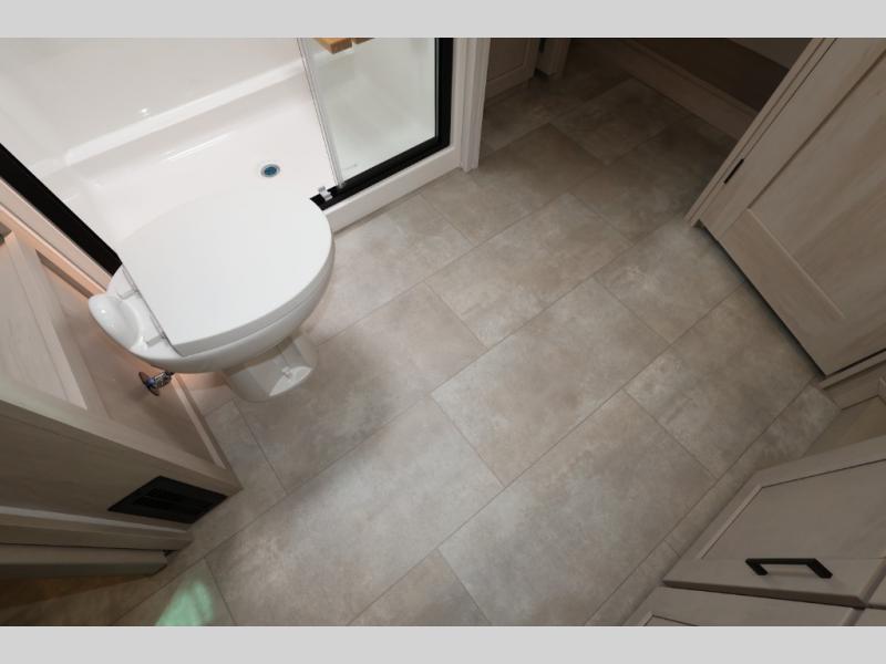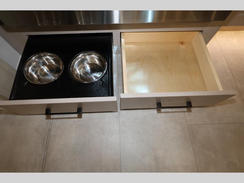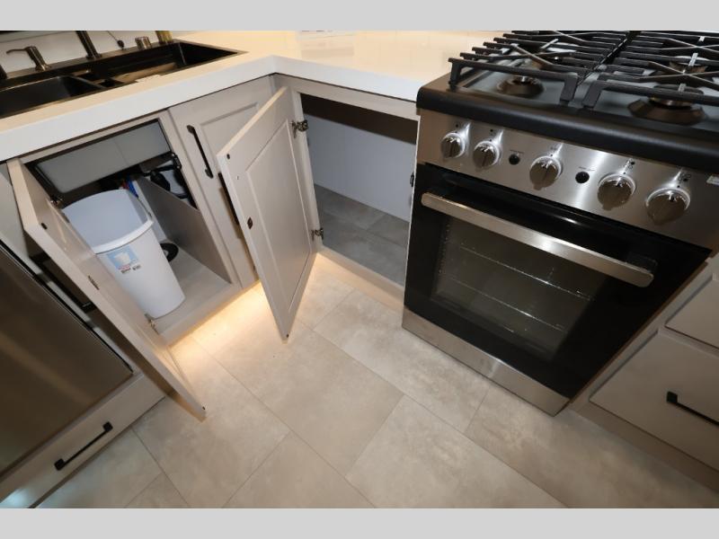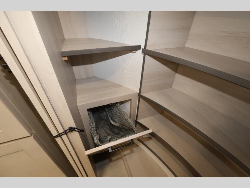 Comfort will come easy in this four slide out fifth wheel! You will feel right at home with a master bedroom that includes a queen bed slide out with a king bed option, dual dressers with a seat in between, plus a large front bath with tons of space. The convenient half bath is right as you enter the unit for convenience. Your crew can get cozy on the dual tri-fold sofas within dual opposing slides, or on the theater seating across from the LED TV and fireplace. One feature you will love about this fifth wheel is the rear kitchen with wrap-around counter space, a built-in oven, plus a 20 cu. ft. 12V refrigerator and a large pantry to keep food fresh.