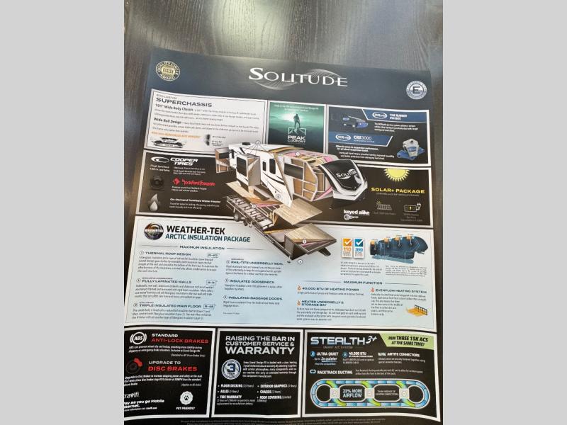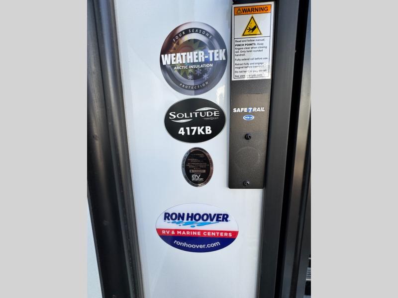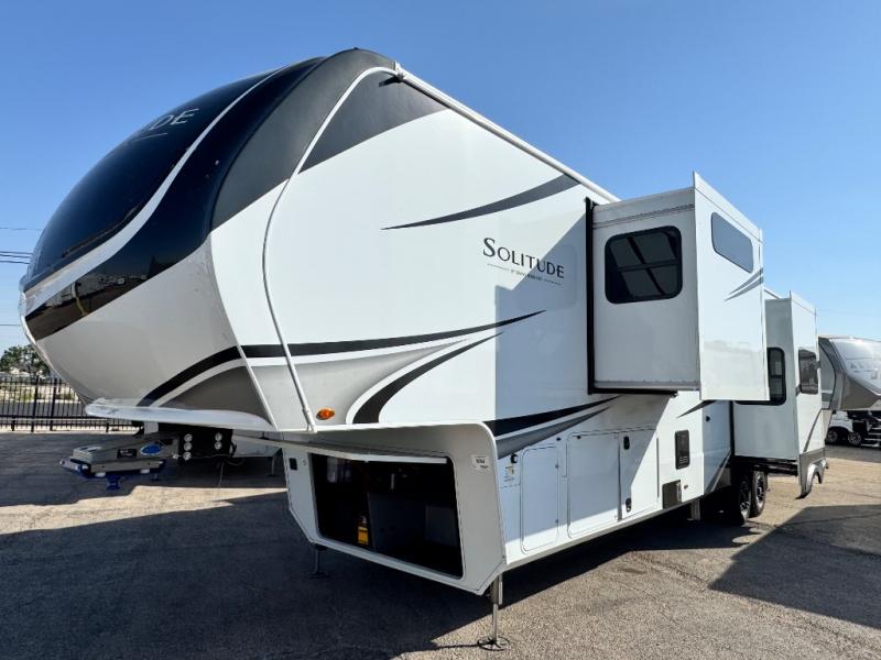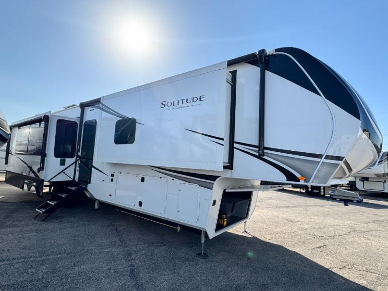 Each Solitude fifth wheel by Grand Design features a 101" wide-body construction, heavy duty 8,000 lb. axles, frameless tinted windows, and high-gloss gel coat sidewalls. You can camp year around thanks to the Weather-Tek Package that includes a 35K BTU high-capacity furnace, an all-in-one enclosed and heated utility center, and a fully enclosed underbelly with heated tanks and storage. Inside, you'll love the premium roller shades, hardwood cabinet doors, solid surface countertops, plus residential finishes throughout to make you truly feel at home. Each model also includes a MORryde CRE3000 suspension system, self adjusting brakes, and a MORryde pin box that will provide smooth towing from home to campground. Affordable luxury is possible with the Solitude fifth wheels; choose yours today!