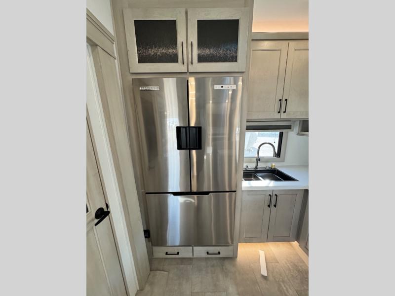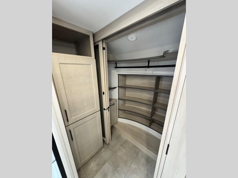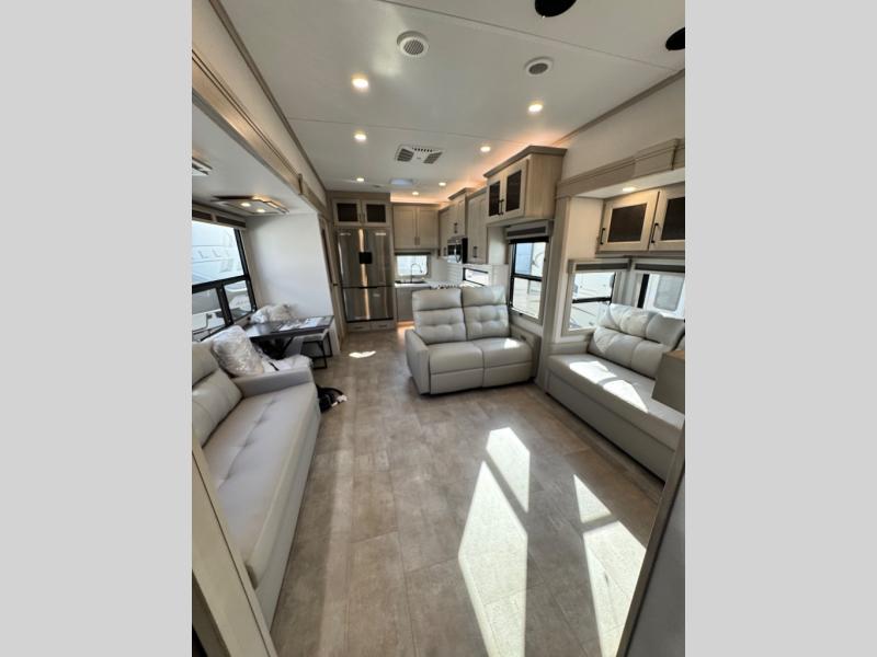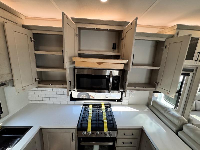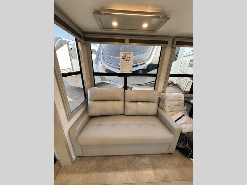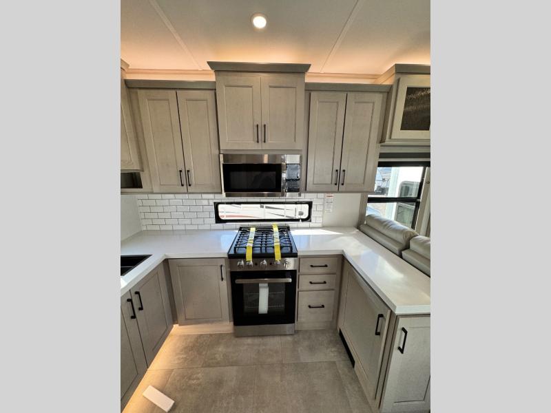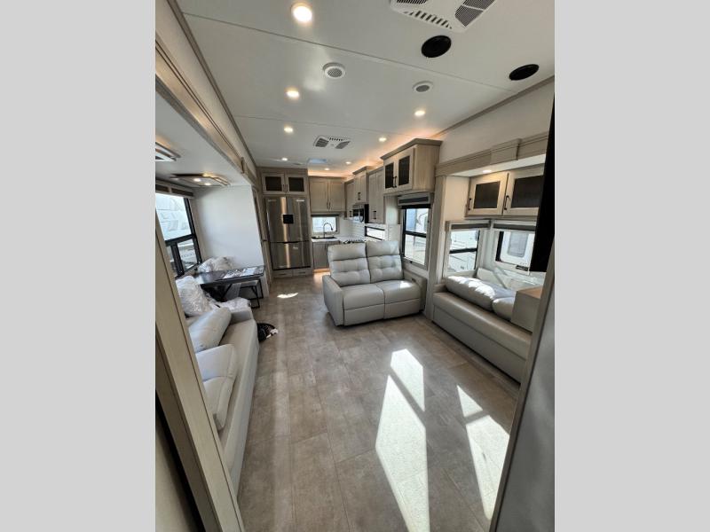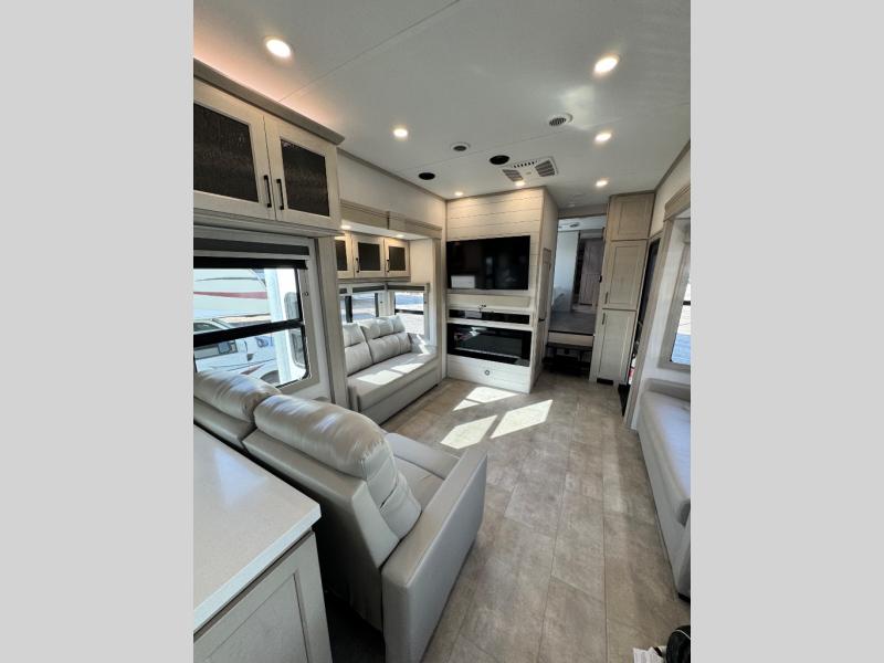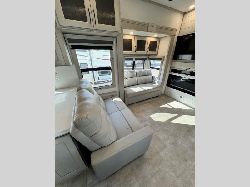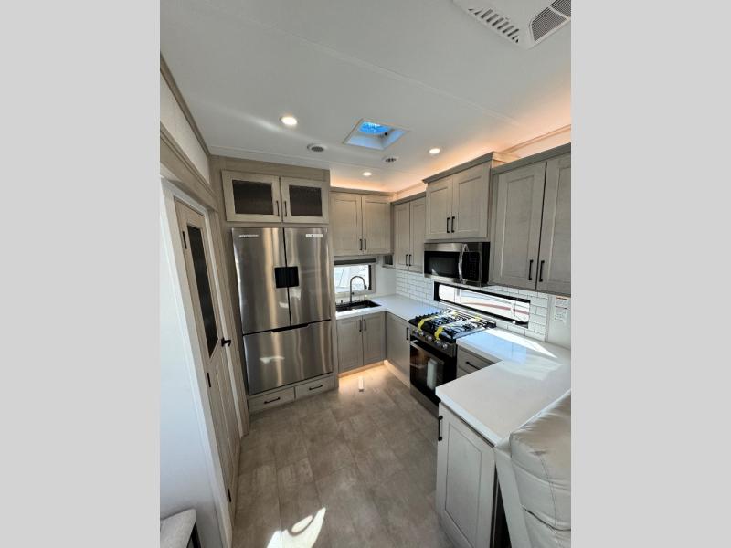Comfort will come easy in this four slide out fifth wheel! You will feel right at home with a master bedroom that includes a queen bed slide out with a king bed option, dual dressers with a seat in between, plus a large front bath with tons of space. The convenient half bath is right as you enter the unit for convenience. Your crew can get cozy on the dual tri-fold sofas within dual opposing slides, or on the theater seating across from the LED TV and fireplace. One feature you will love about this fifth wheel is the rear kitchen with wrap-around counter space, a built-in oven, plus a 20 cu. ft. 12V refrigerator and a large pantry to keep food fresh.