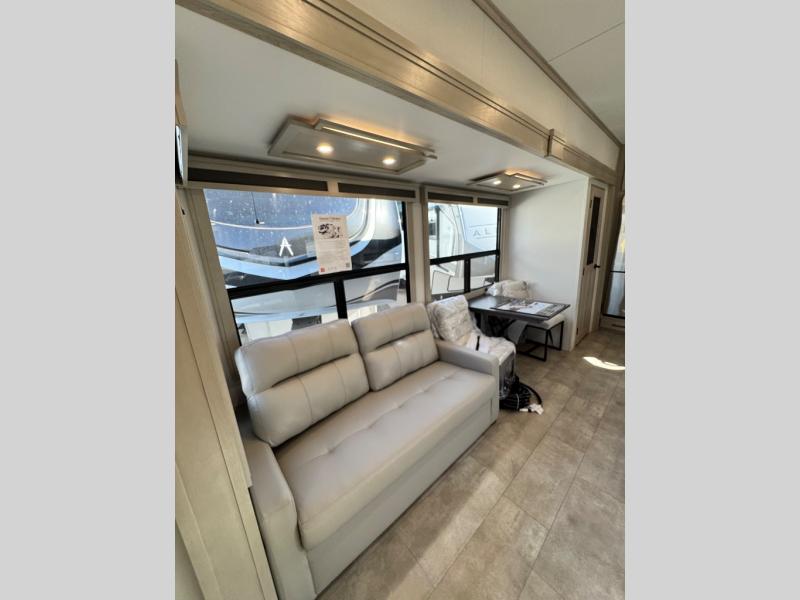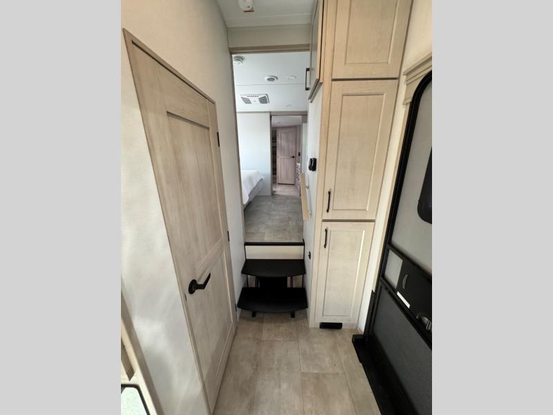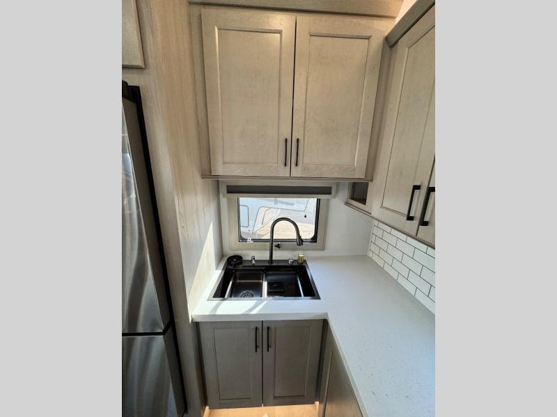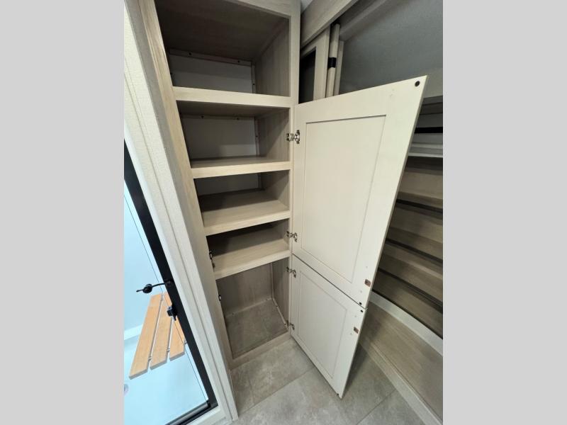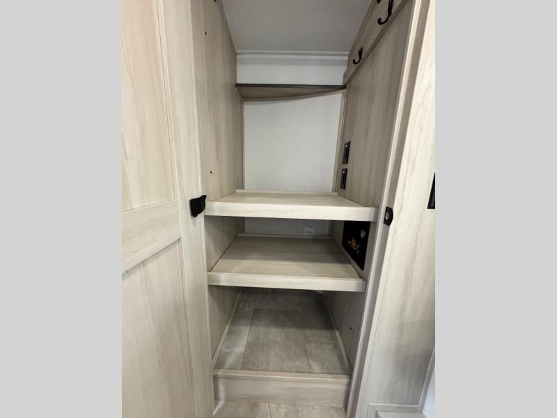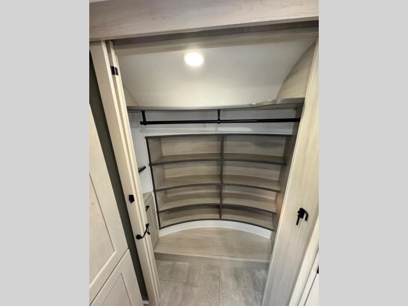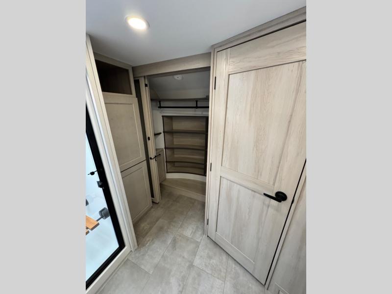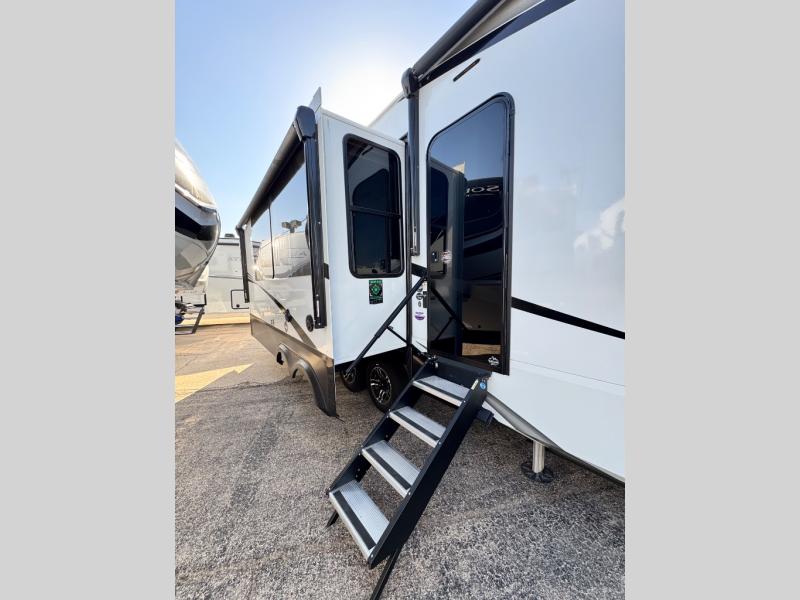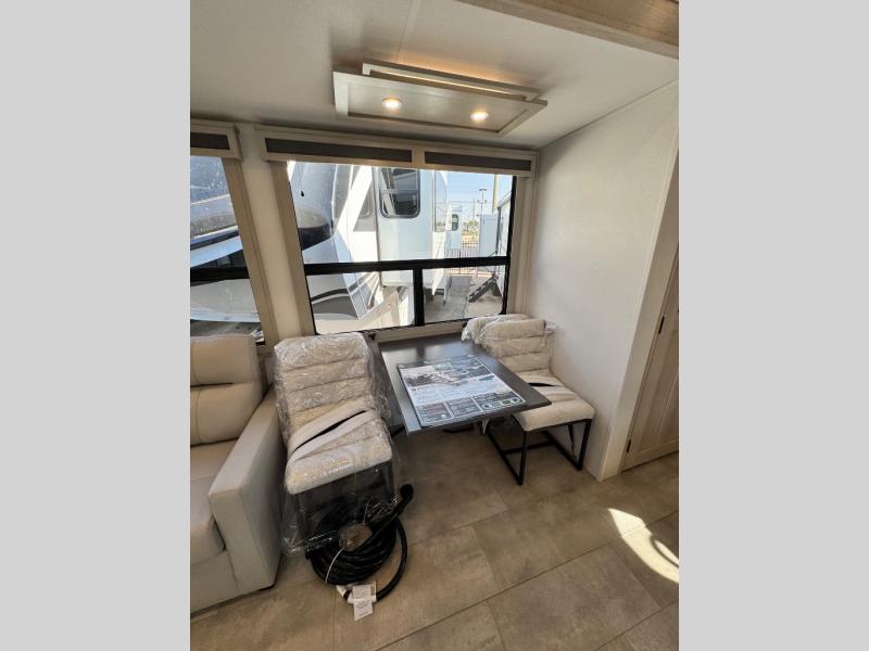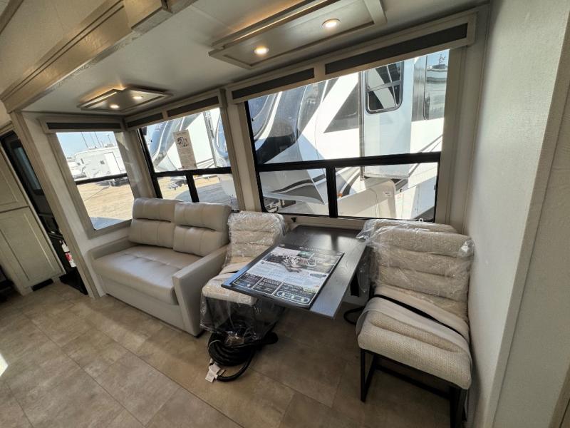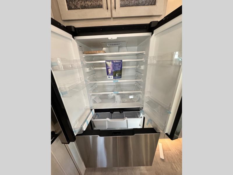 Comfort will come easy in this four slide out fifth wheel! You will feel right at home with a master bedroom that includes a queen bed slide out with a king bed option, dual dressers with a seat in between, plus a large front bath with tons of space. The convenient half bath is right as you enter the unit for convenience. Your crew can get cozy on the dual tri-fold sofas within dual opposing slides, or on the theater seating across from the LED TV and fireplace. One feature you will love about this fifth wheel is the rear kitchen with wrap-around counter space, a built-in oven, plus a 20 cu. ft. 12V refrigerator and a large pantry to keep food fresh.