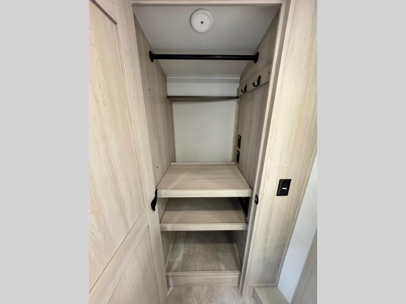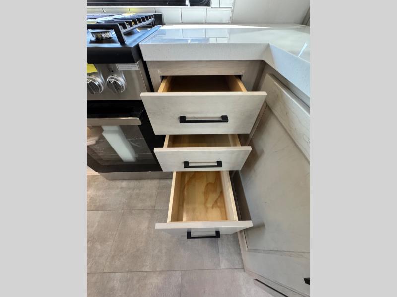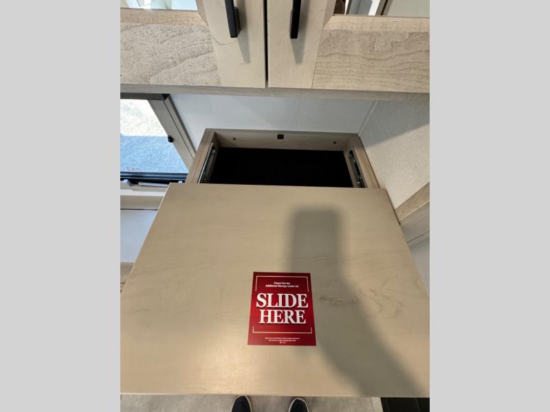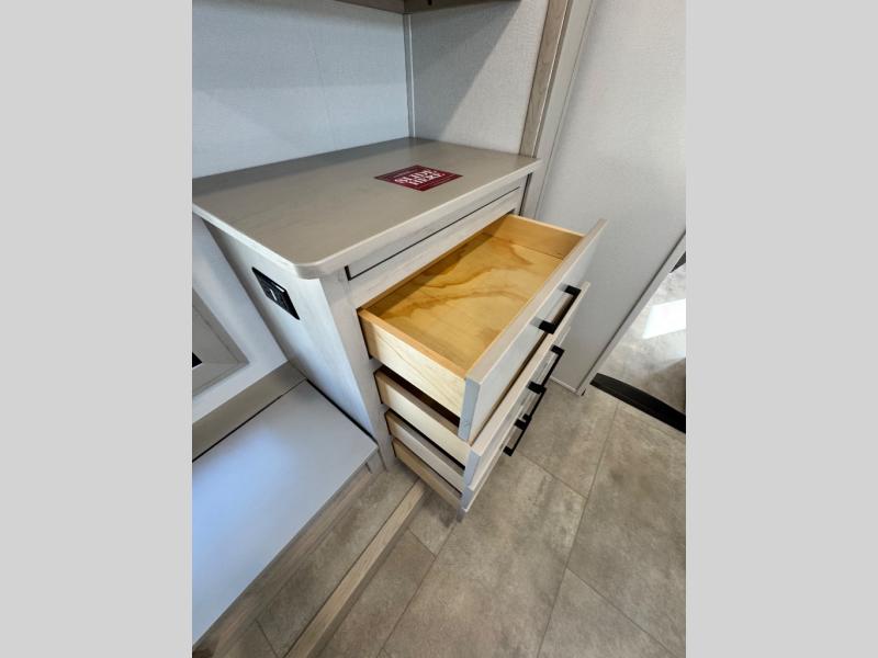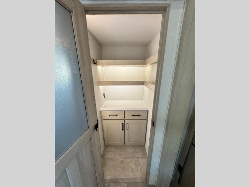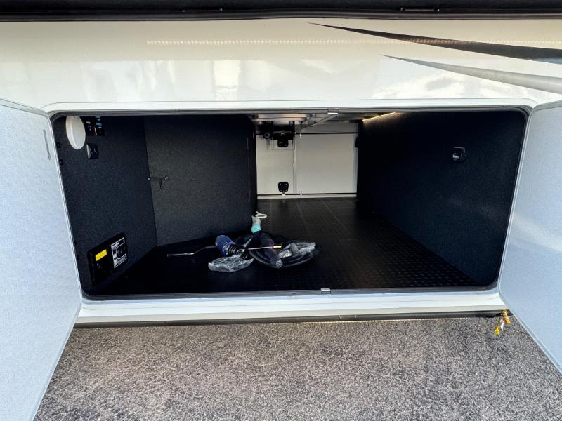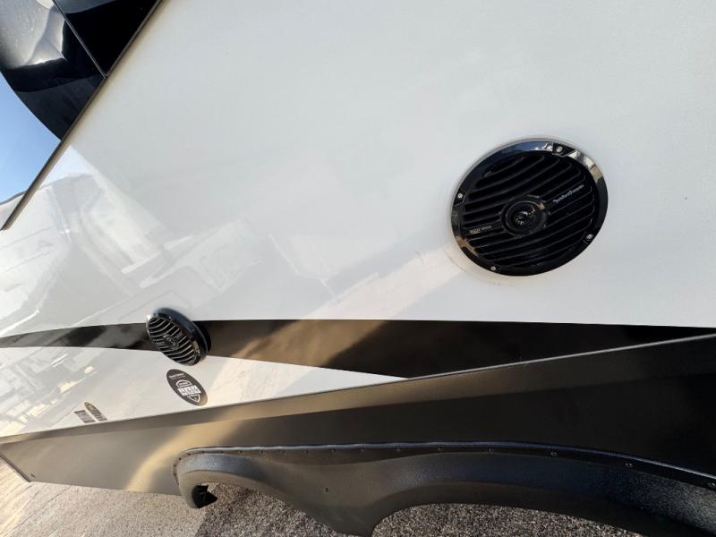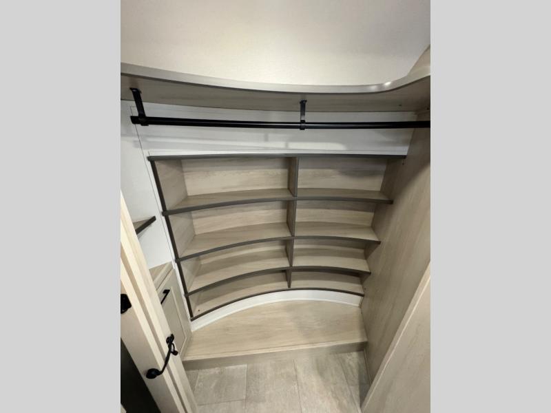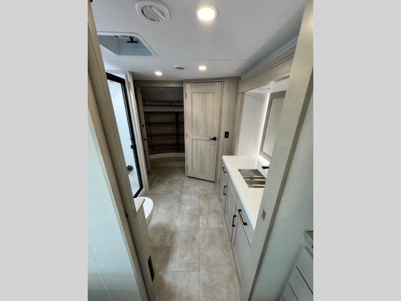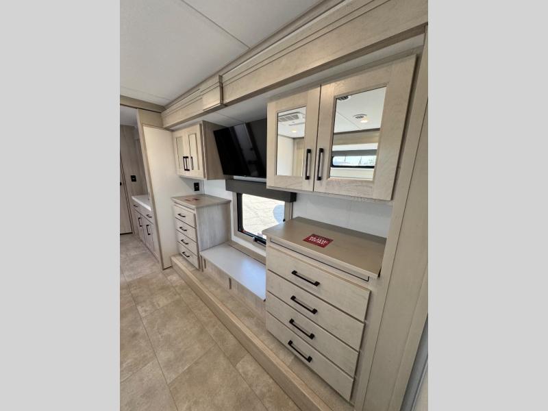 Comfort will come easy in this four slide out fifth wheel! You will feel right at home with a master bedroom that includes a queen bed slide out with a king bed option, dual dressers with a seat in between, plus a large front bath with tons of space. The convenient half bath is right as you enter the unit for convenience. Your crew can get cozy on the dual tri-fold sofas within dual opposing slides, or on the theater seating across from the LED TV and fireplace. One feature you will love about this fifth wheel is the rear kitchen with wrap-around counter space, a built-in oven, plus a 20 cu. ft. 12V refrigerator and a large pantry to keep food fresh.