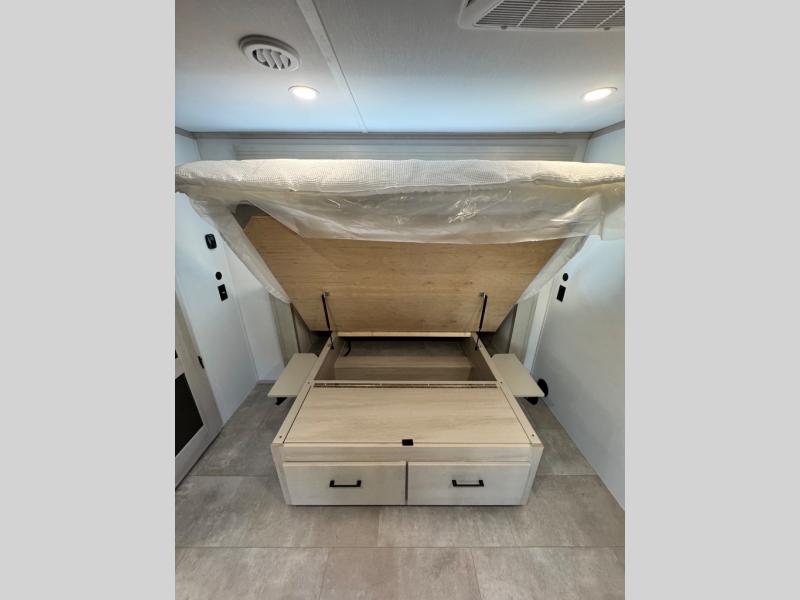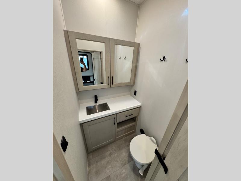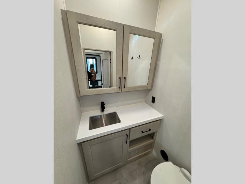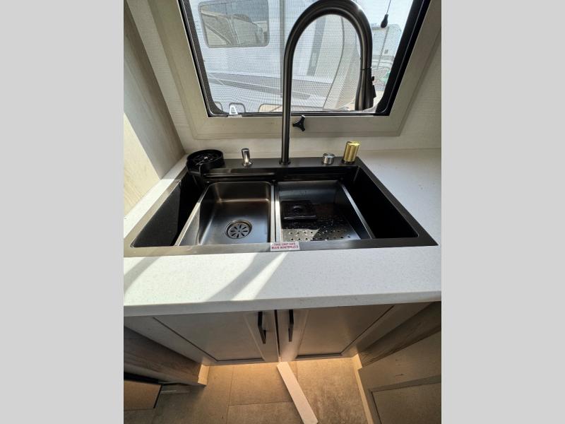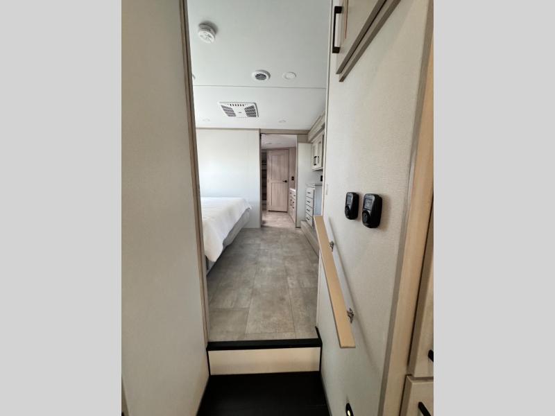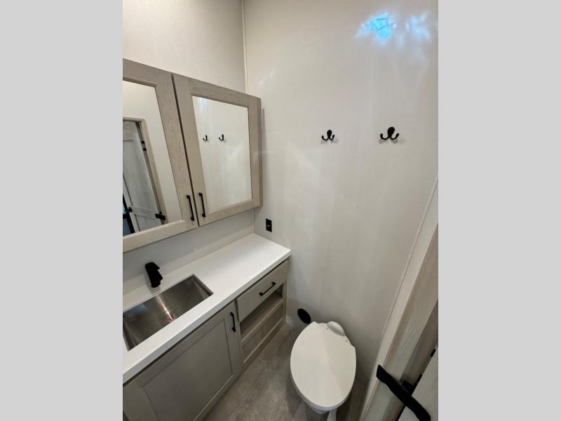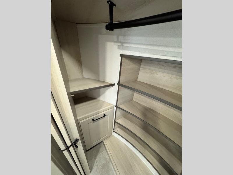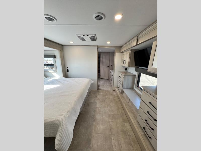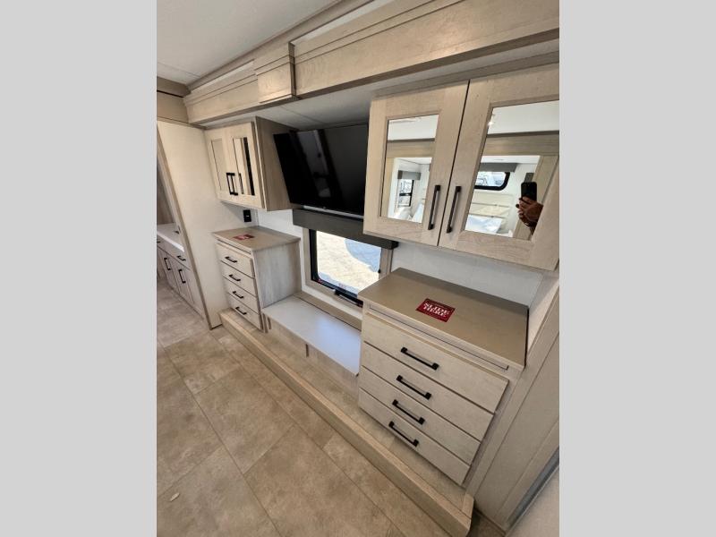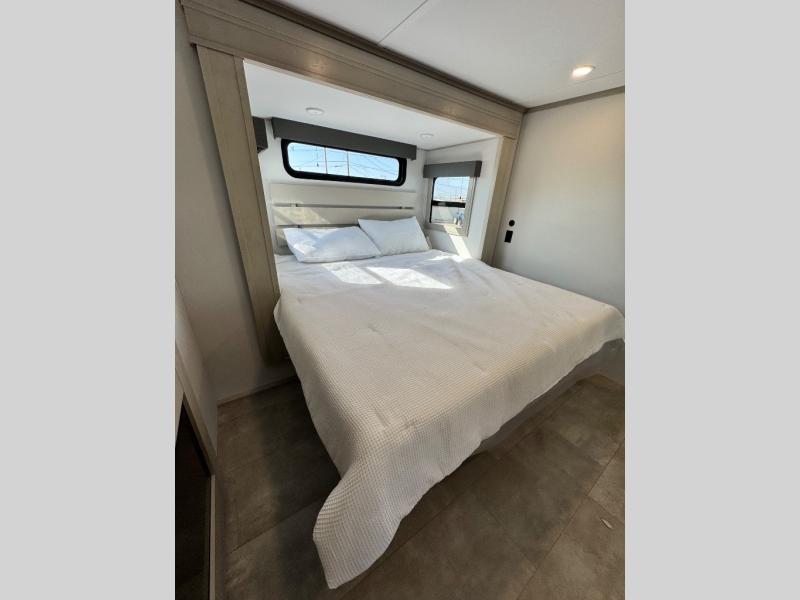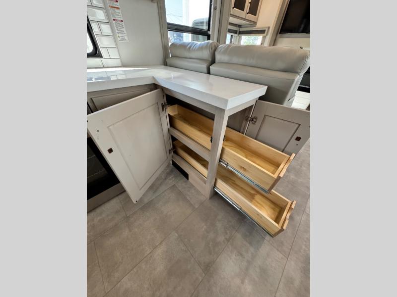 Comfort will come easy in this four slide out fifth wheel! You will feel right at home with a master bedroom that includes a queen bed slide out with a king bed option, dual dressers with a seat in between, plus a large front bath with tons of space. The convenient half bath is right as you enter the unit for convenience. Your crew can get cozy on the dual tri-fold sofas within dual opposing slides, or on the theater seating across from the LED TV and fireplace. One feature you will love about this fifth wheel is the rear kitchen with wrap-around counter space, a built-in oven, plus a 20 cu. ft. 12V refrigerator and a large pantry to keep food fresh.
