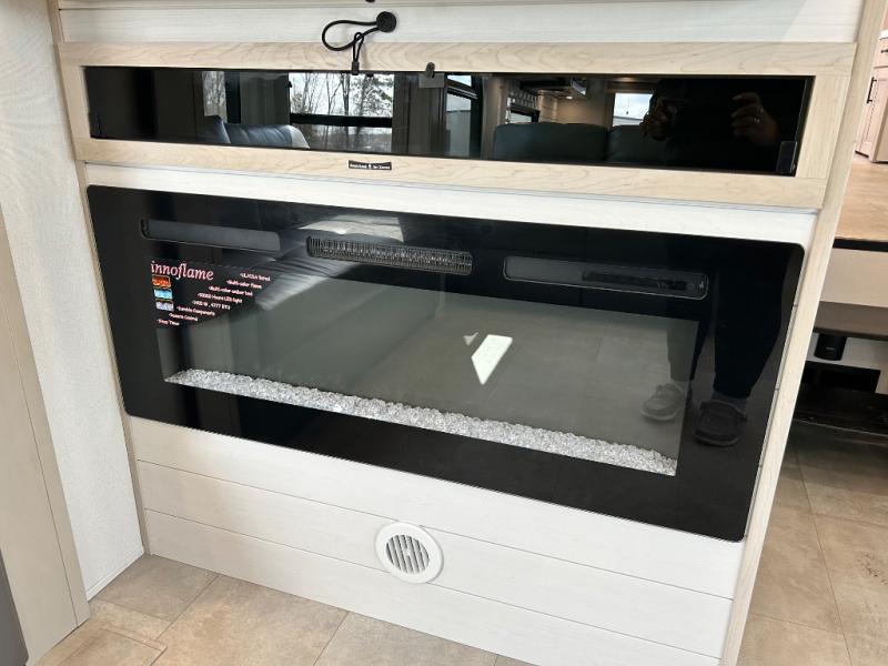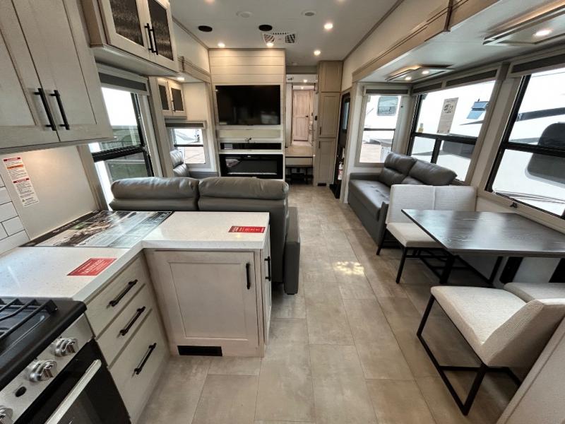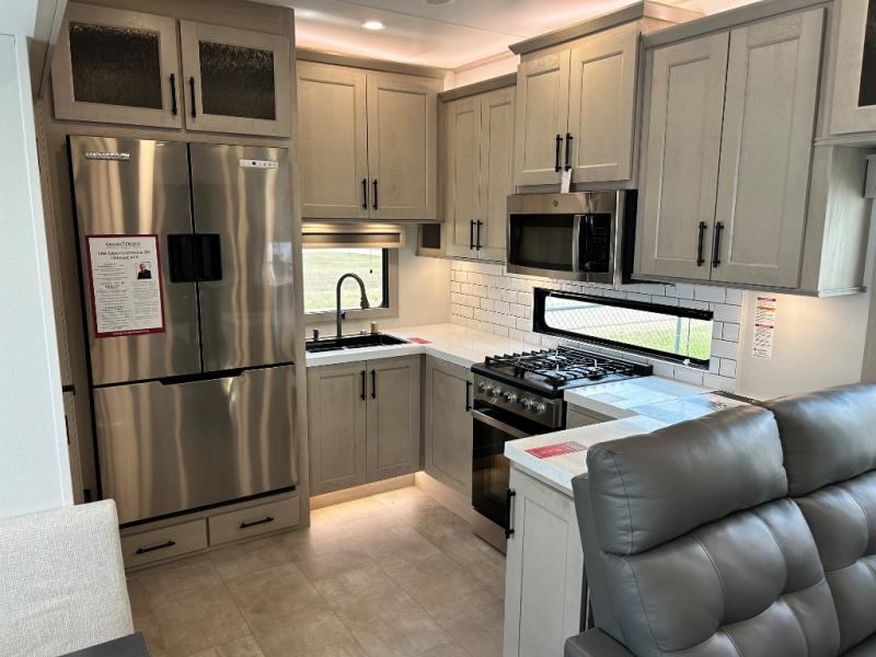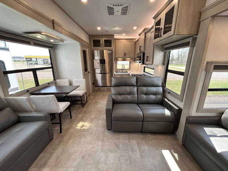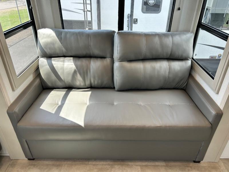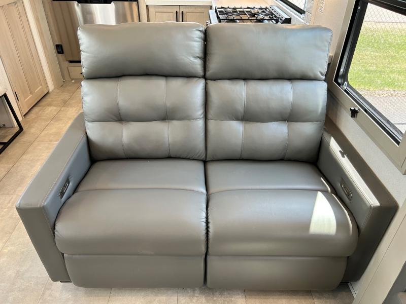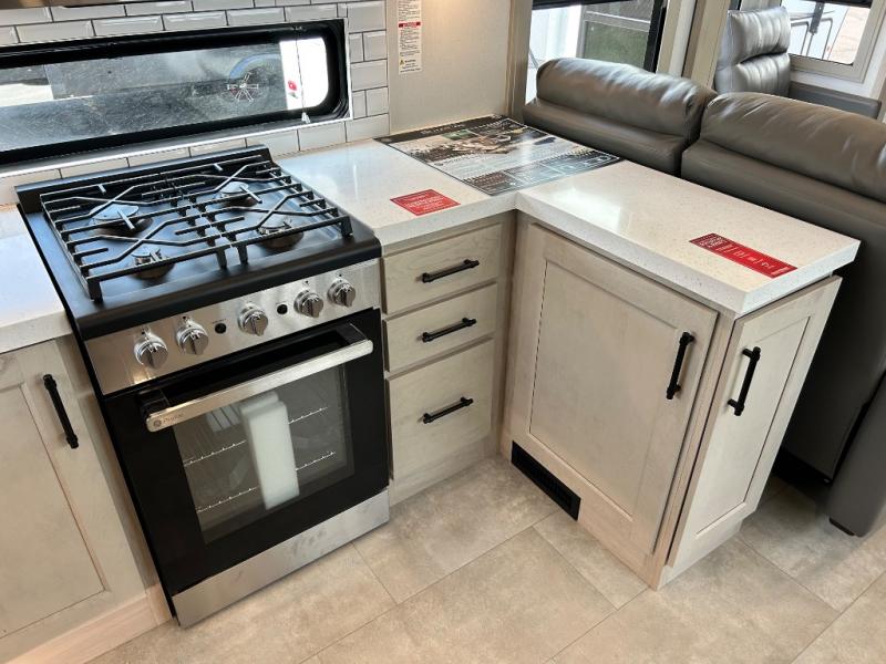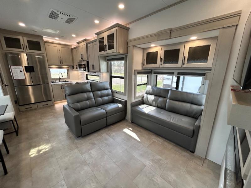 Comfort will come easy in this four slide out fifth wheel! You will feel right at home with a master bedroom that includes a queen bed slide out with a king bed option, dual dressers with a seat in between, plus a large front bath with tons of space. The convenient half bath is right as you enter the unit for convenience. Your crew can get cozy on the dual tri-fold sofas within dual opposing slides, or on the theater seating across from the LED TV and fireplace. One feature you will love about this fifth wheel is the rear kitchen with wrap-around counter space, a built-in oven, plus a 20 cu. ft. 12V refrigerator and a large pantry to keep food fresh.