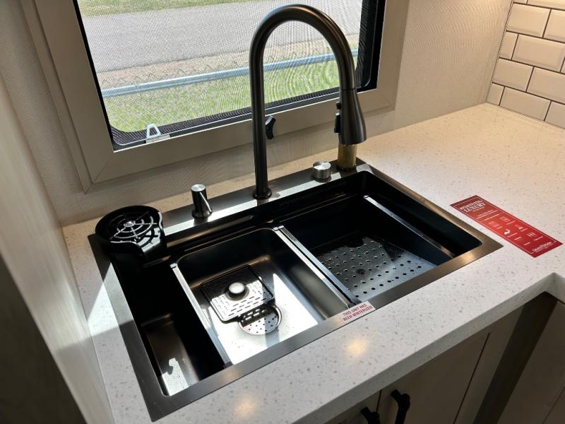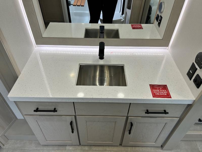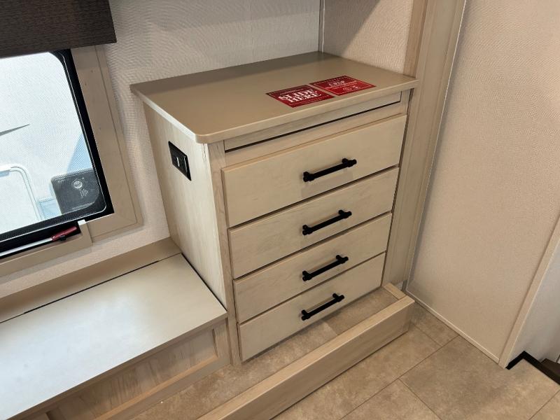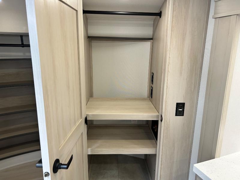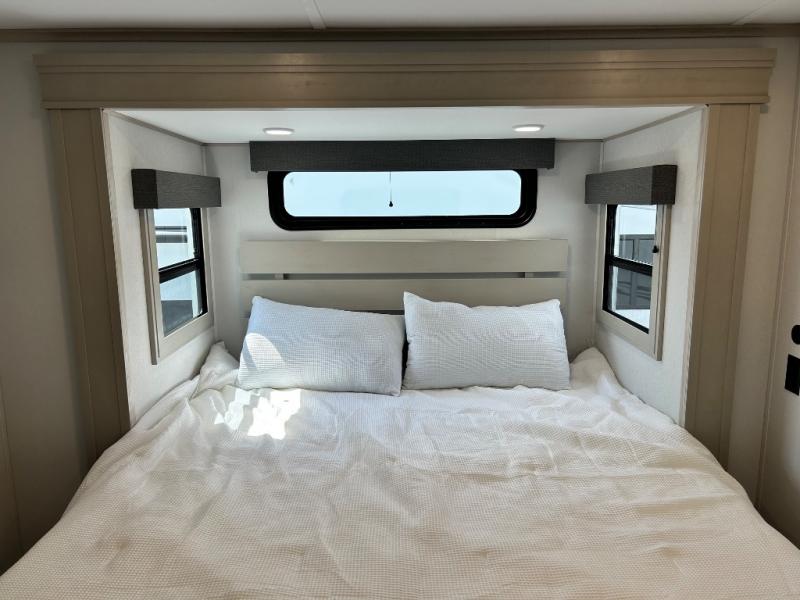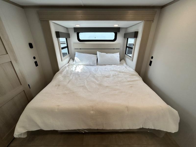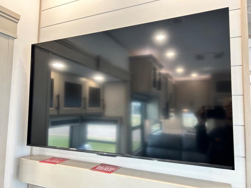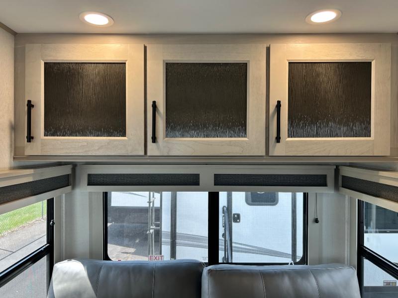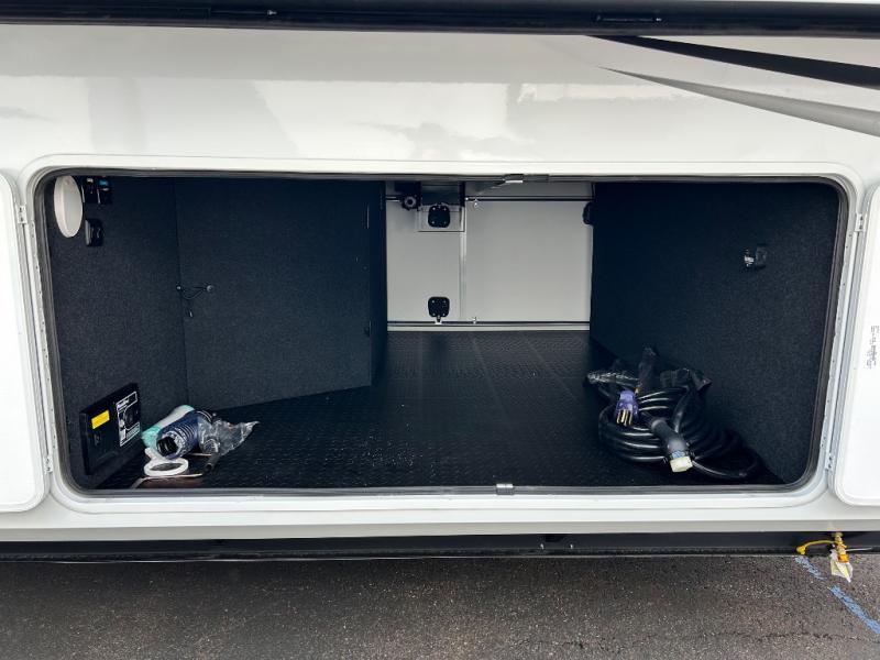 Comfort will come easy in this four slide out fifth wheel! You will feel right at home with a master bedroom that includes a queen bed slide out with a king bed option, dual dressers with a seat in between, plus a large front bath with tons of space. The convenient half bath is right as you enter the unit for convenience. Your crew can get cozy on the dual tri-fold sofas within dual opposing slides, or on the theater seating across from the LED TV and fireplace. One feature you will love about this fifth wheel is the rear kitchen with wrap-around counter space, a built-in oven, plus a 20 cu. ft. 12V refrigerator and a large pantry to keep food fresh.
