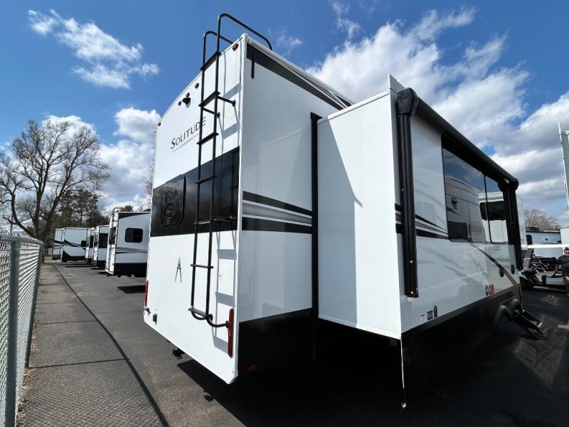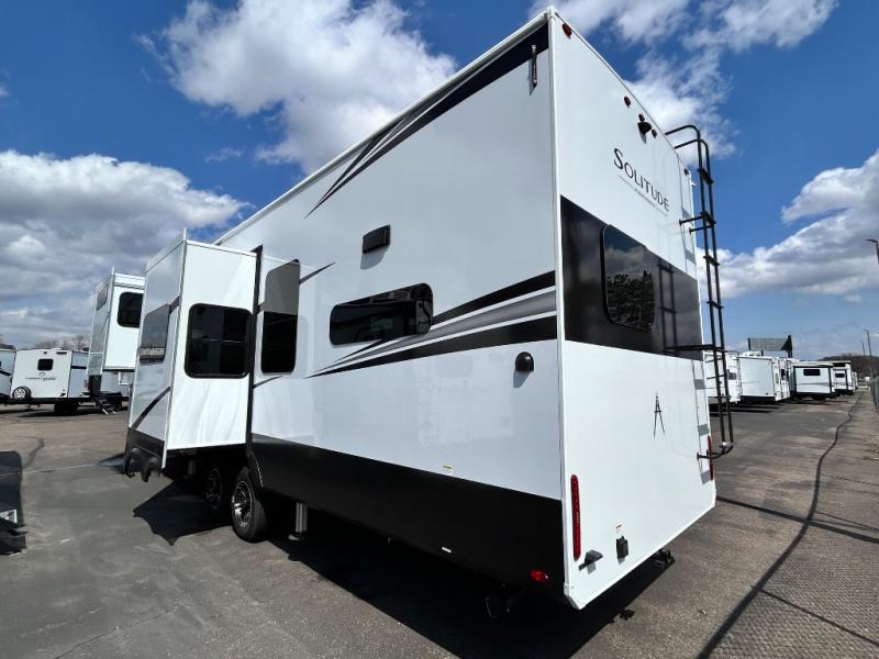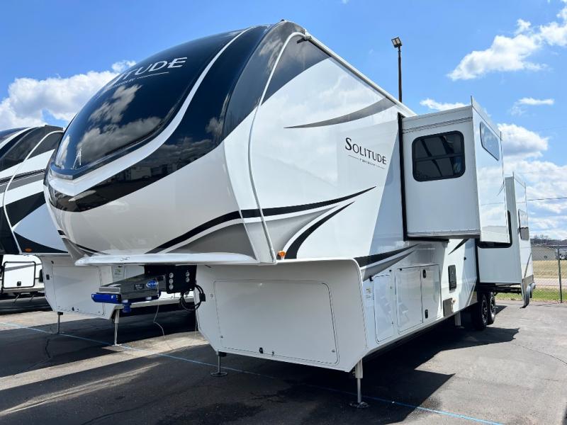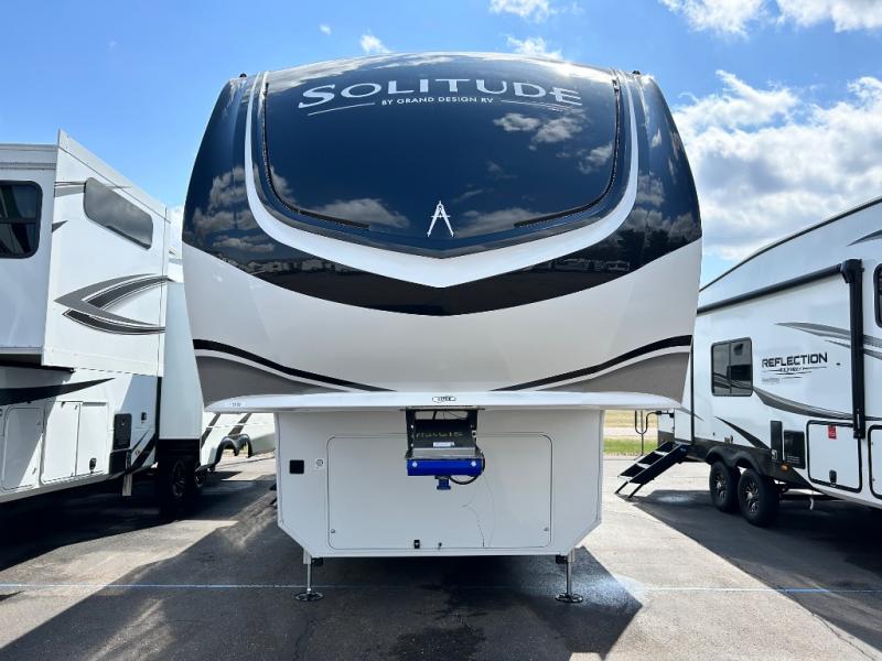 Each Solitude fifth wheel by Grand Design features a 101" wide-body construction, heavy duty 8,000 lb. axles, frameless tinted windows, and high-gloss gel coat sidewalls. You can camp year around thanks to the Weather-Tek Package that includes a 35K BTU high-capacity furnace, an all-in-one enclosed and heated utility center, and a fully enclosed underbelly with heated tanks and storage. Inside, you'll love the premium roller shades, hardwood cabinet doors, solid surface countertops, plus residential finishes throughout to make you truly feel at home. Each model also includes a MORryde CRE3000 suspension system, self adjusting brakes, and a MORryde pin box that will provide smooth towing from home to campground. Affordable luxury is possible with the Solitude fifth wheels; choose yours today!