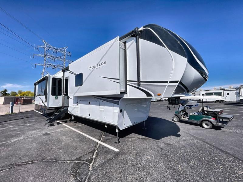 Each Solitude fifth wheel by Grand Design features a 101" wide-body construction, heavy duty 8,000 lb. axles, frameless tinted windows, and high-gloss gel coat sidewalls. You can camp year around thanks to the Weather-Tek Package that includes a 35K BTU high-capacity furnace, an all-in-one enclosed and heated utility center, and a fully enclosed underbelly with heated tanks and storage. Inside, you'll love the premium roller shades, hardwood cabinet doors, solid surface countertops, plus residential finishes throughout to make you truly feel at home. Each model also includes a MORryde CRE3000 suspension system, self adjusting brakes, and a MORryde pin box that will provide smooth towing from home to campground. Affordable luxury is possible with the Solitude fifth wheels; choose yours today!