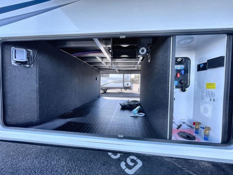 Comfort will come easy in this four slide out fifth wheel! You will feel right at home with a master bedroom that includes a queen bed slide out with a king bed option, dual dressers with a seat in between, plus a large front bath with tons of space. The convenient half bath is right as you enter the unit for convenience. Your crew can get cozy on the dual tri-fold sofas within dual opposing slides, or on the theater seating across from the LED TV and fireplace. One feature you will love about this fifth wheel is the rear kitchen with wrap-around counter space, a built-in oven, plus a 20 cu. ft. 12V refrigerator and a large pantry to keep food fresh.