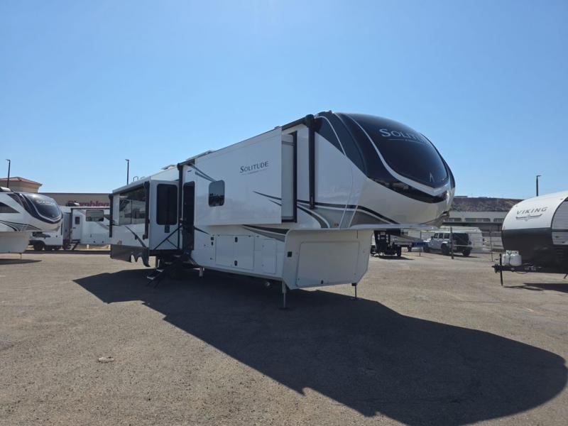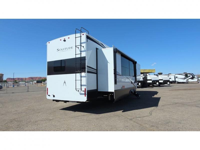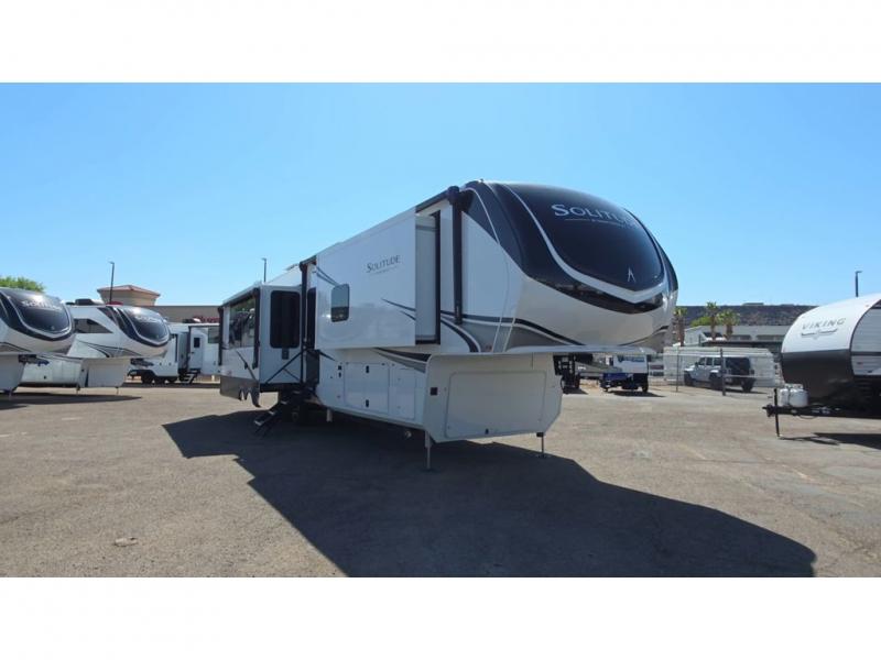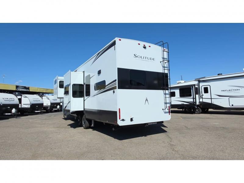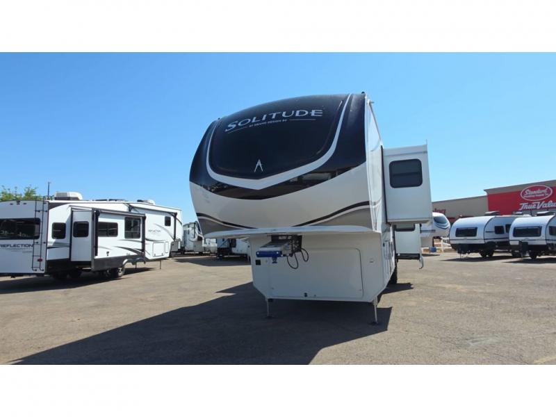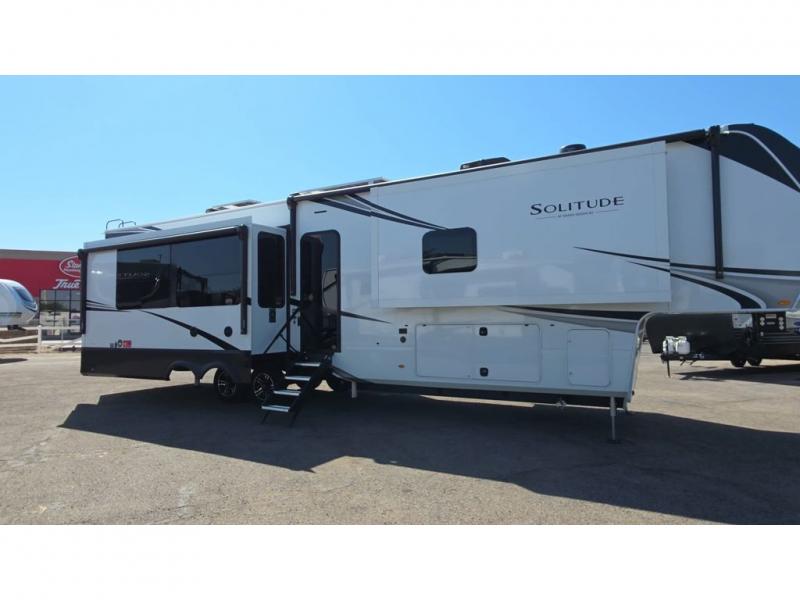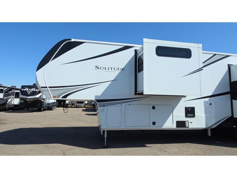Each Solitude fifth wheel by Grand Design features a 101" wide-body construction, heavy duty 8,000 lb. axles, frameless tinted windows, and high-gloss gel coat sidewalls. You can camp year around thanks to the Weather-Tek Package that includes a 35K BTU high-capacity furnace, an all-in-one enclosed and heated utility center, and a fully enclosed underbelly with heated tanks and storage. Inside, you'll love the premium roller shades, hardwood cabinet doors, solid surface countertops, plus residential finishes throughout to make you truly feel at home. Each model also includes a MORryde CRE3000 suspension system, self adjusting brakes, and a MORryde pin box that will provide smooth towing from home to campground. Affordable luxury is possible with the Solitude fifth wheels; choose yours today!
