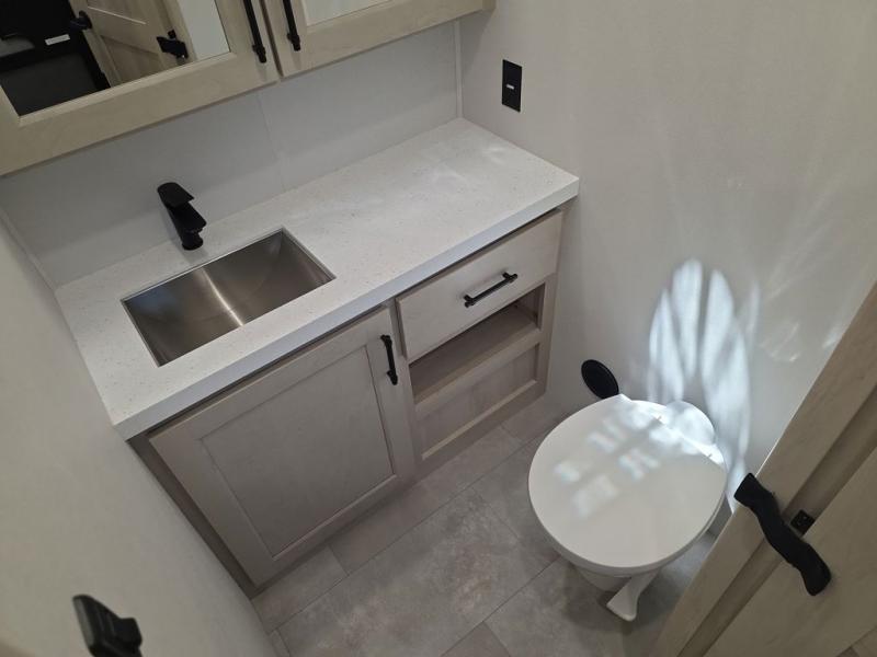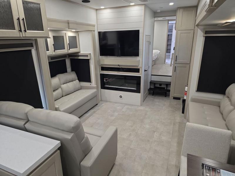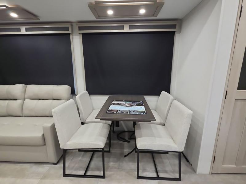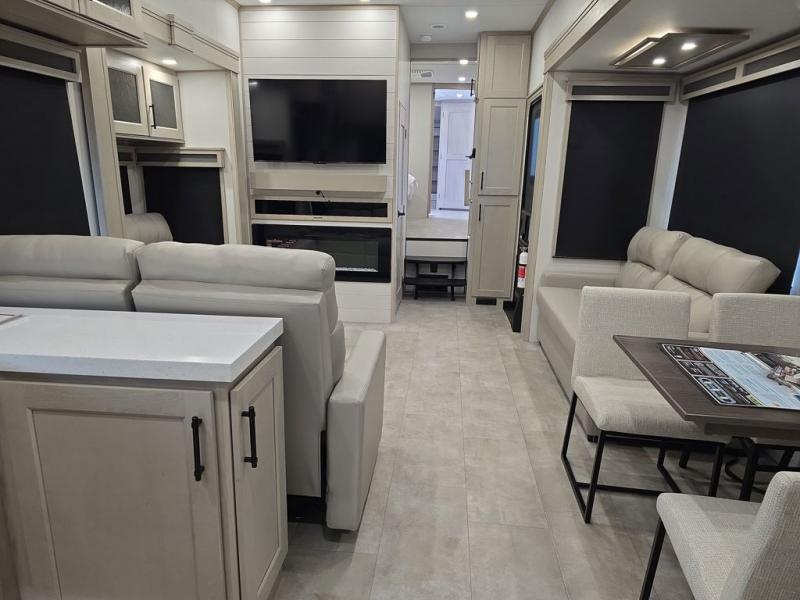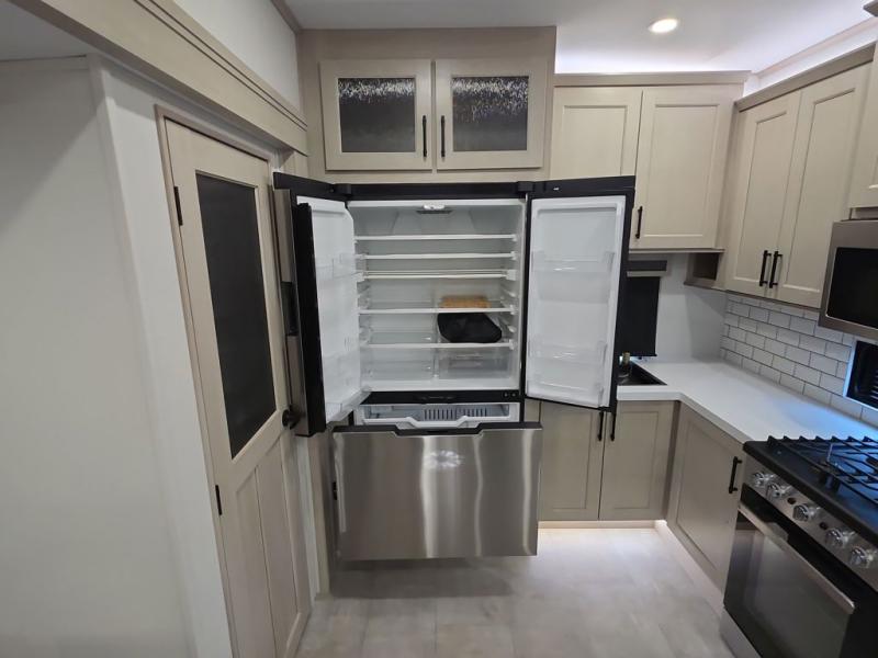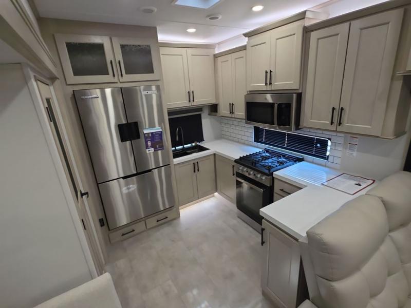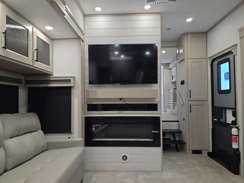 Comfort will come easy in this four slide out fifth wheel! You will feel right at home with a master bedroom that includes a queen bed slide out with a king bed option, dual dressers with a seat in between, plus a large front bath with tons of space. The convenient half bath is right as you enter the unit for convenience. Your crew can get cozy on the dual tri-fold sofas within dual opposing slides, or on the theater seating across from the LED TV and fireplace. One feature you will love about this fifth wheel is the rear kitchen with wrap-around counter space, a built-in oven, plus a 20 cu. ft. 12V refrigerator and a large pantry to keep food fresh.