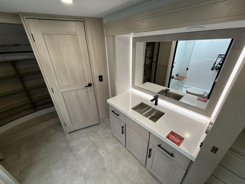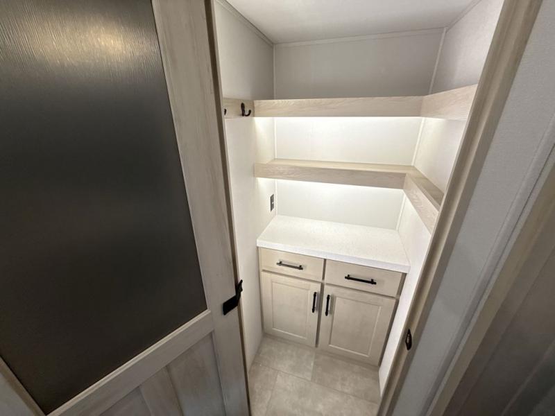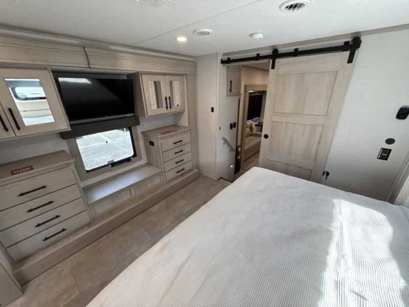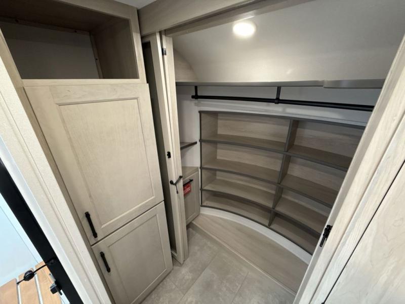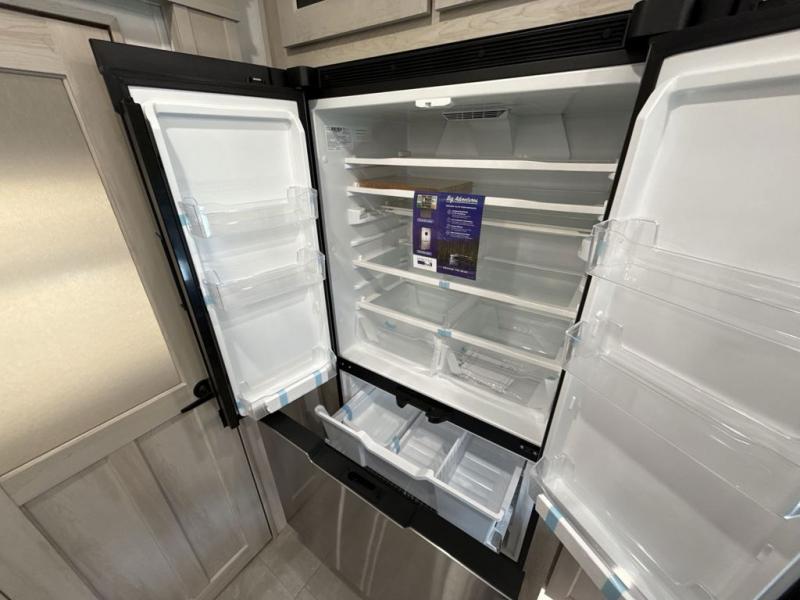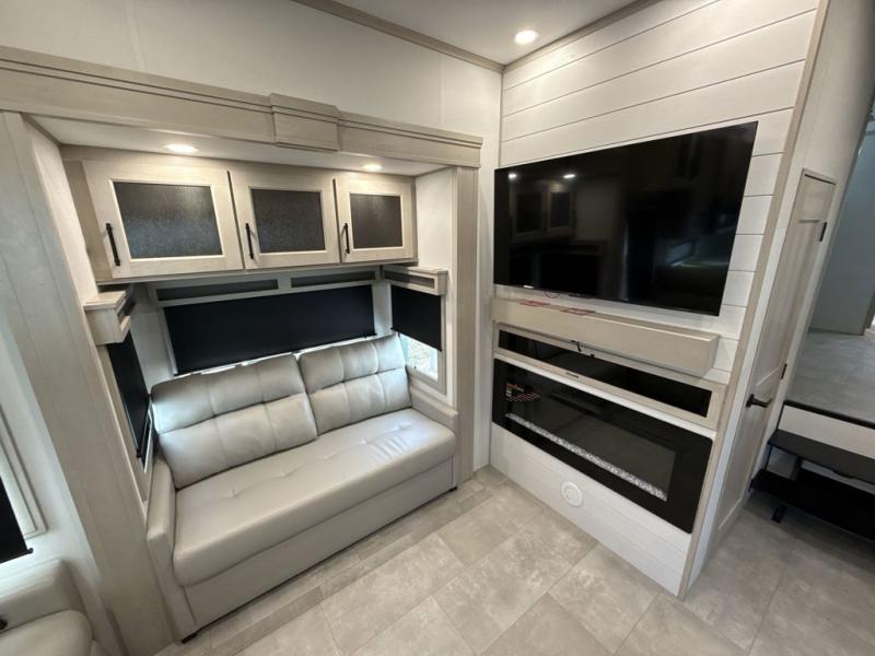 Comfort will come easy in this four slide out fifth wheel! You will feel right at home with a master bedroom that includes a queen bed slide out with a king bed option, dual dressers with a seat in between, plus a large front bath with tons of space. The convenient half bath is right as you enter the unit for convenience. Your crew can get cozy on the dual tri-fold sofas within dual opposing slides, or on the theater seating across from the LED TV and fireplace. One feature you will love about this fifth wheel is the rear kitchen with wrap-around counter space, a built-in oven, plus a 20 cu. ft. 12V refrigerator and a large pantry to keep food fresh.