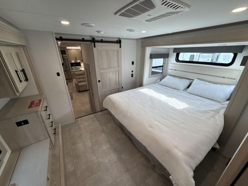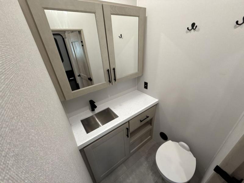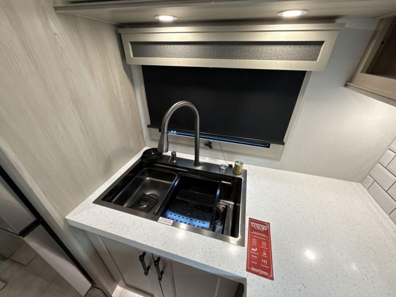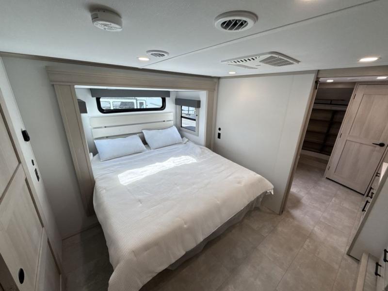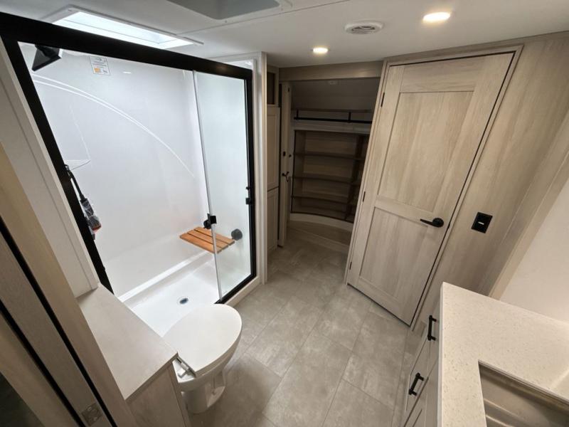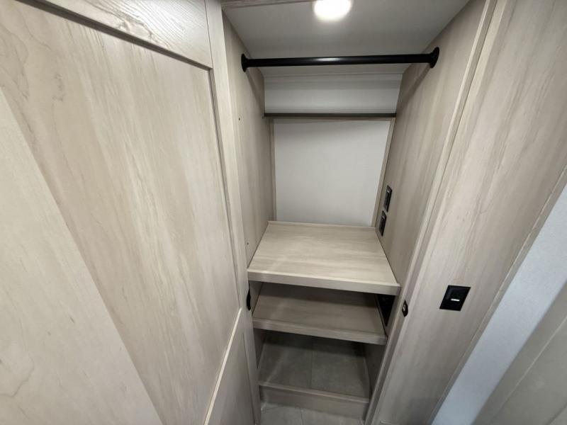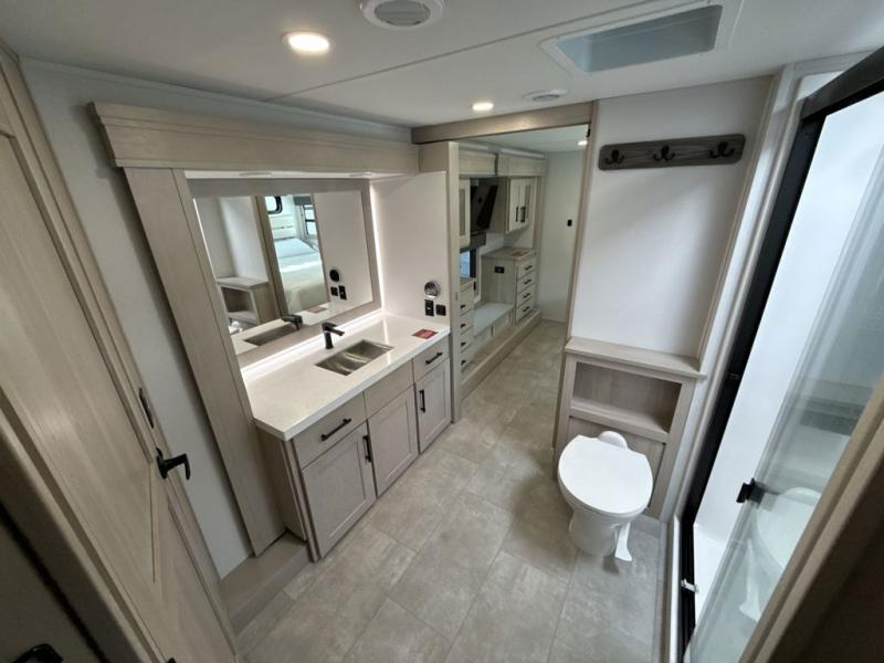 Comfort will come easy in this four slide out fifth wheel! You will feel right at home with a master bedroom that includes a queen bed slide out with a king bed option, dual dressers with a seat in between, plus a large front bath with tons of space. The convenient half bath is right as you enter the unit for convenience. Your crew can get cozy on the dual tri-fold sofas within dual opposing slides, or on the theater seating across from the LED TV and fireplace. One feature you will love about this fifth wheel is the rear kitchen with wrap-around counter space, a built-in oven, plus a 20 cu. ft. 12V refrigerator and a large pantry to keep food fresh.