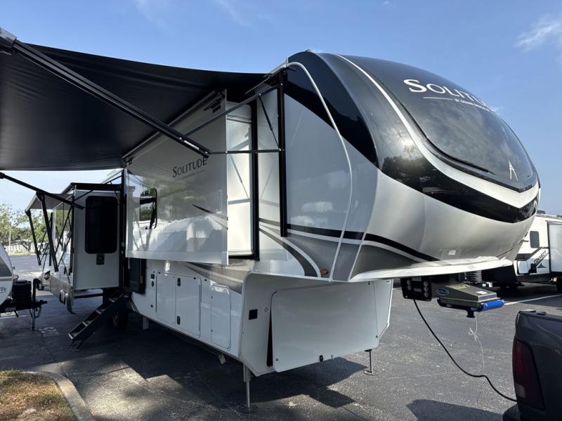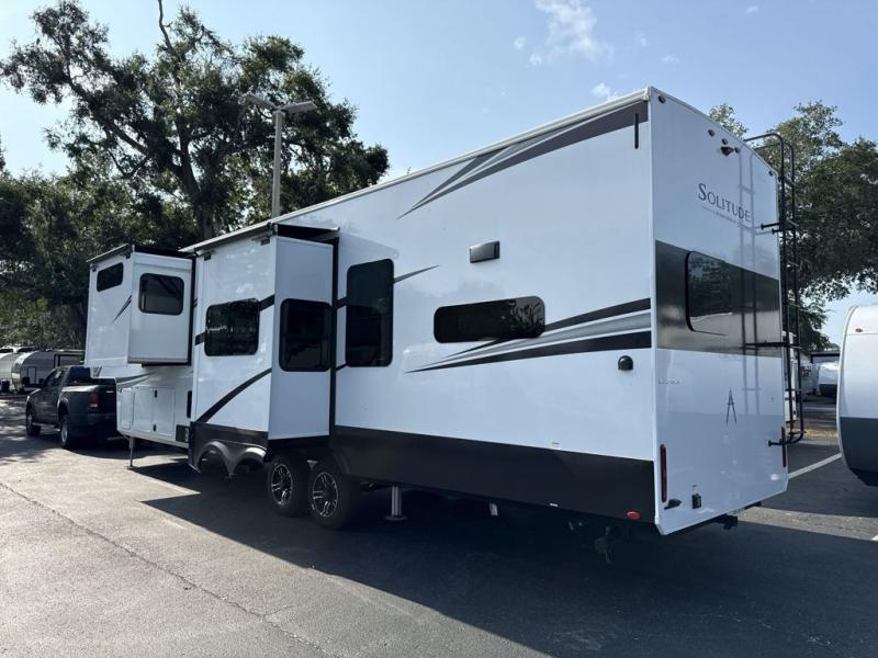 Each Solitude fifth wheel by Grand Design features a 101" wide-body construction, heavy duty 8,000 lb. axles, frameless tinted windows, and high-gloss gel coat sidewalls. You can camp year around thanks to the Weather-Tek Package that includes a 35K BTU high-capacity furnace, an all-in-one enclosed and heated utility center, and a fully enclosed underbelly with heated tanks and storage. Inside, you'll love the premium roller shades, hardwood cabinet doors, solid surface countertops, plus residential finishes throughout to make you truly feel at home. Each model also includes a MORryde CRE3000 suspension system, self adjusting brakes, and a MORryde pin box that will provide smooth towing from home to campground. Affordable luxury is possible with the Solitude fifth wheels; choose yours today!
