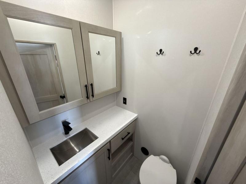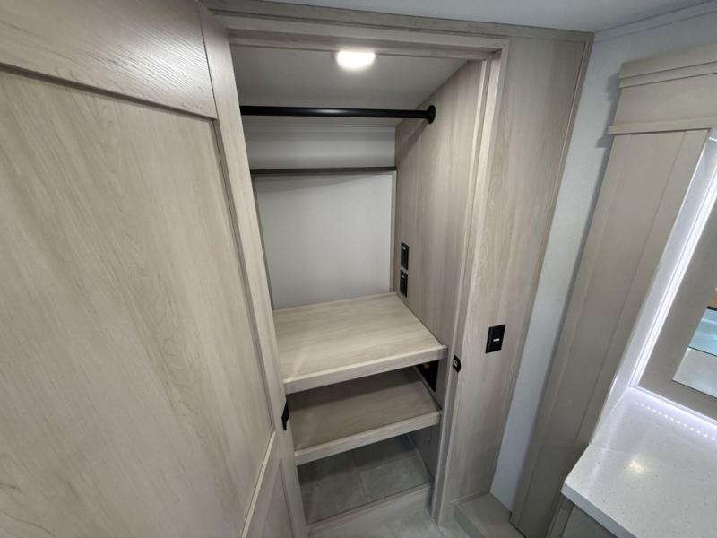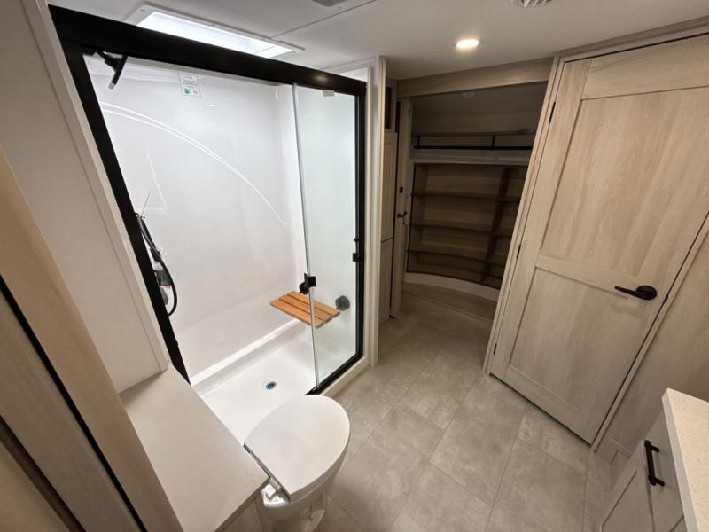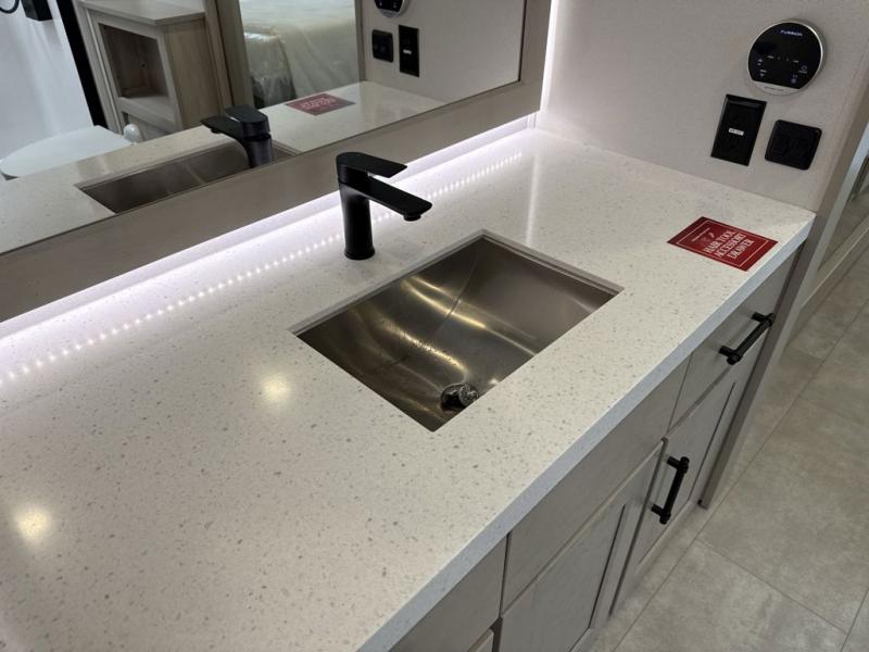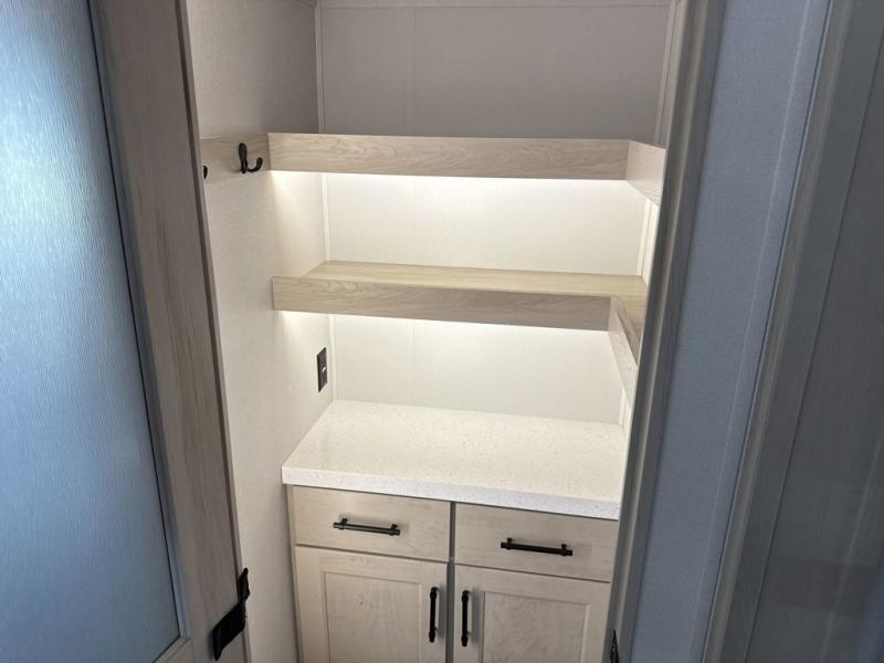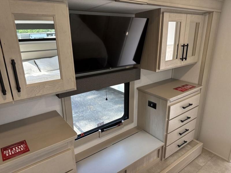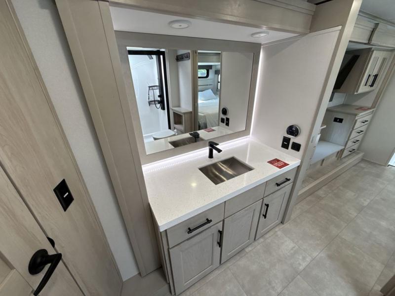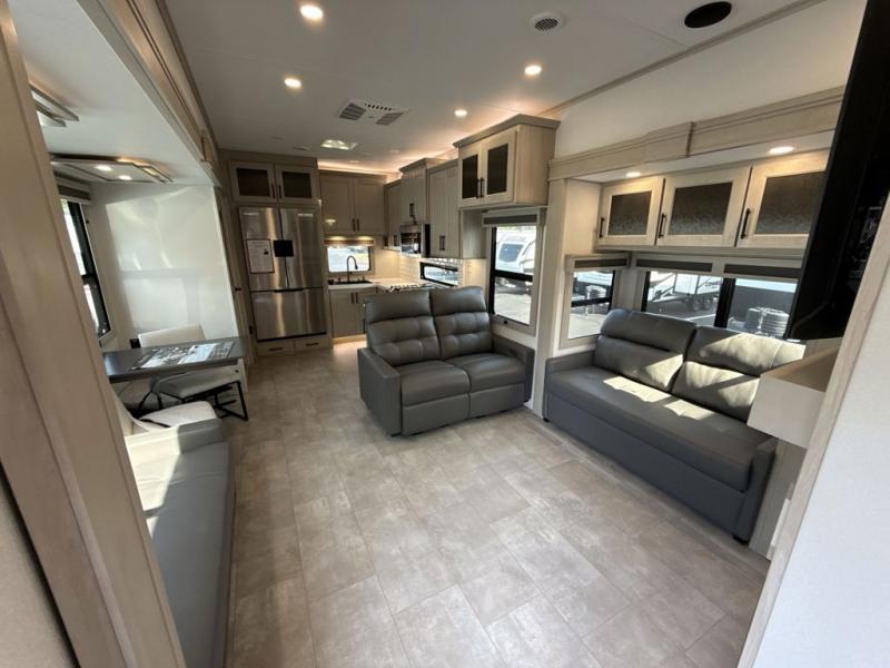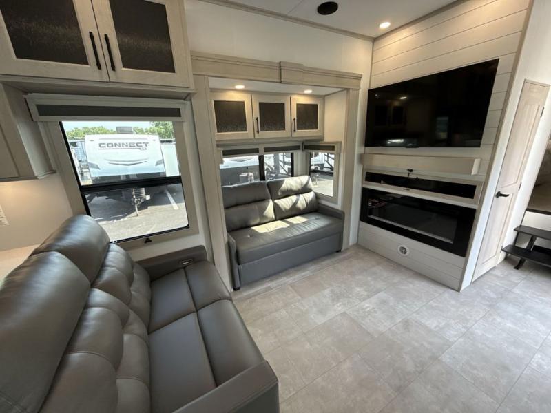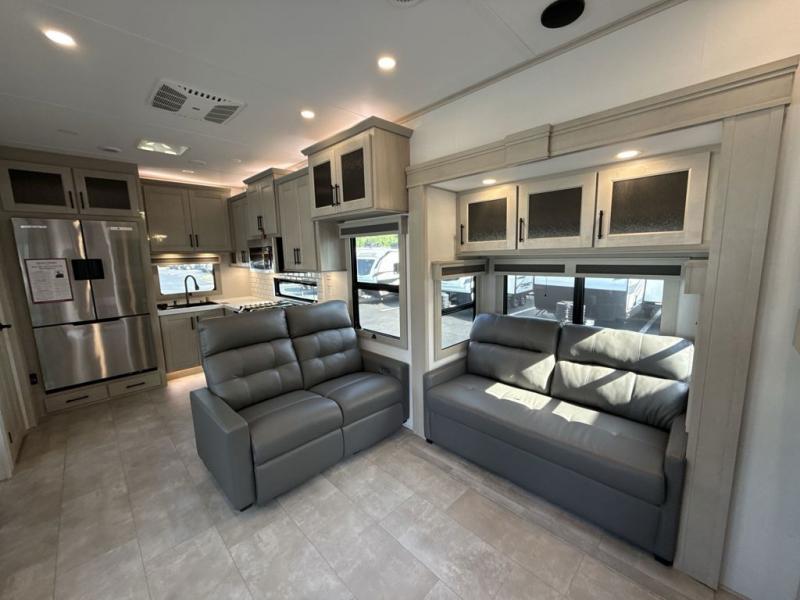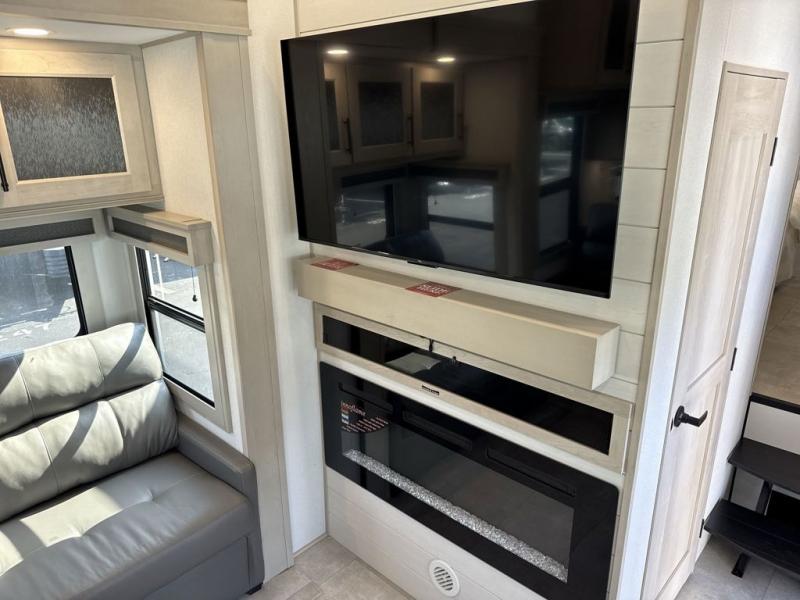 Comfort will come easy in this four slide out fifth wheel! You will feel right at home with a master bedroom that includes a queen bed slide out with a king bed option, dual dressers with a seat in between, plus a large front bath with tons of space. The convenient half bath is right as you enter the unit for convenience. Your crew can get cozy on the dual tri-fold sofas within dual opposing slides, or on the theater seating across from the LED TV and fireplace. One feature you will love about this fifth wheel is the rear kitchen with wrap-around counter space, a built-in oven, plus a 20 cu. ft. 12V refrigerator and a large pantry to keep food fresh.